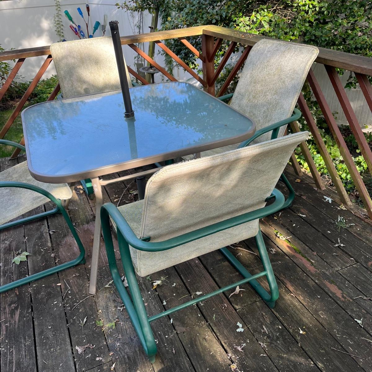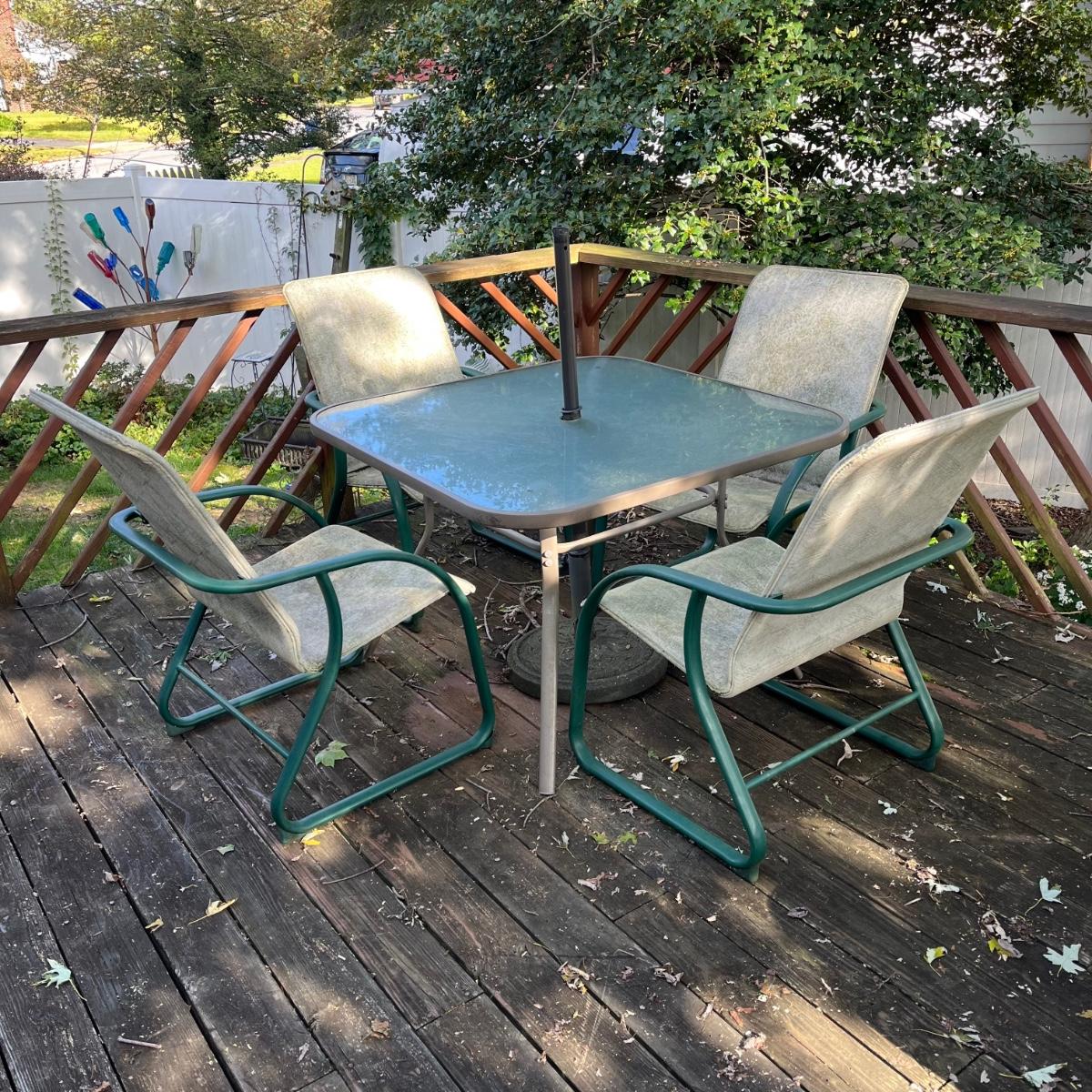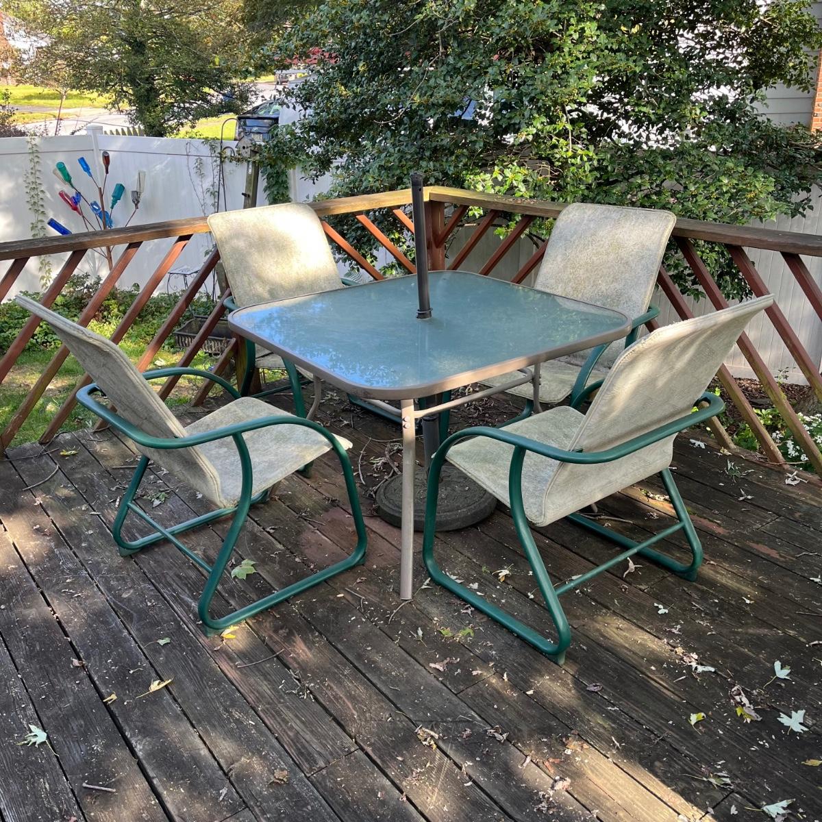 LOT 73P: Patio Furniture - Deck Table, Chairs and Umbrella Stand