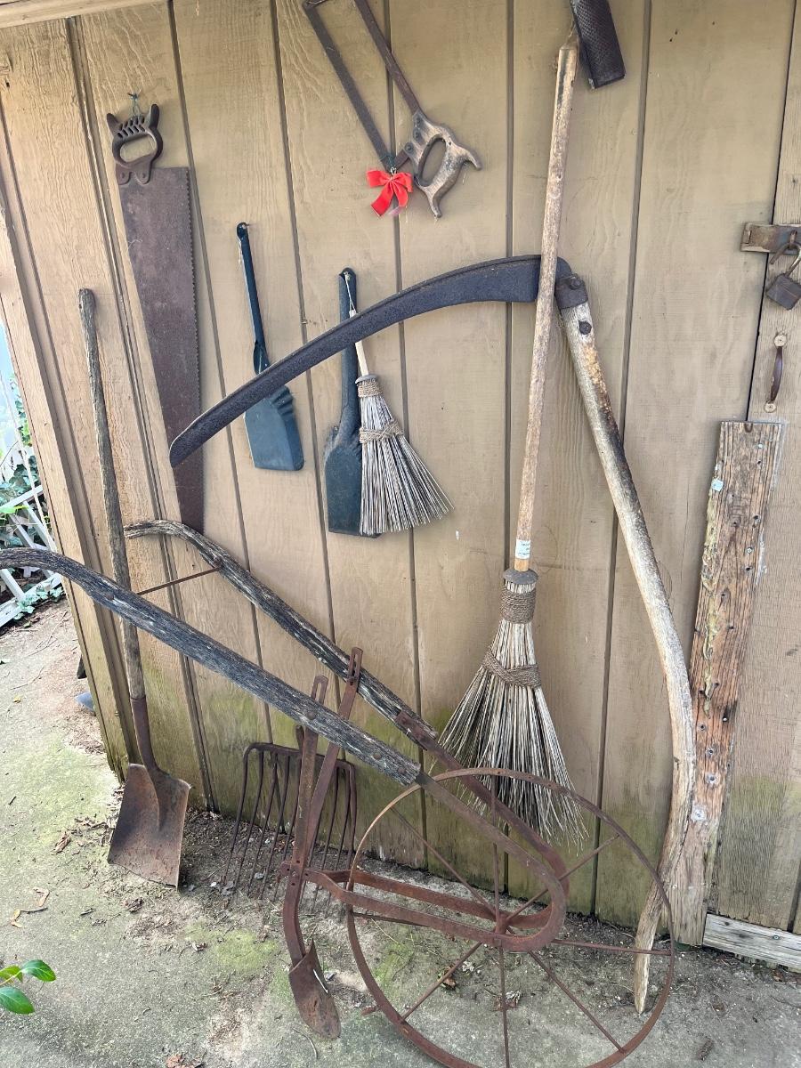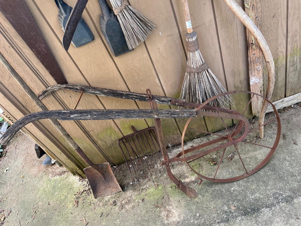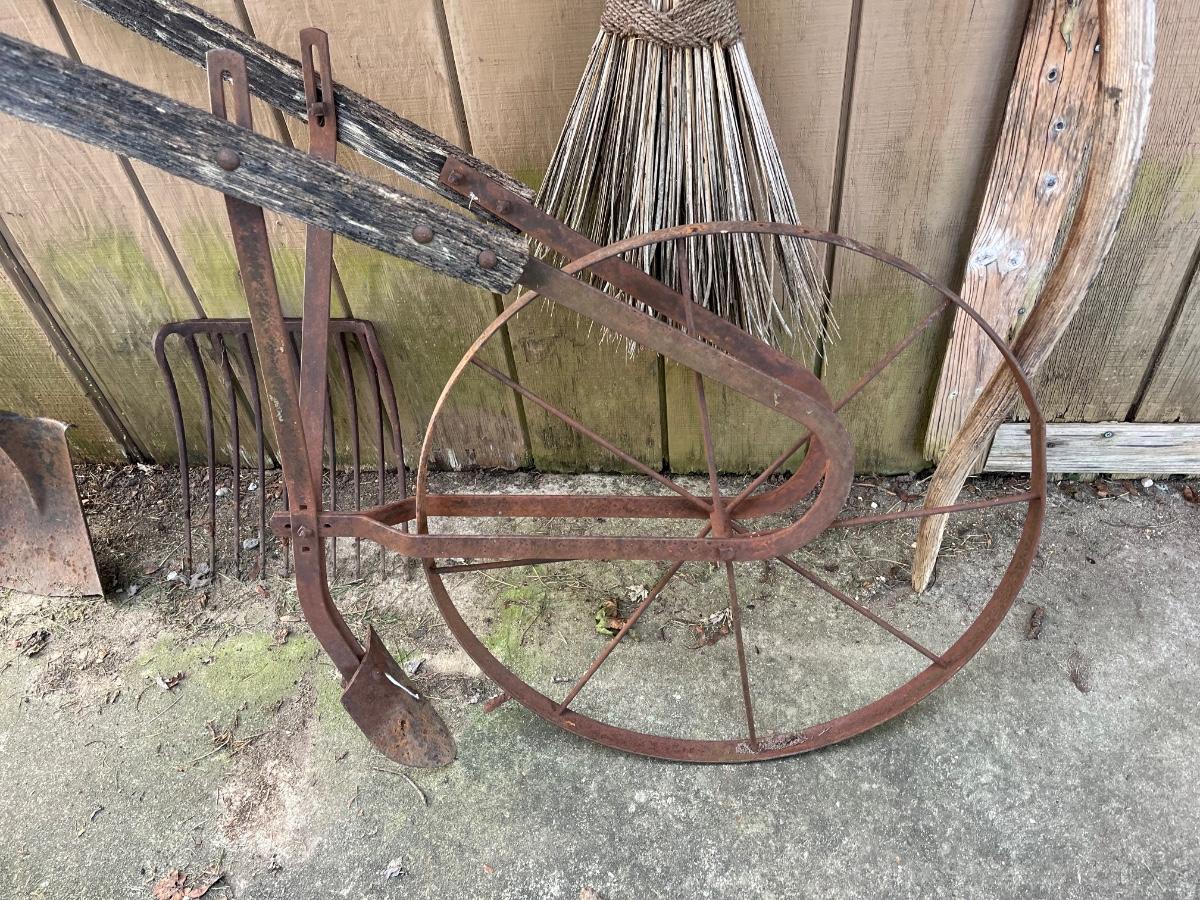 LOT 76S: Vintage / Antique Farmhouse Decor Tools Decorative Pieces - Scythe, Garden Tiller