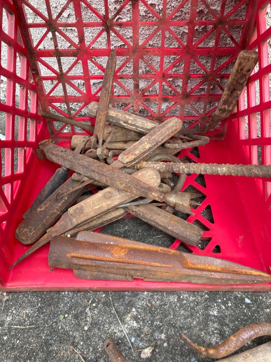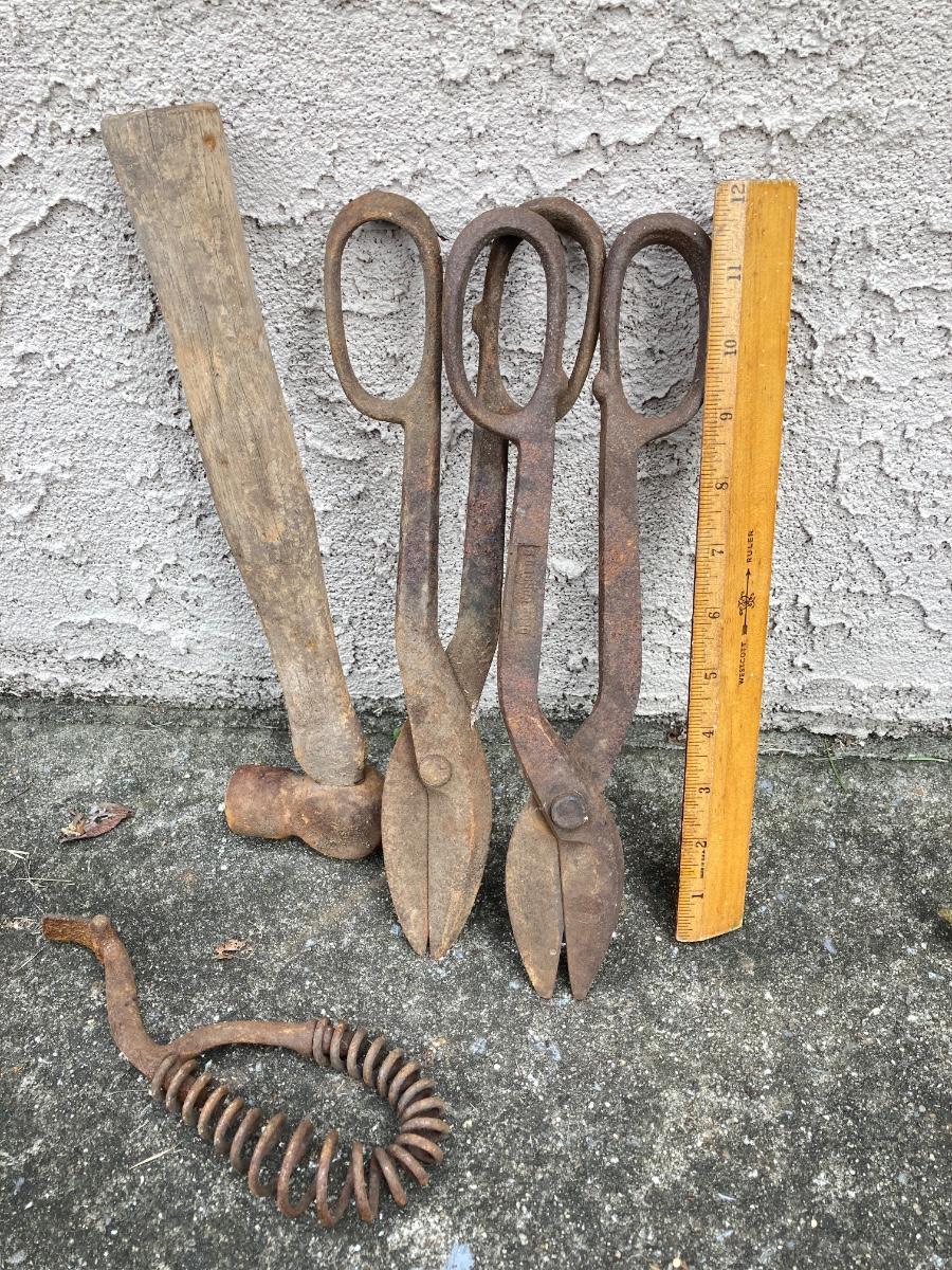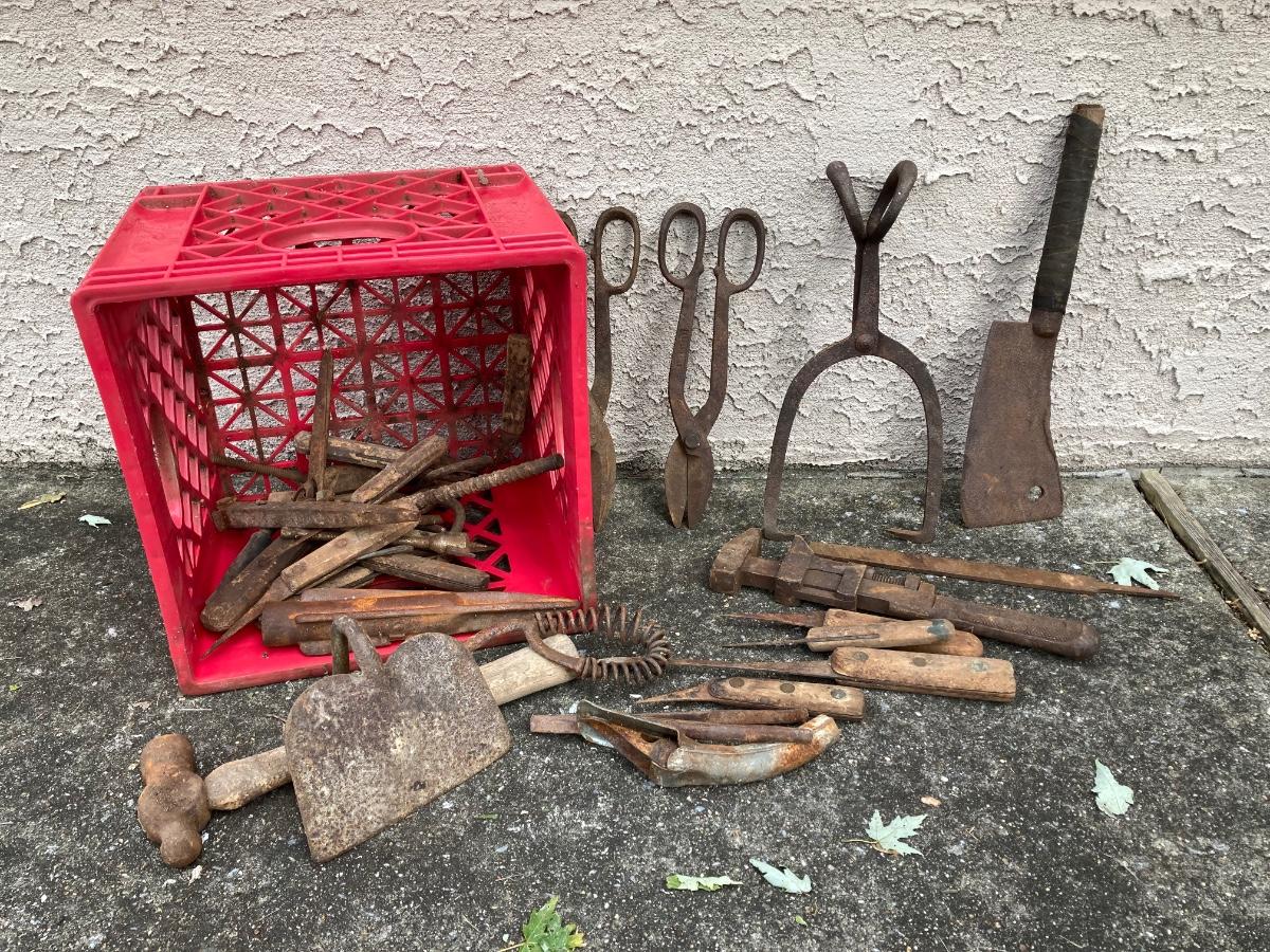 LOT 89S: Crate with Vintage Tools - Cutters, Knives, Perfect Handle Wrench and More
