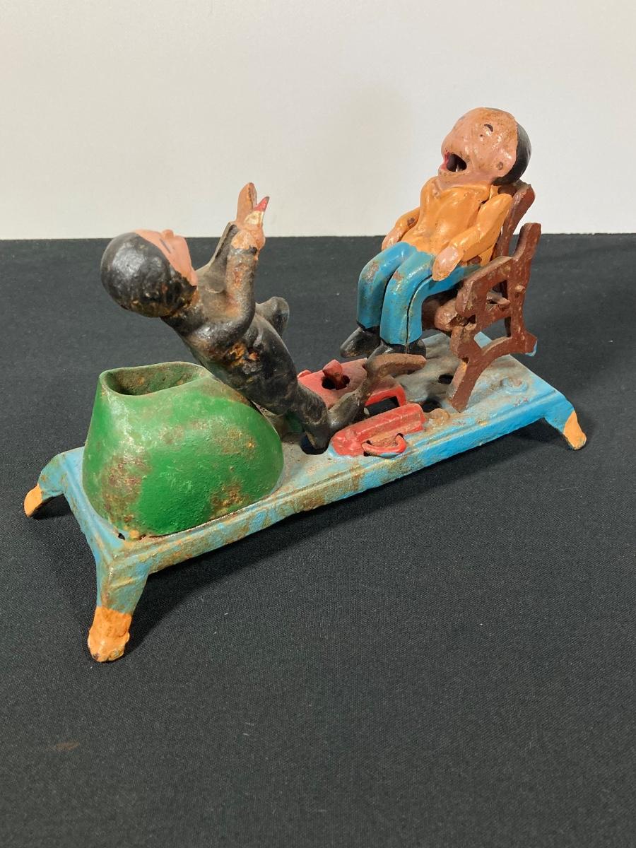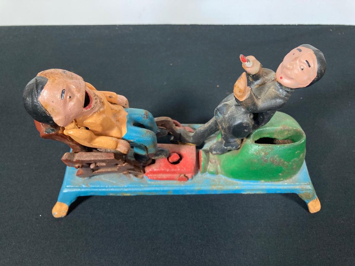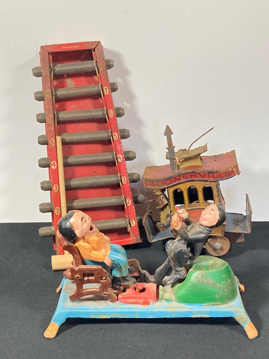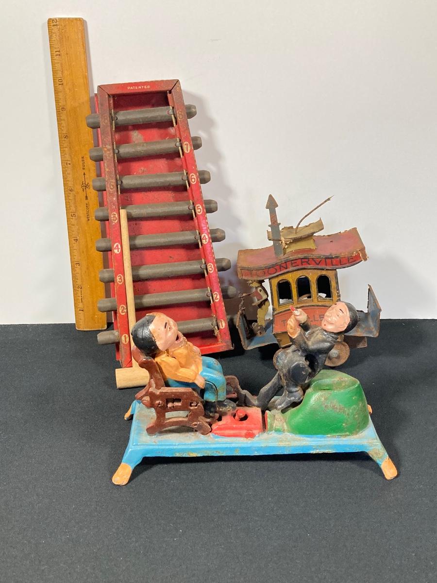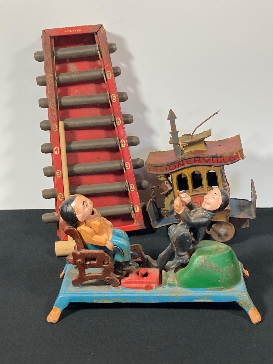 LOT 137L: Toy Collection - Reproduction Tooth Pulling Cast Iron Bank, Vintage Toonerville Trolley and Xylophone