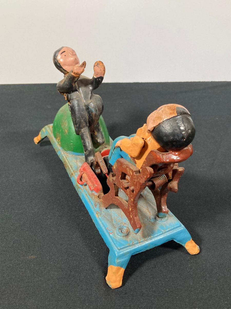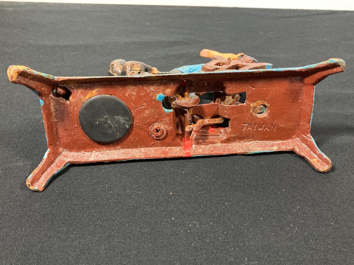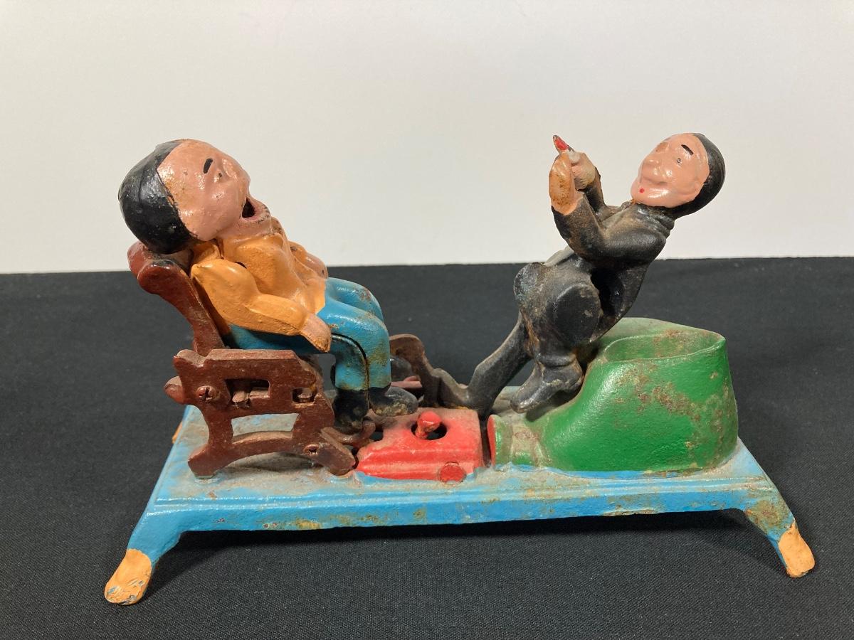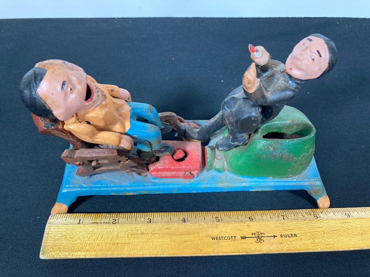 LOT 137L: Toy Collection - Reproduction Tooth Pulling Cast Iron Bank, Vintage Toonerville Trolley and Xylophone