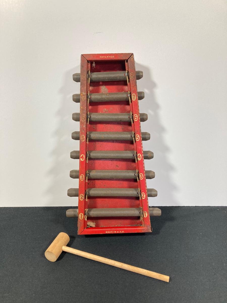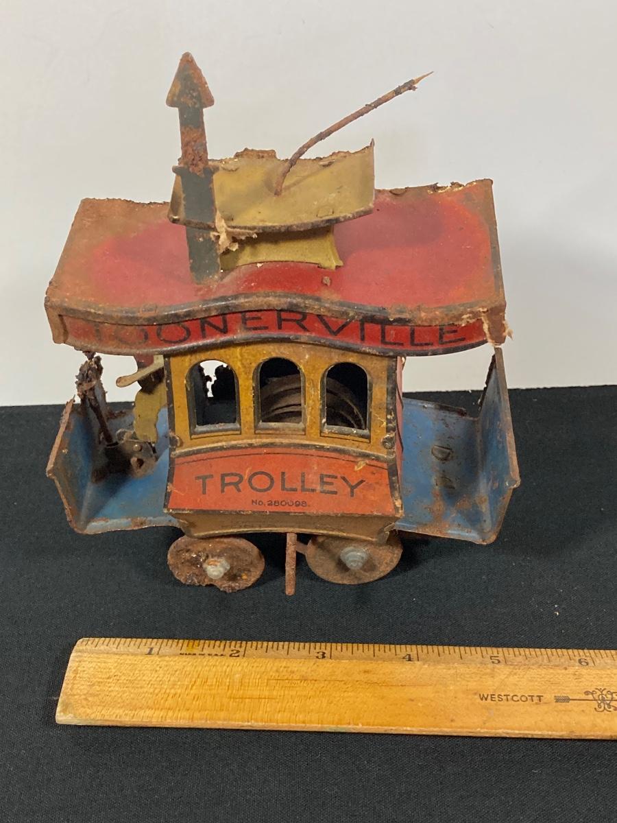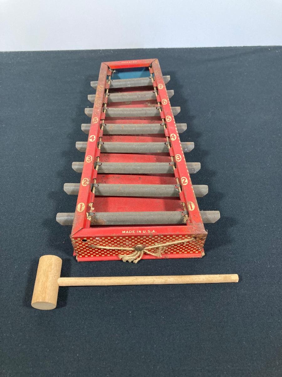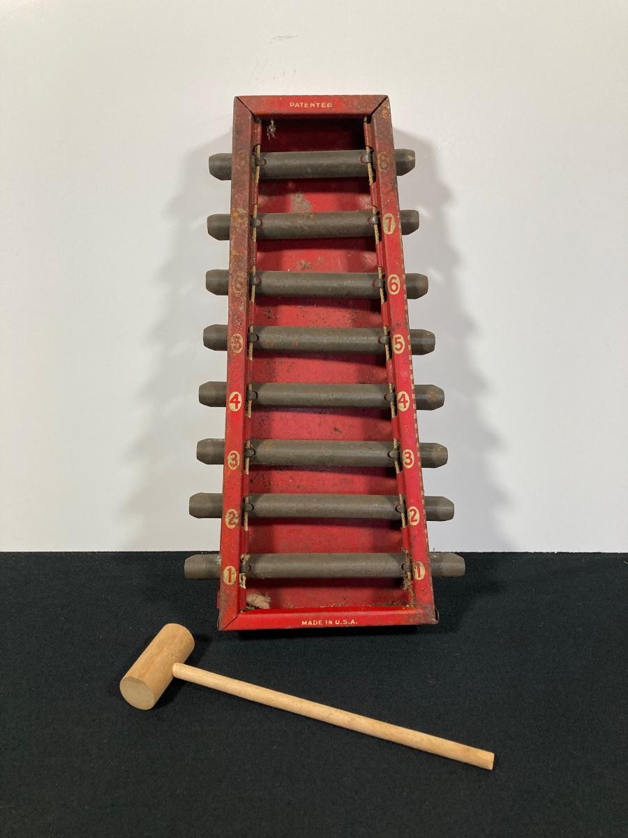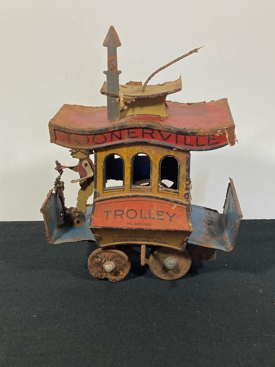 LOT 137L: Toy Collection - Reproduction Tooth Pulling Cast Iron Bank, Vintage Toonerville Trolley and Xylophone