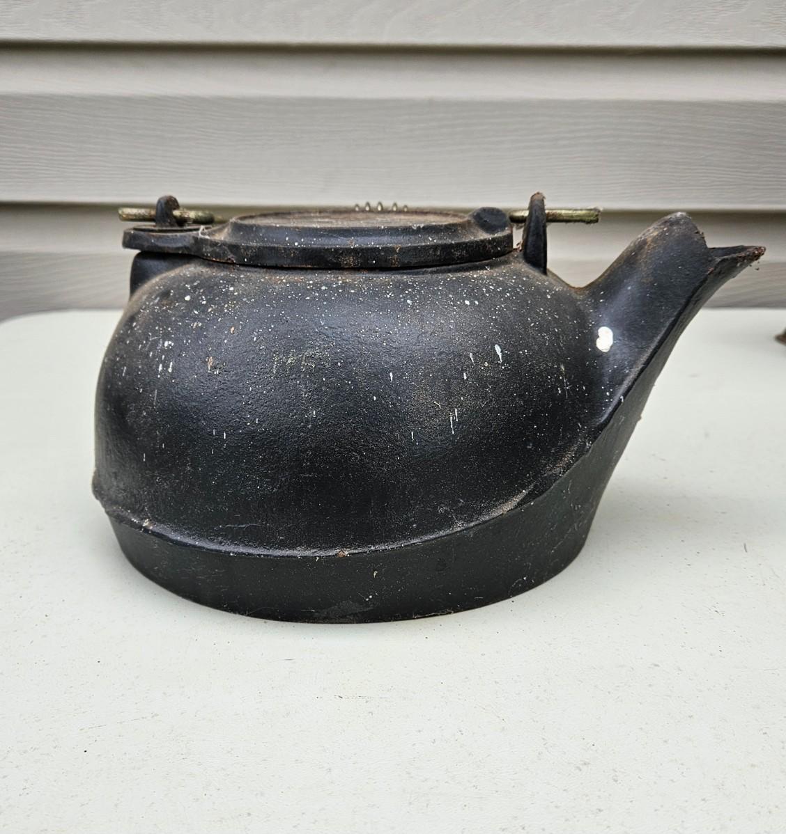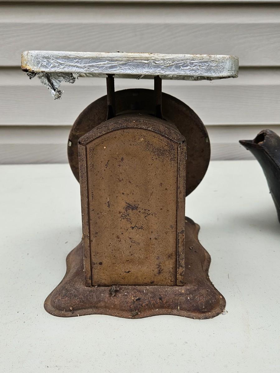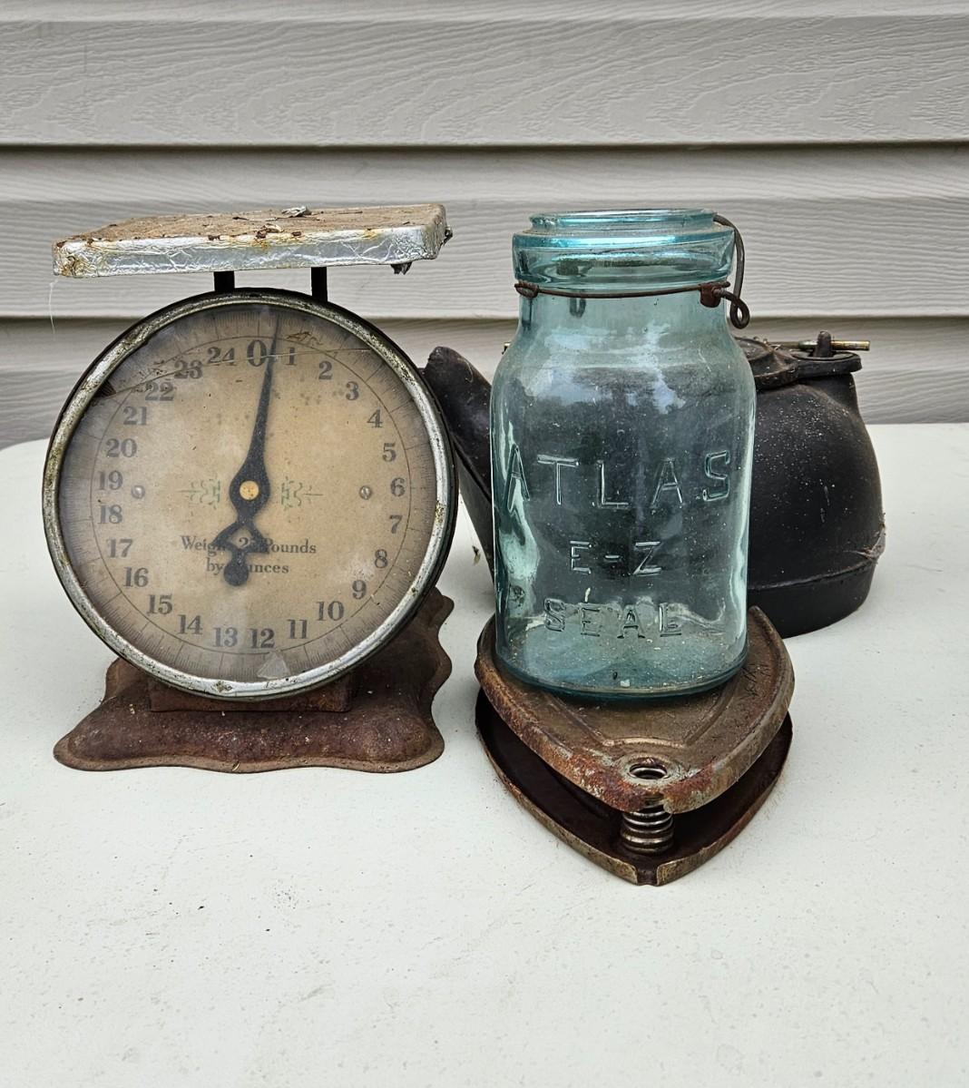 LOT 163S: Collection of Antiques - Cast Iron Kettle, Atlas Mason Jar, Scale & Iron Stand
