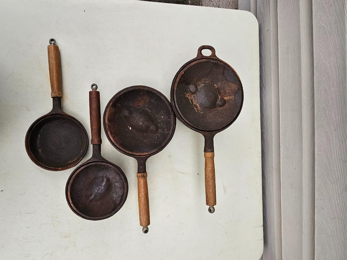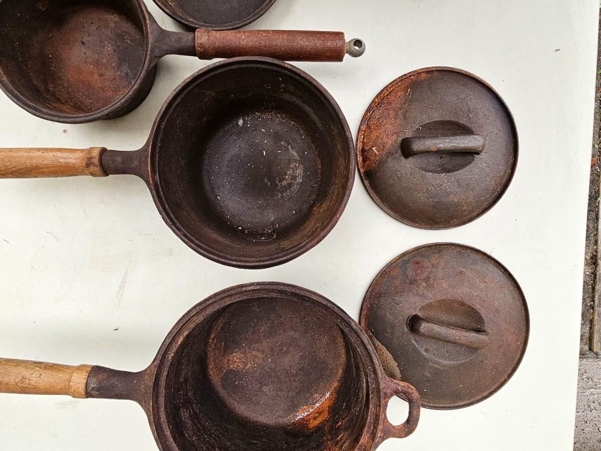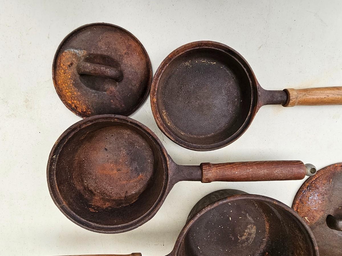 LOT 171S: Set of 4 Wood Handled Cast Iron Pots with Lids