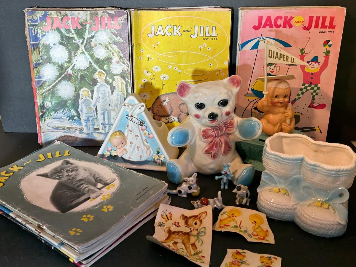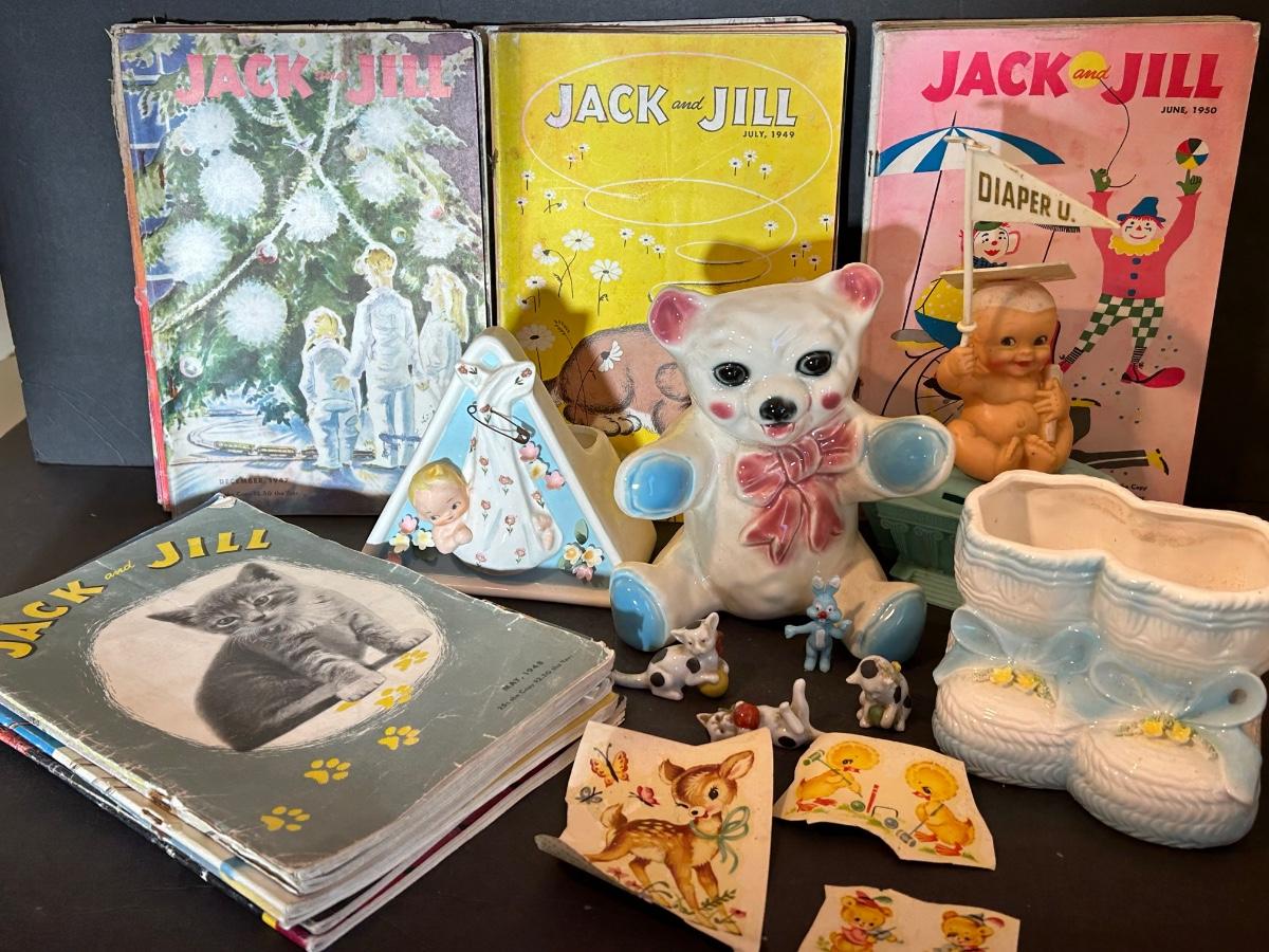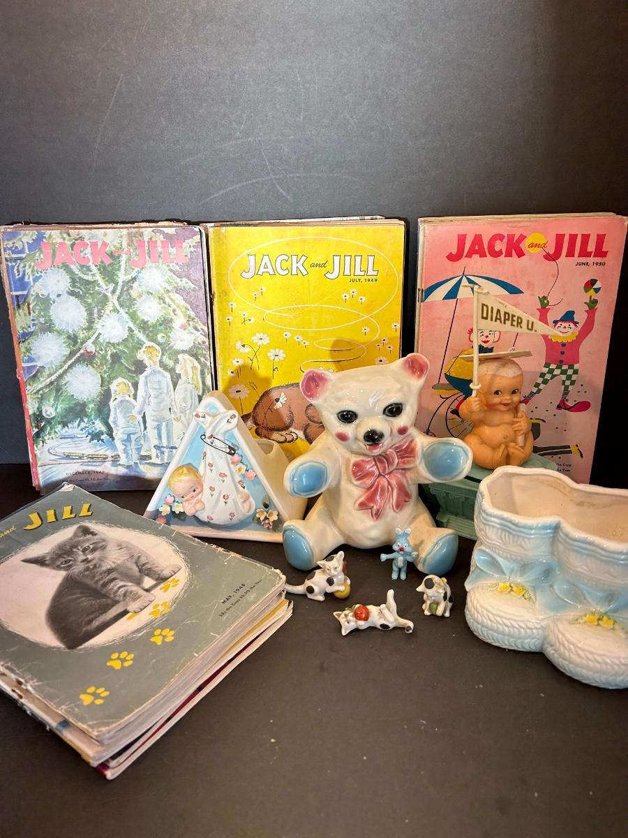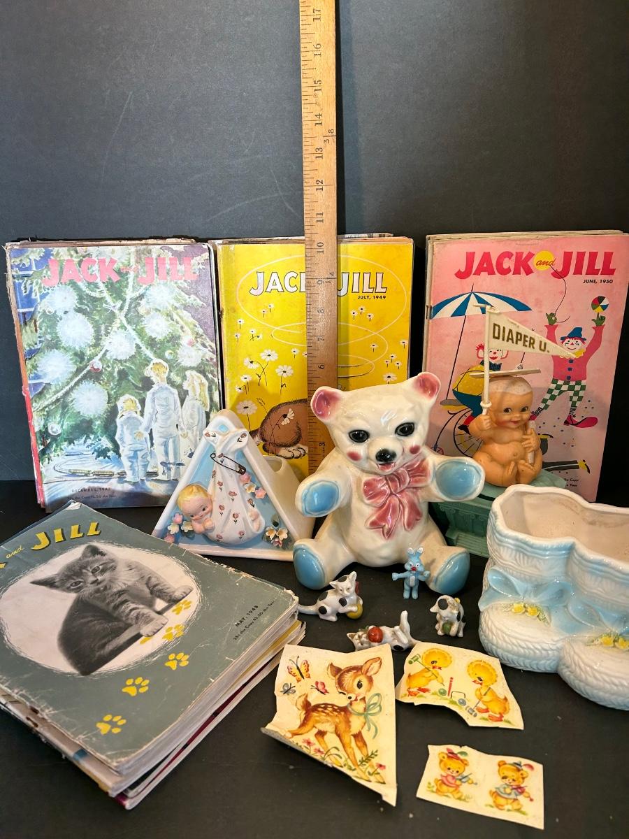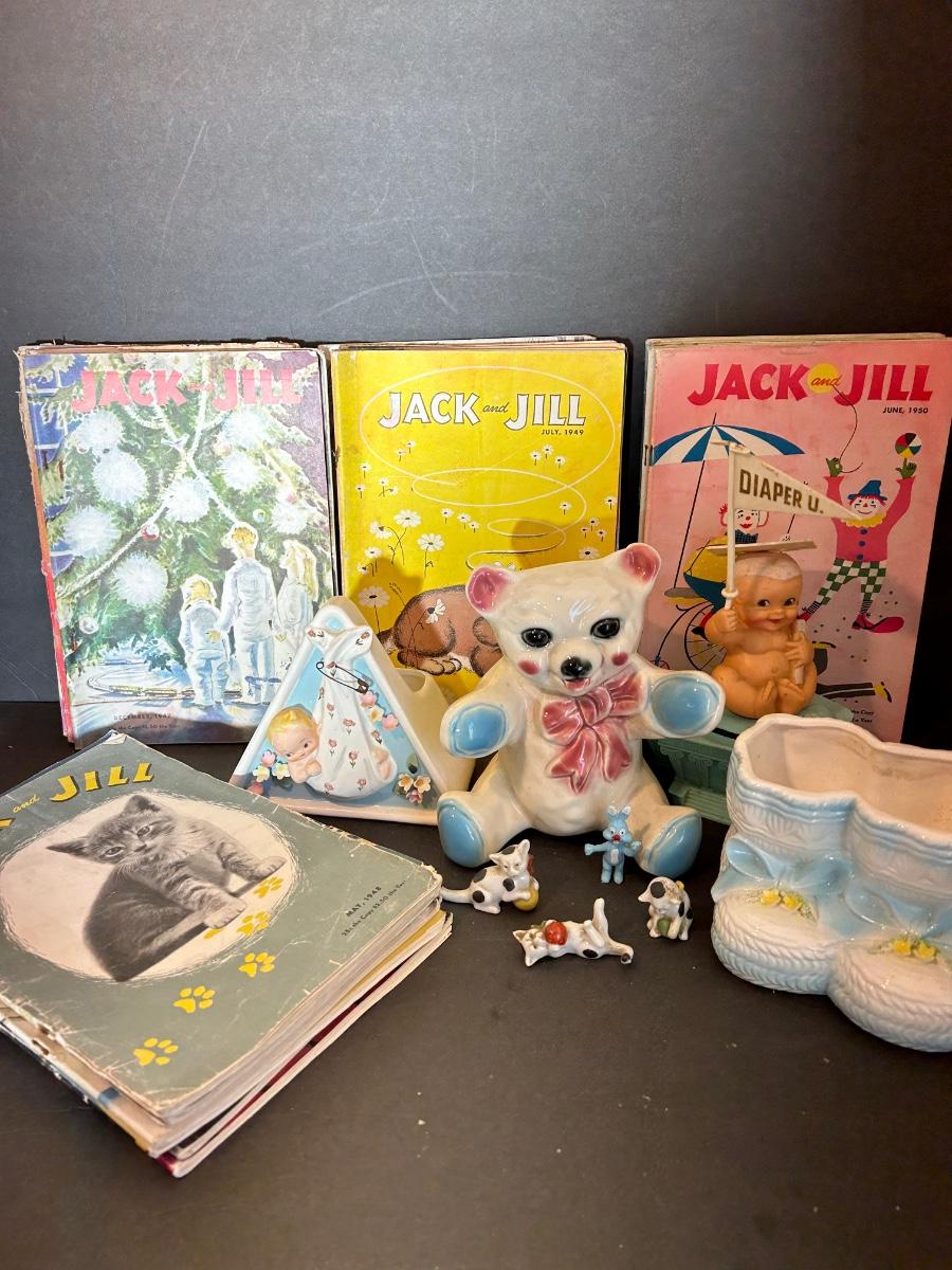Vintage Jack and Jill Books, vintage planters, plastic bank, cats playing miniatures and stickers.