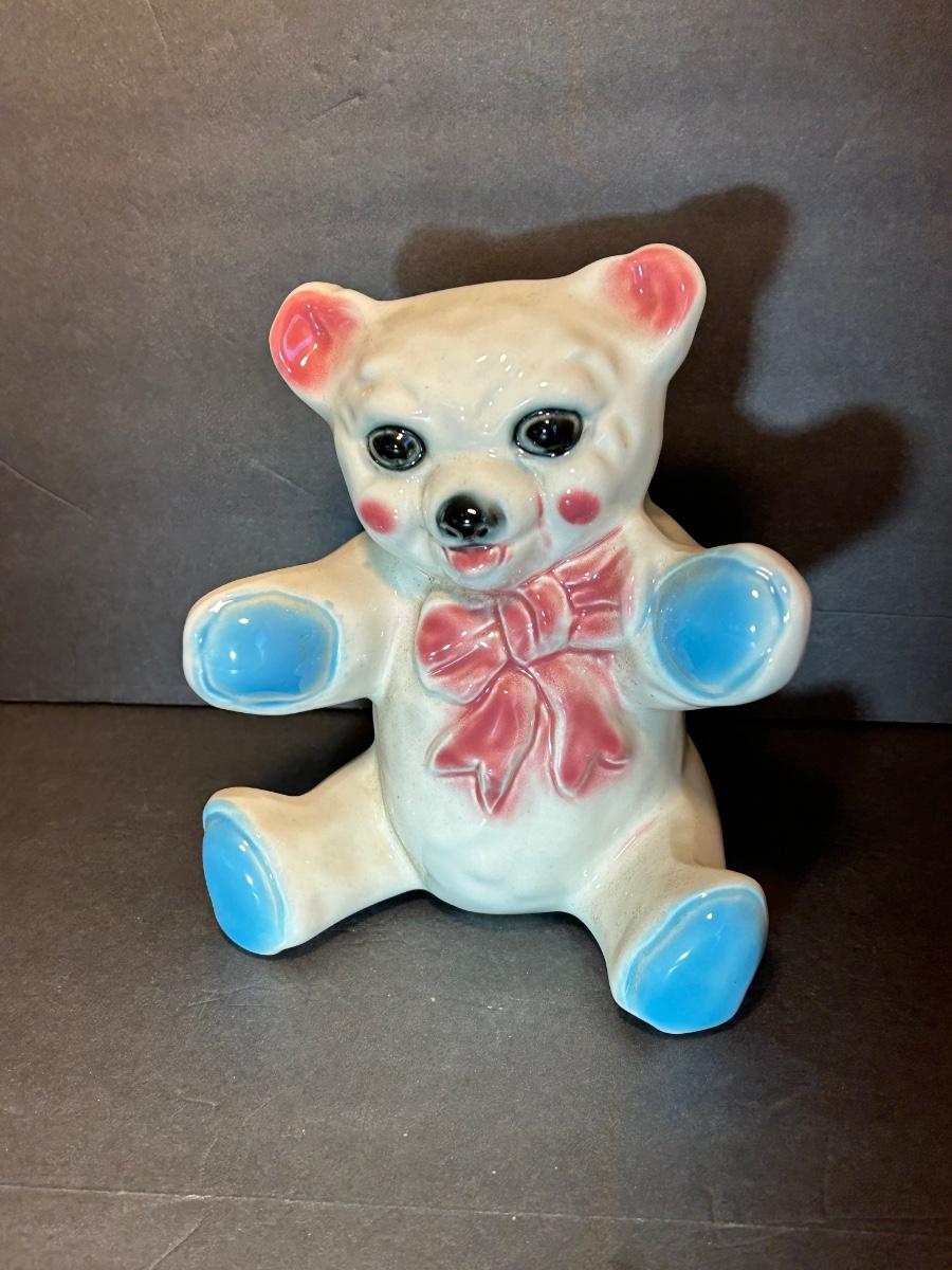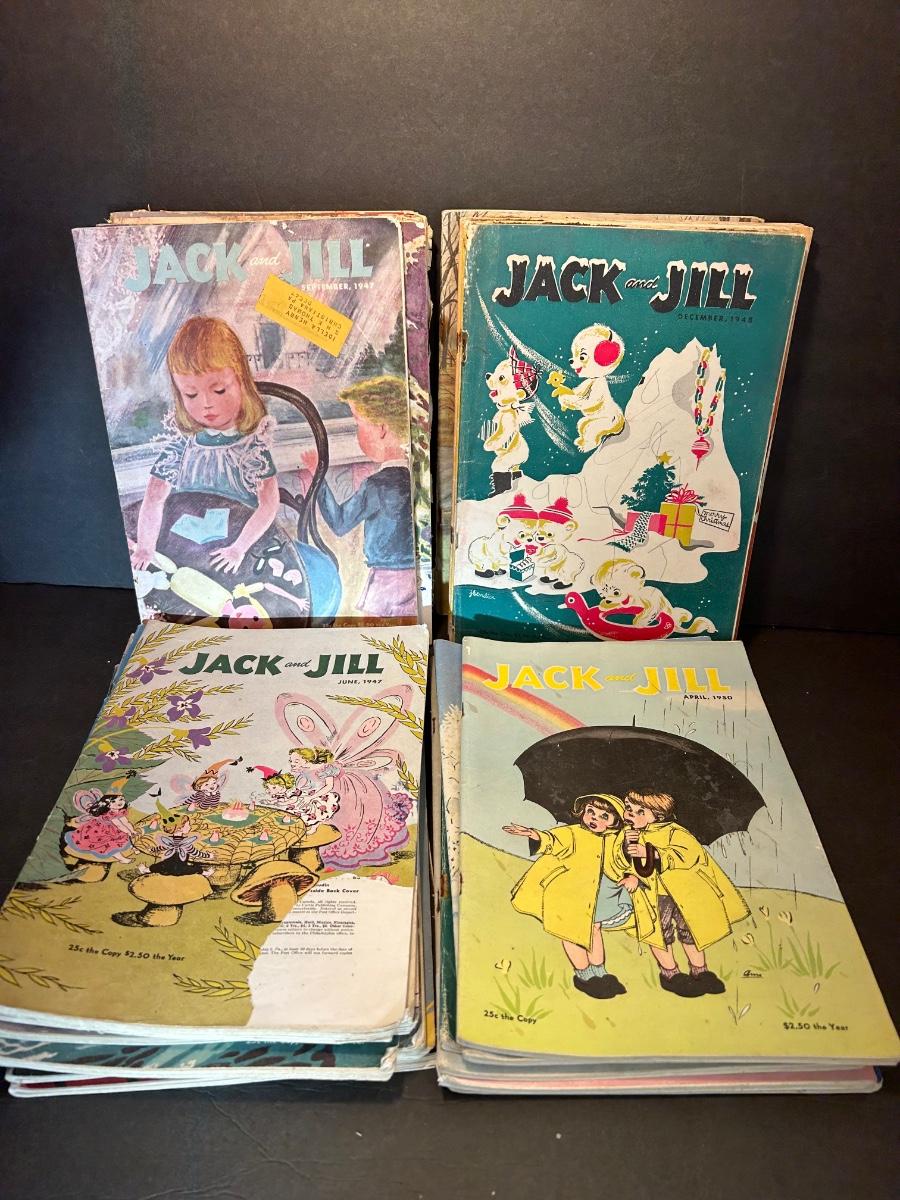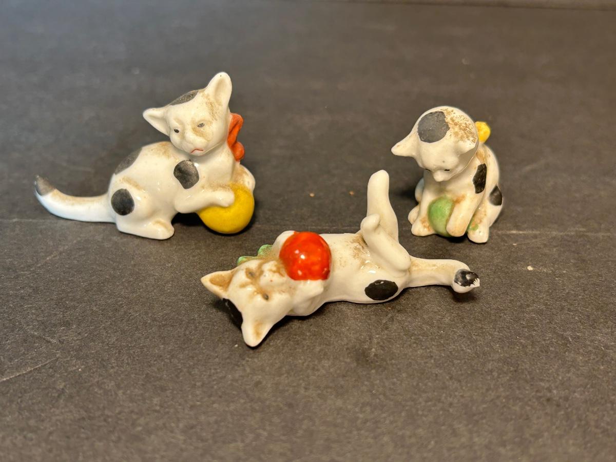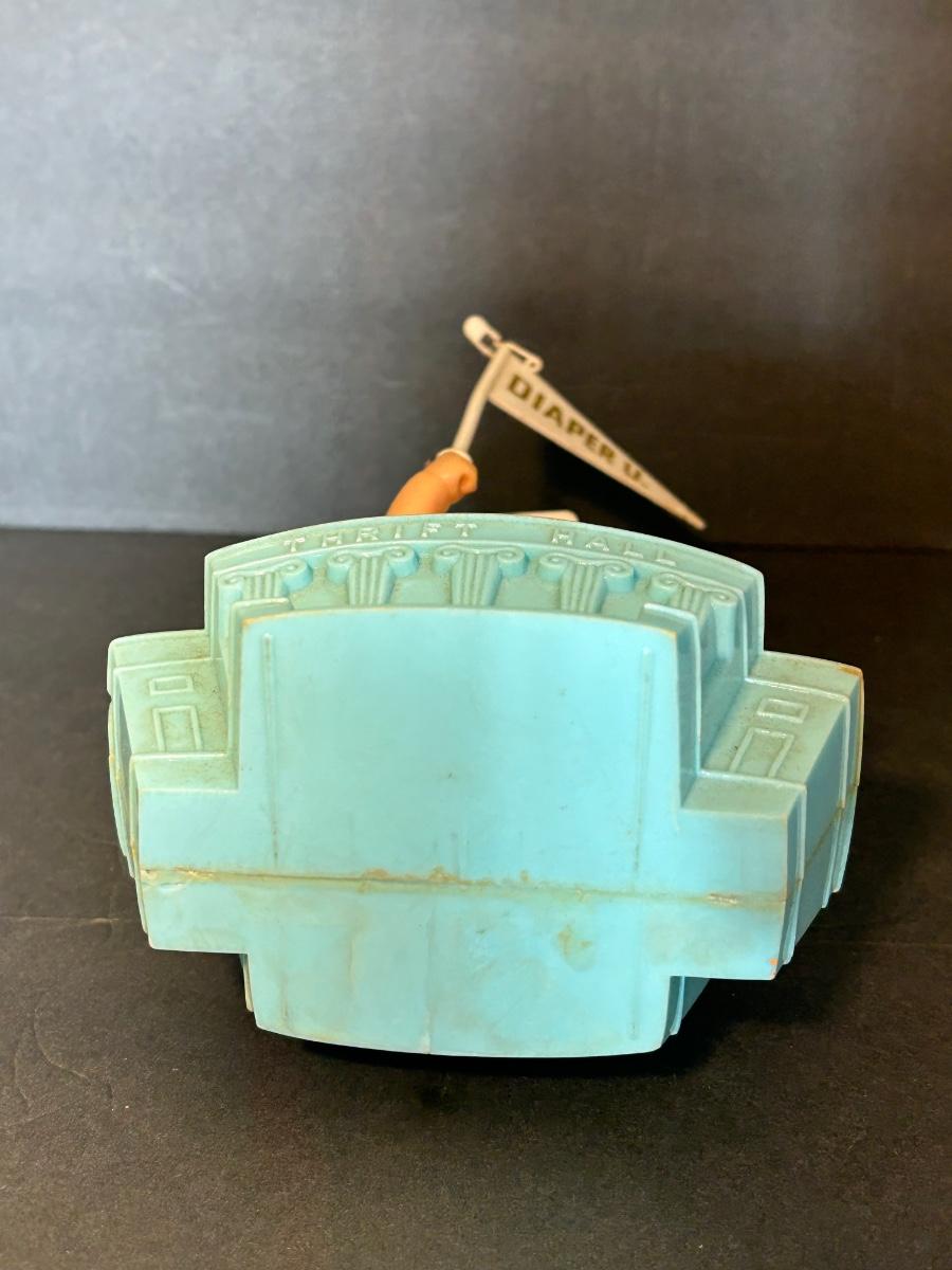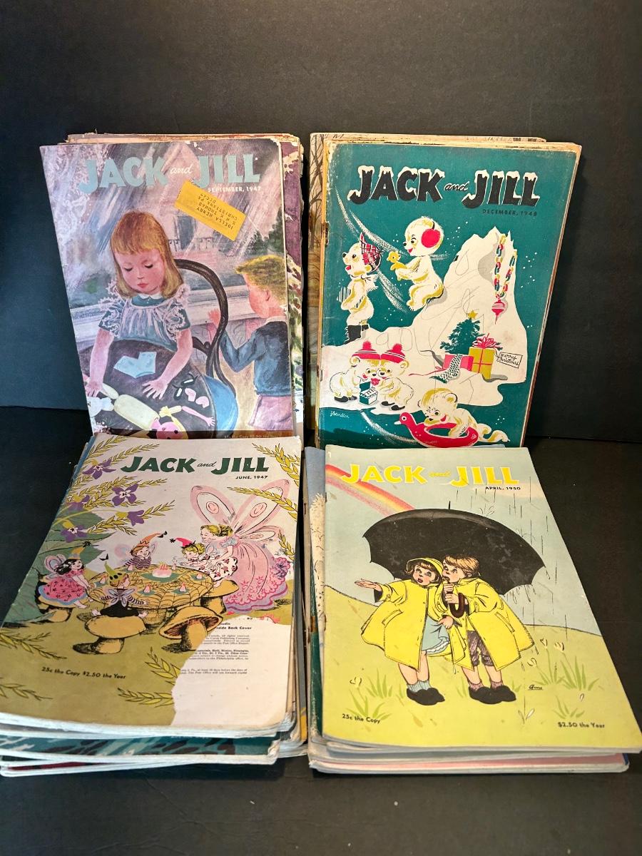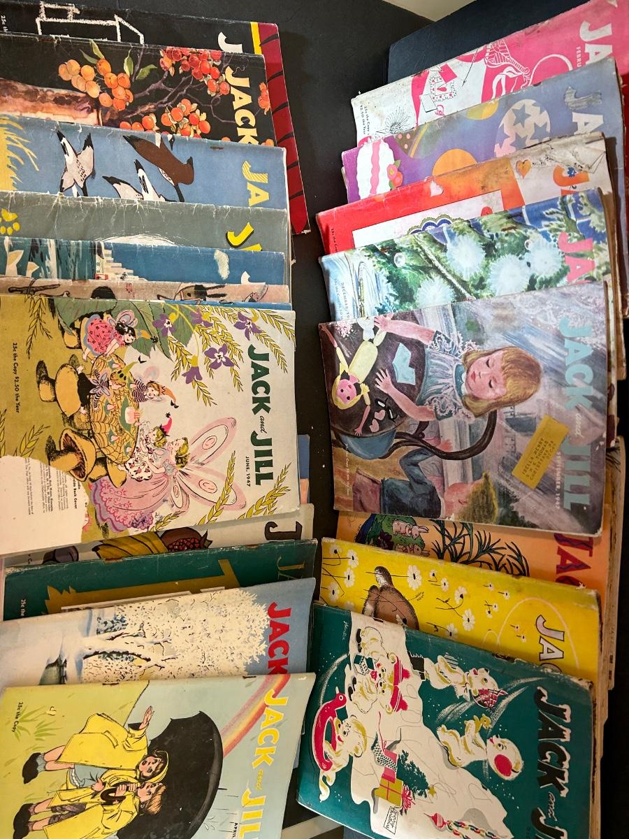 Vintage Jack and Jill Books, vintage planters, plastic bank, cats playing miniatures and stickers.
