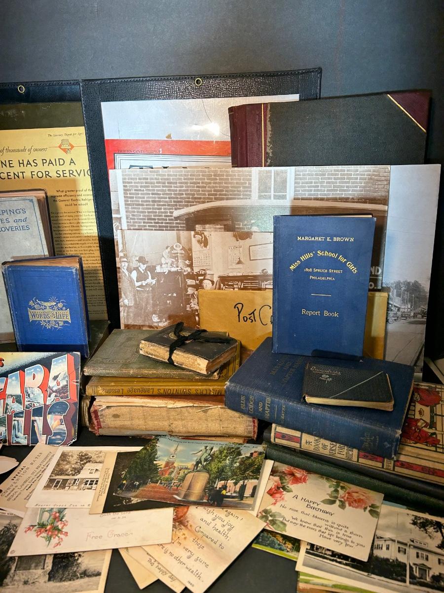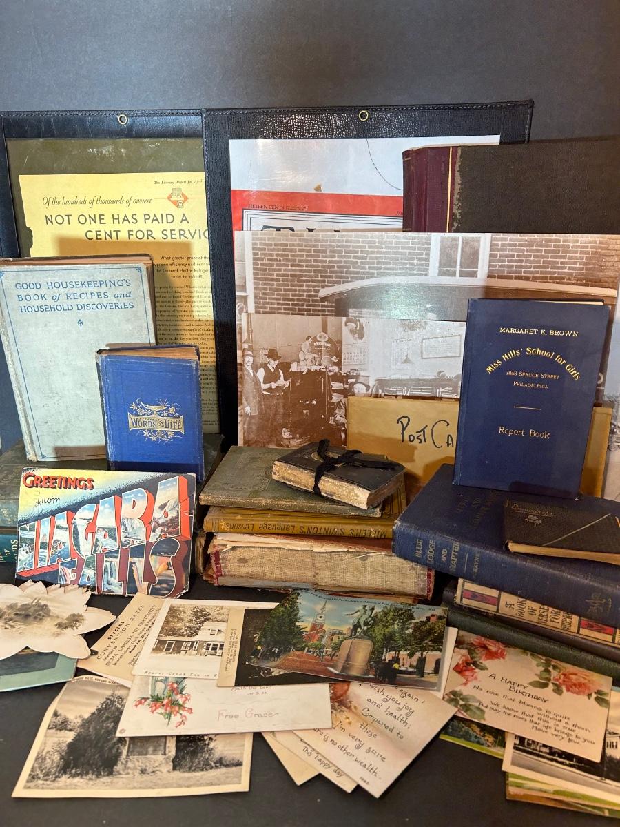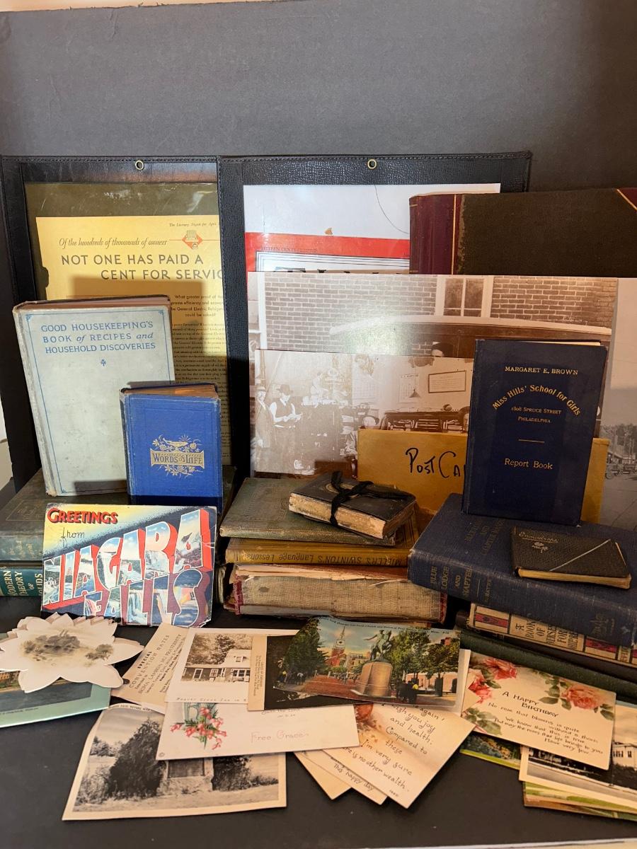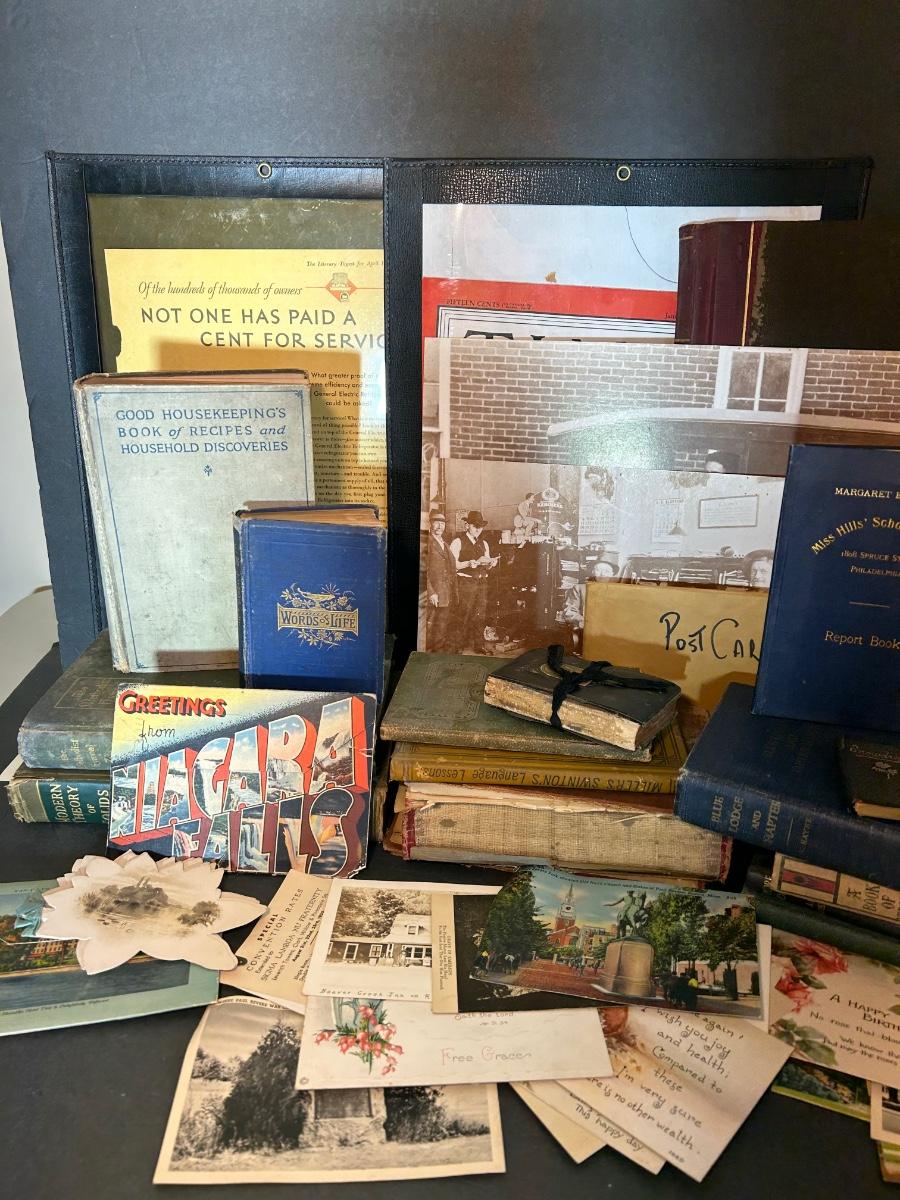 large collection of Attic finds. Collection includes post cards, photographs from the 1920's, skelp order book, cook books, book of poems and more.