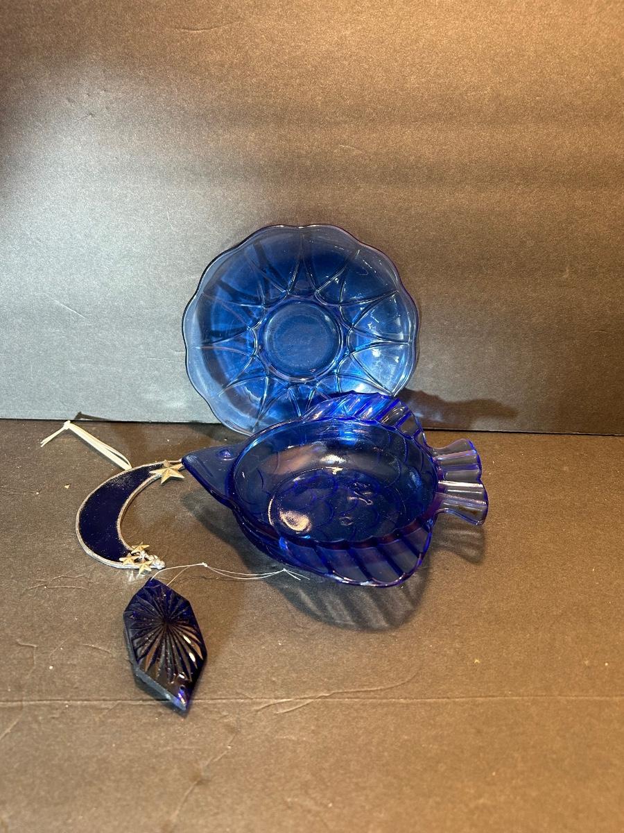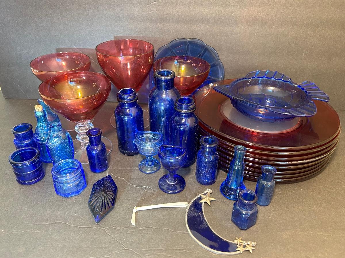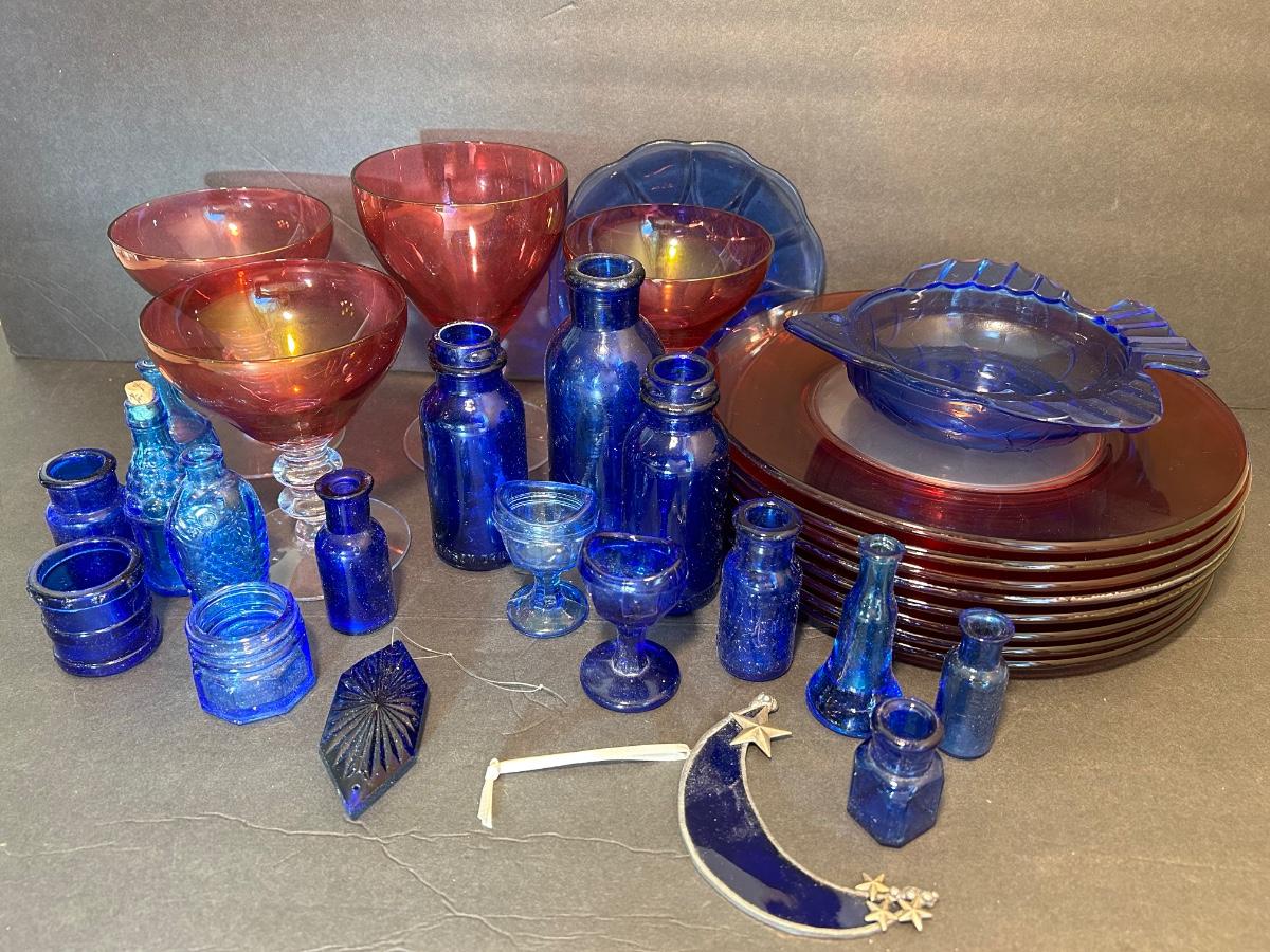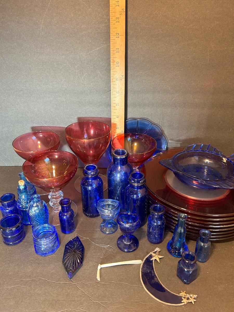 Red glass includes 8 dishes, 3 desert glasses and 1 wine glass. Blue glass includes fish dish, sun catcher, mini bottles and more.