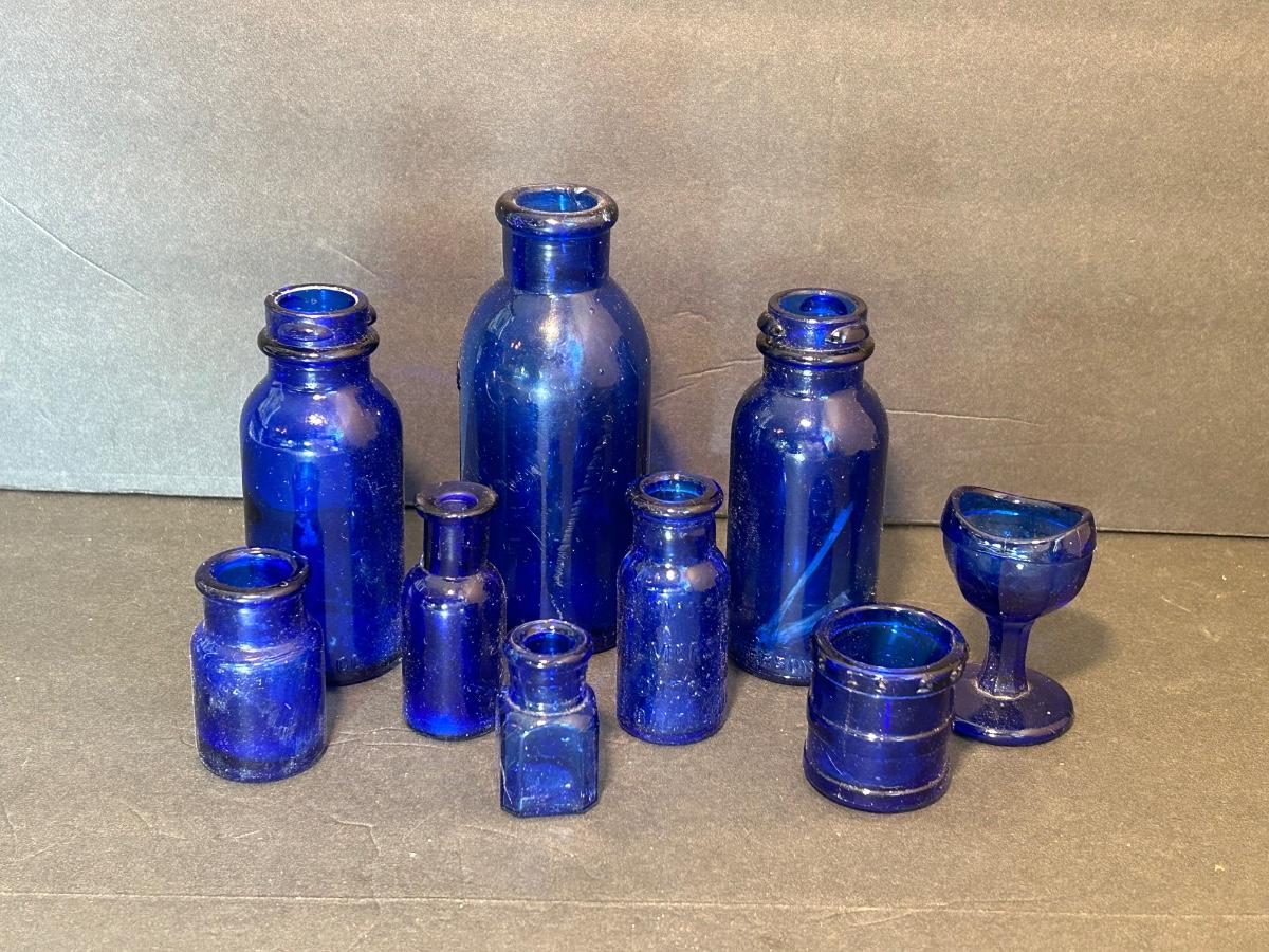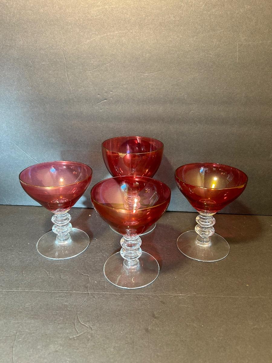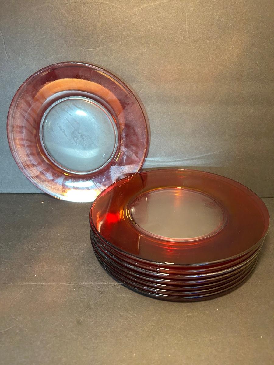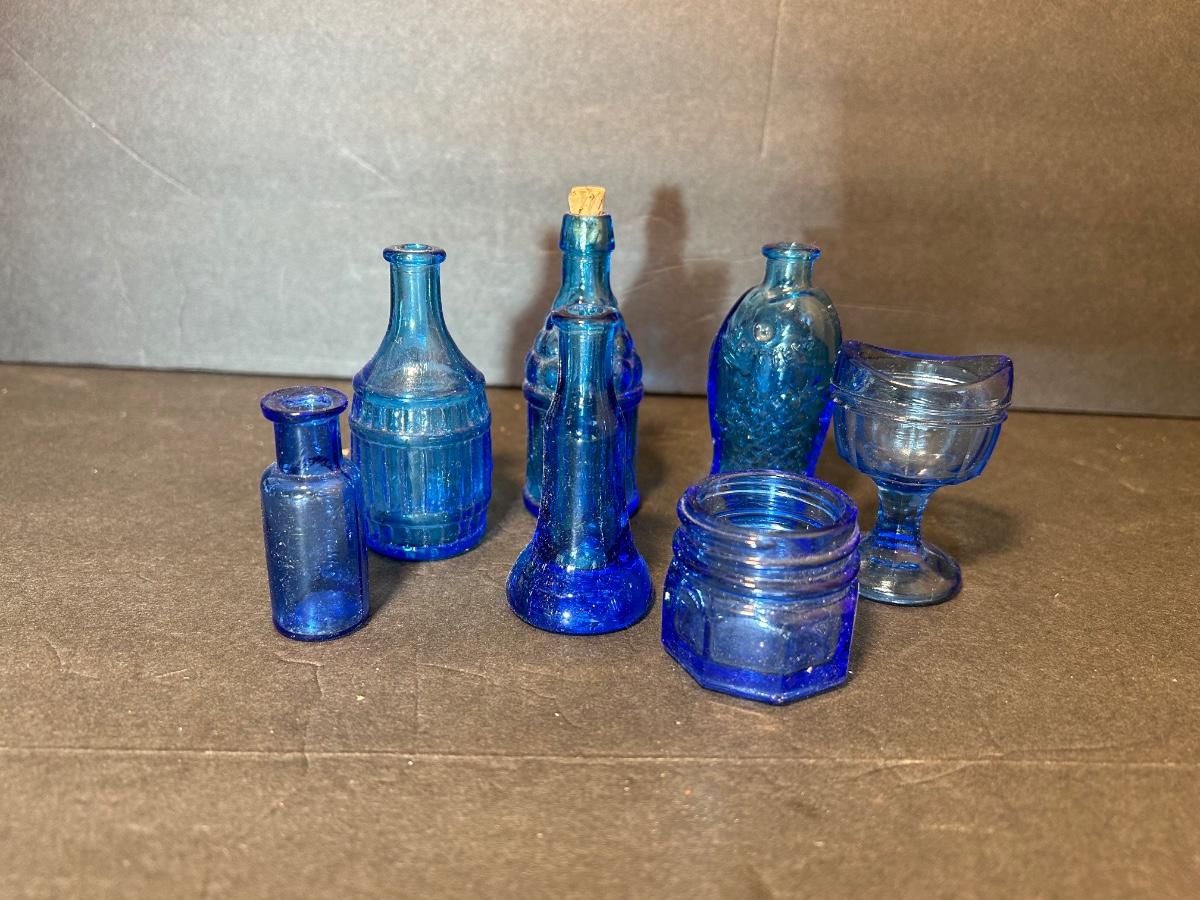 Red glass includes 8 dishes, 3 desert glasses and 1 wine glass. Blue glass includes fish dish, sun catcher, mini bottles and more.