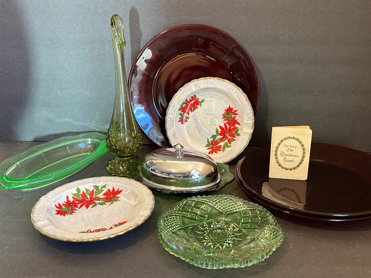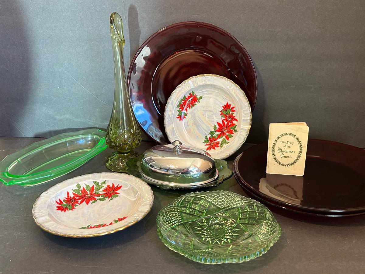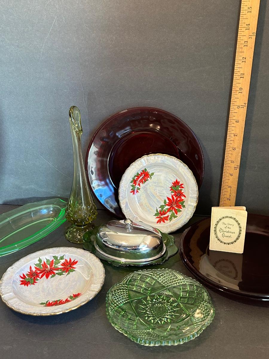 Uranium Glass dish, red dishes, green covered dish, vintage poinsettia dishes, vase and more.