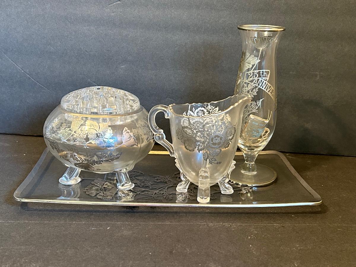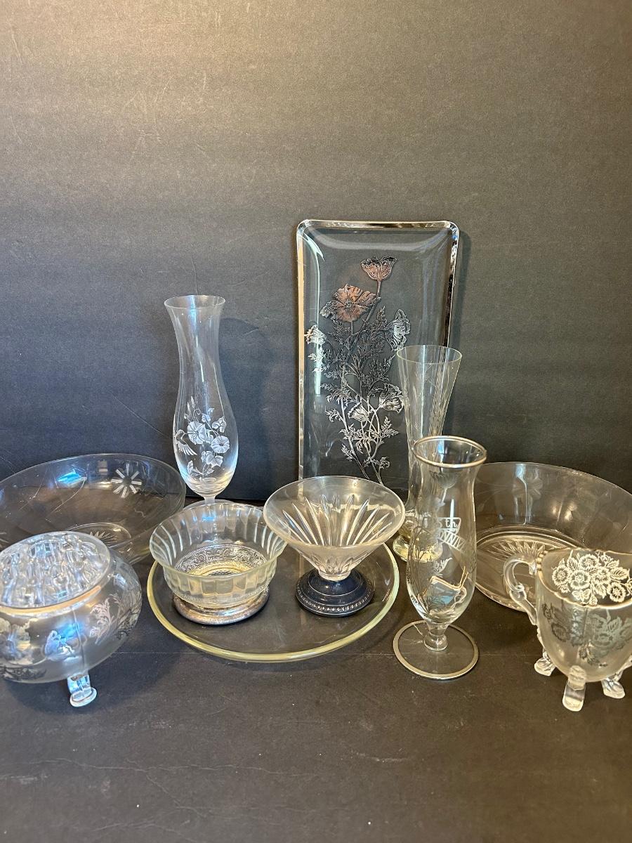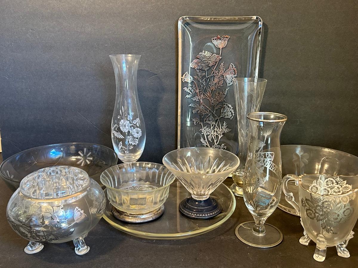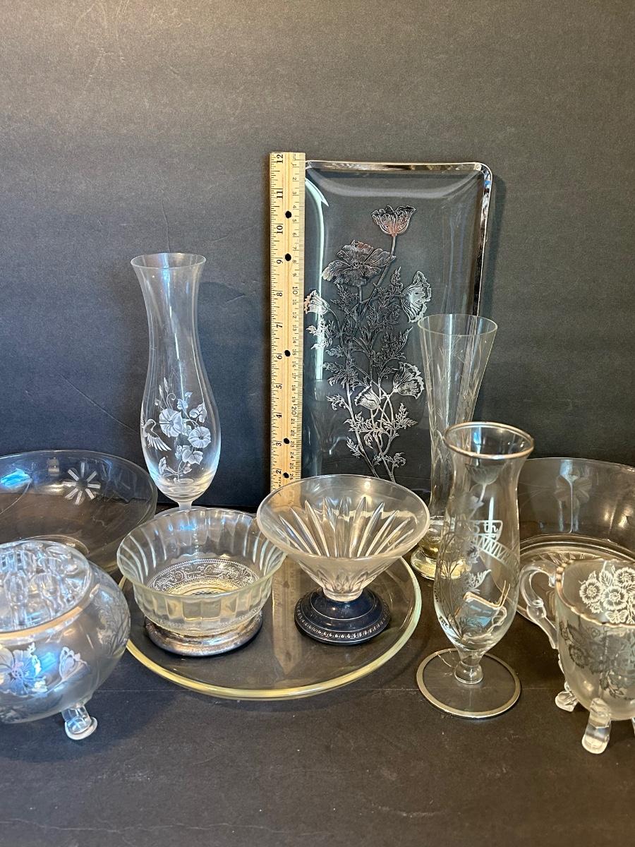 Clear glass with silver lining, flower frog, serving dishes and bowls.
