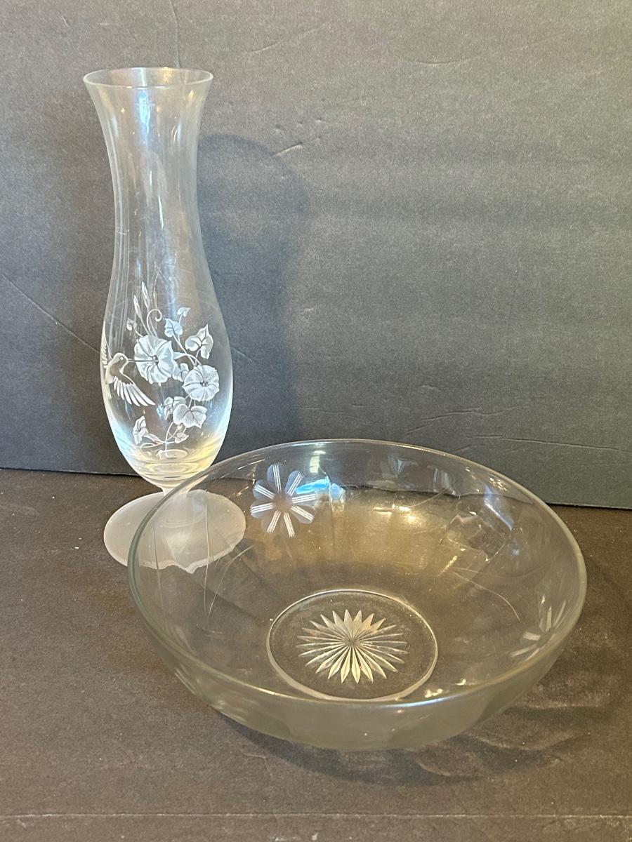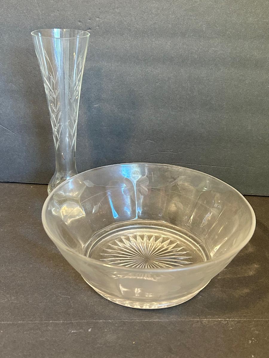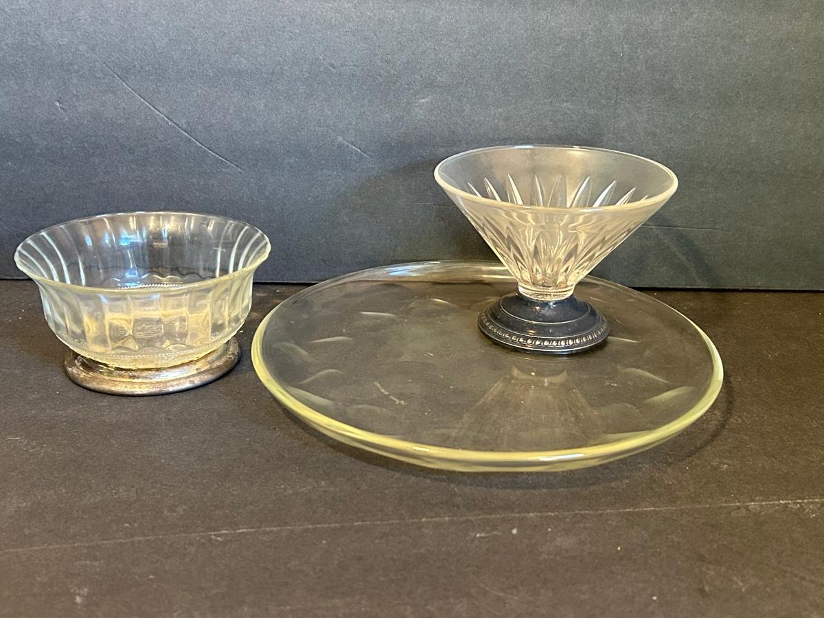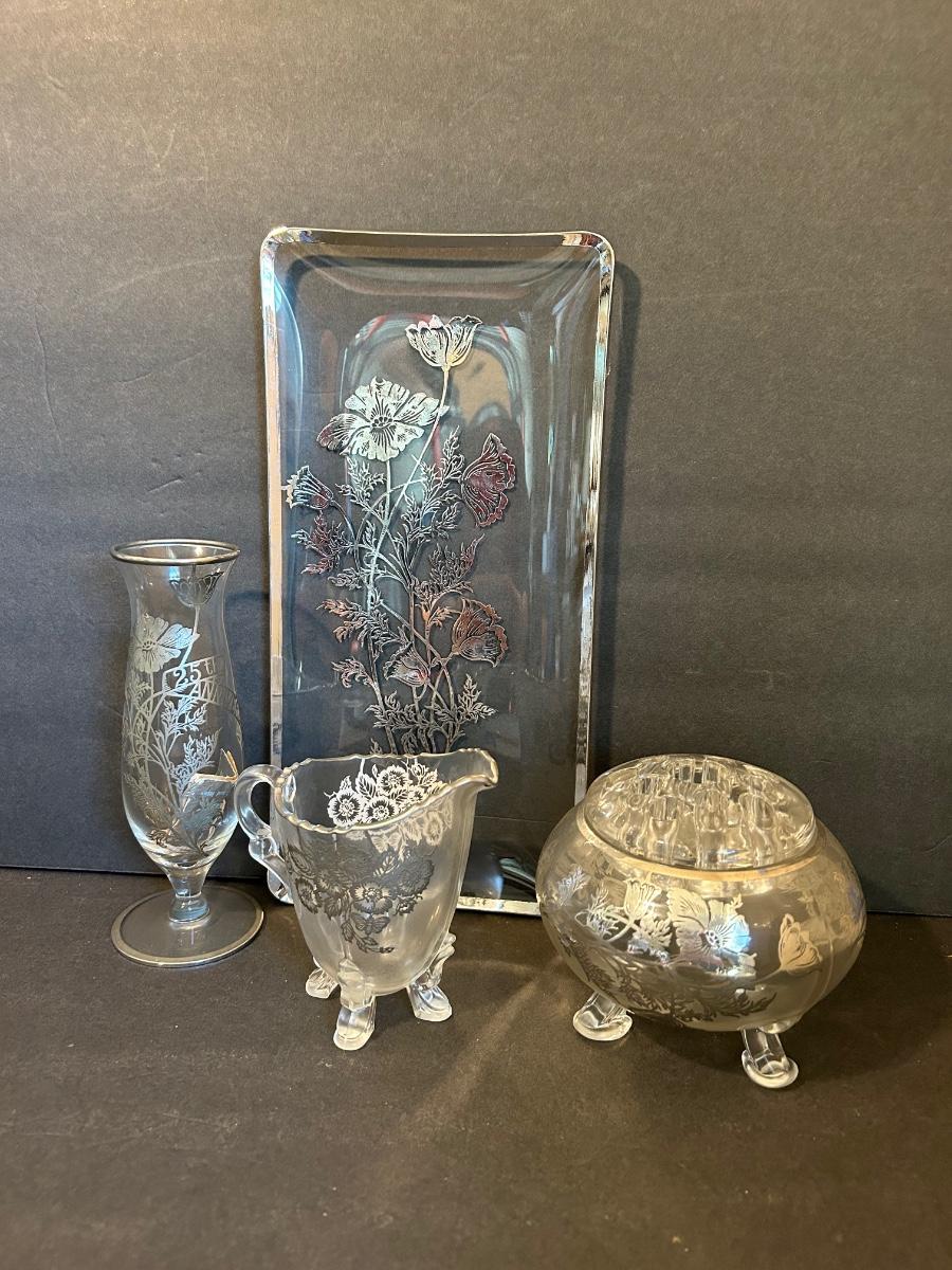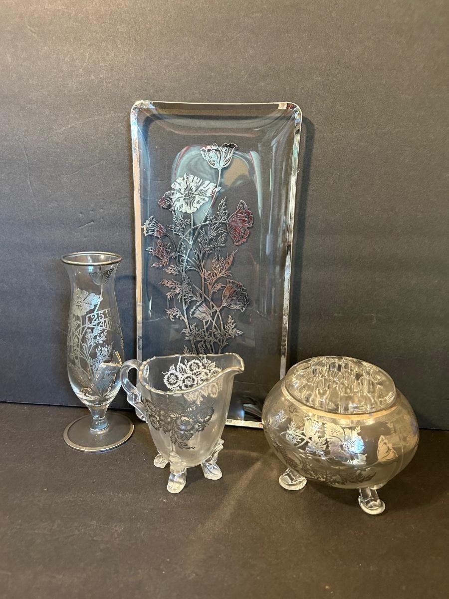 Clear glass with silver lining, flower frog, serving dishes and bowls.