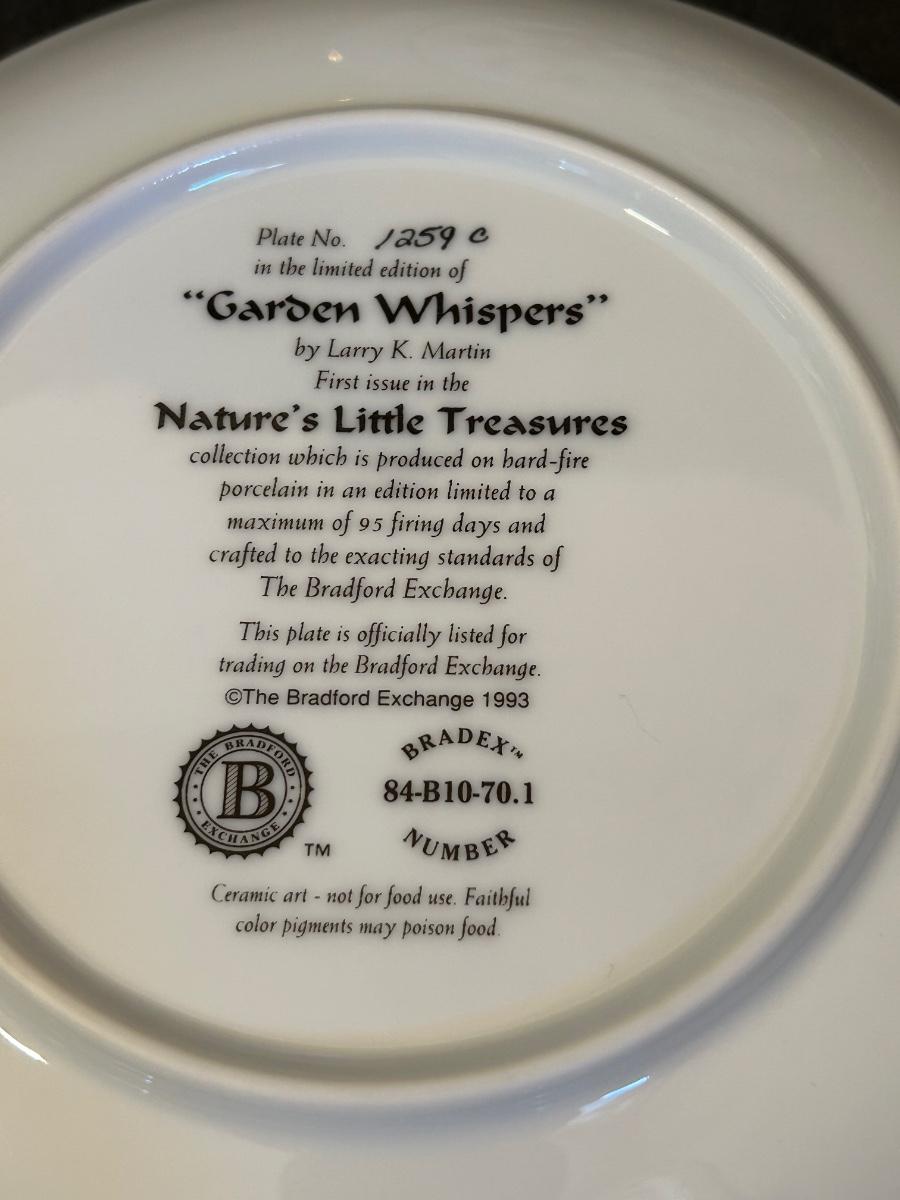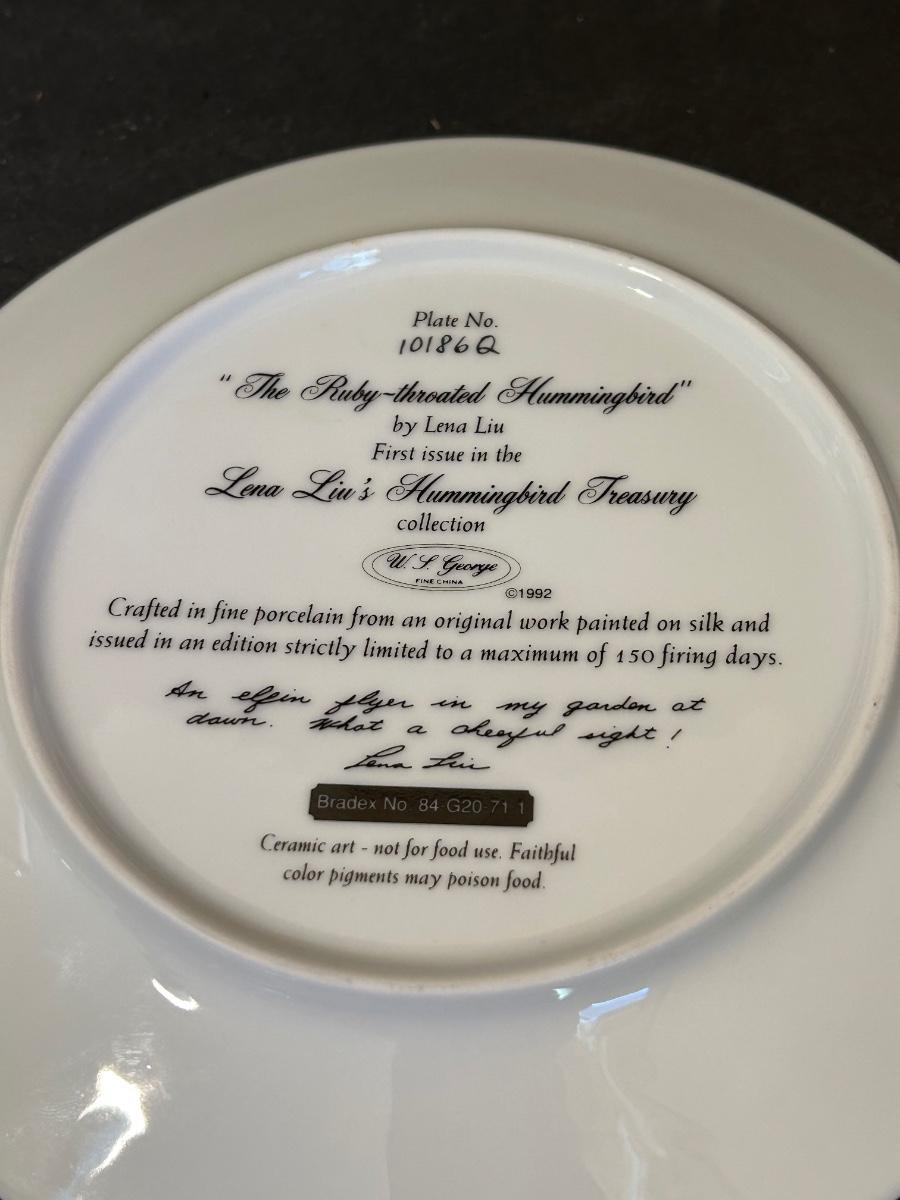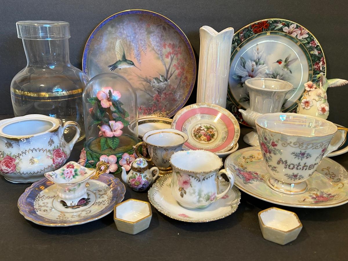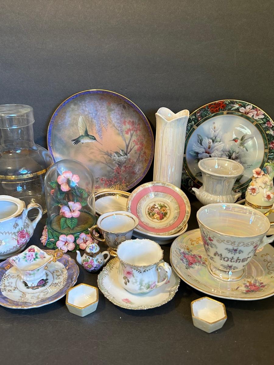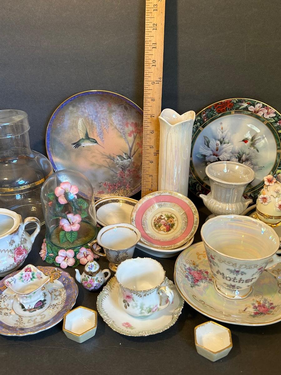 Garden Whispers by Larry K. Martin and The Ruby Throated Hummingbird by Lena Liu from the Bradex Exchange. Tea cups, plates and Humming bird decor.