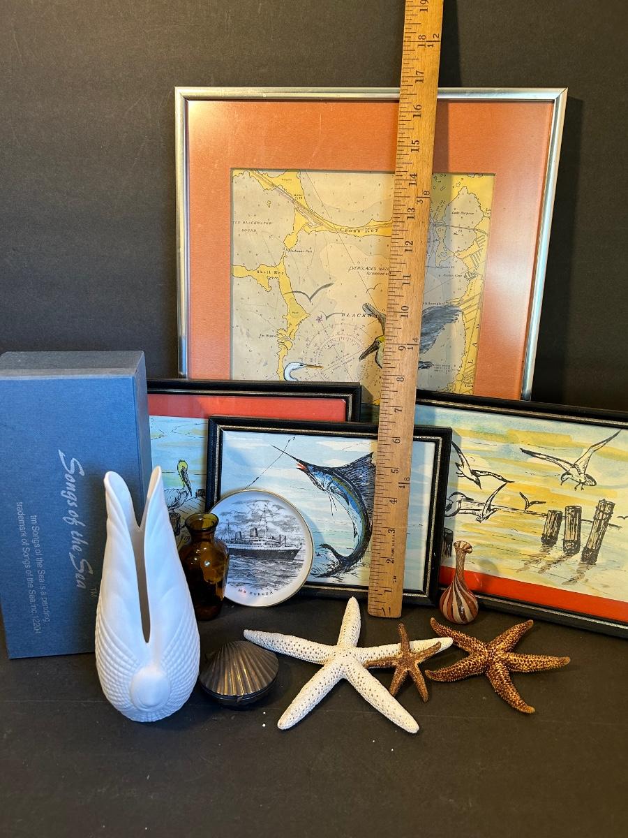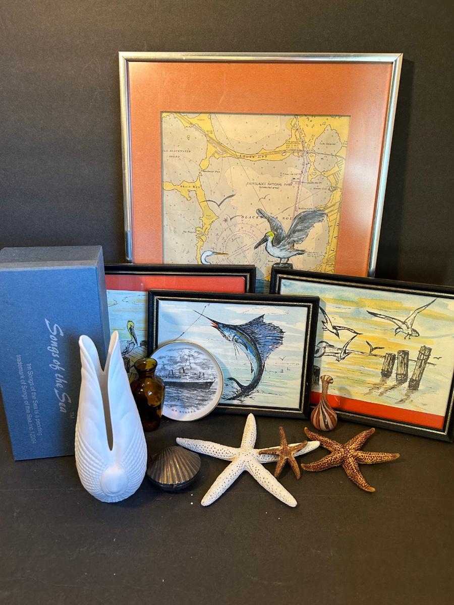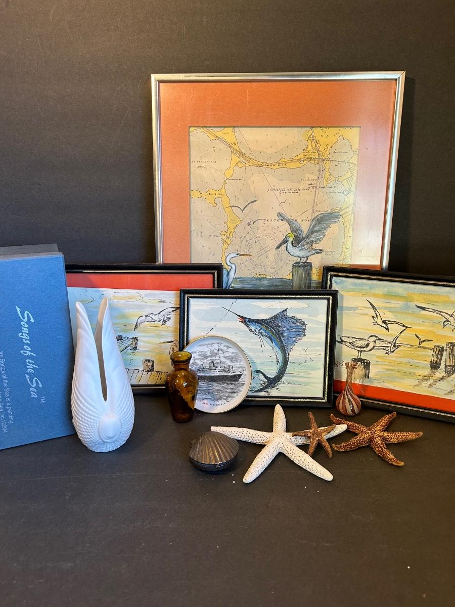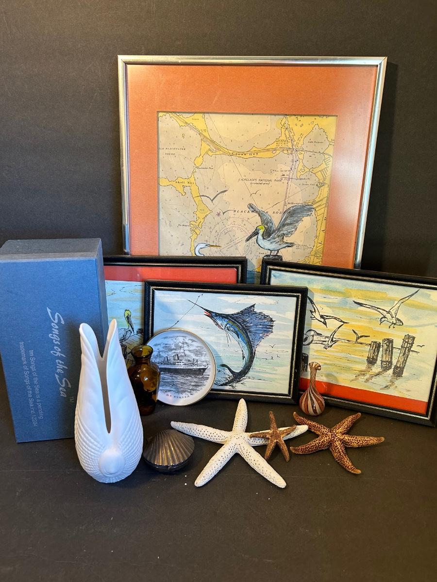 Local artist singed and dated framed prints. Songs Of The Sea Candleholder in original box, starfish and more.