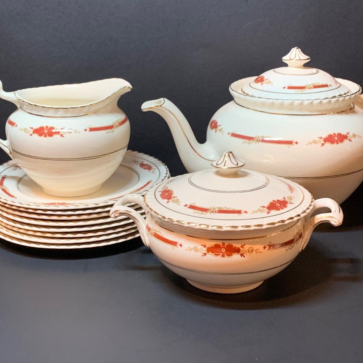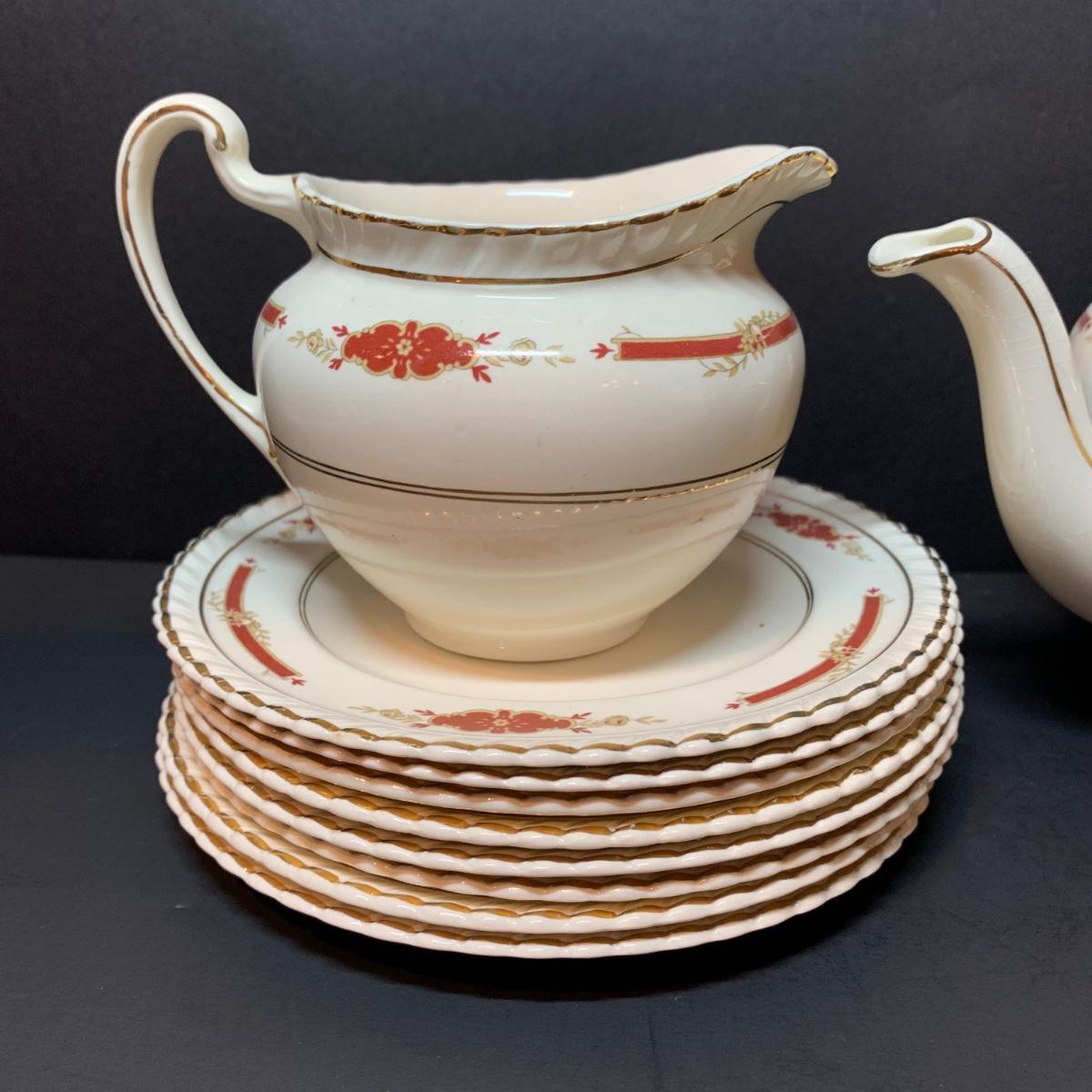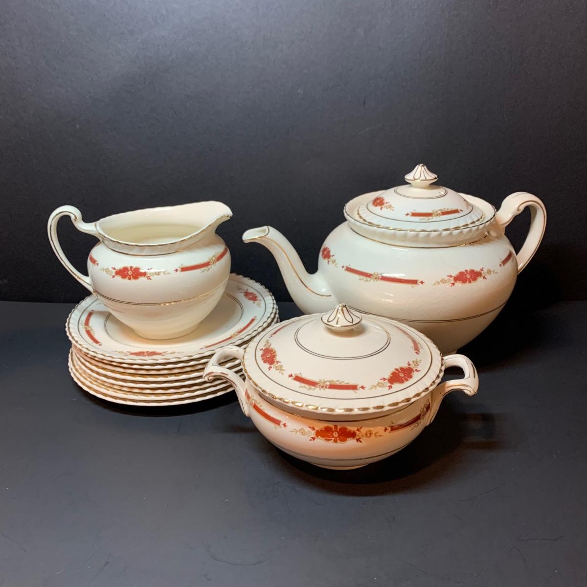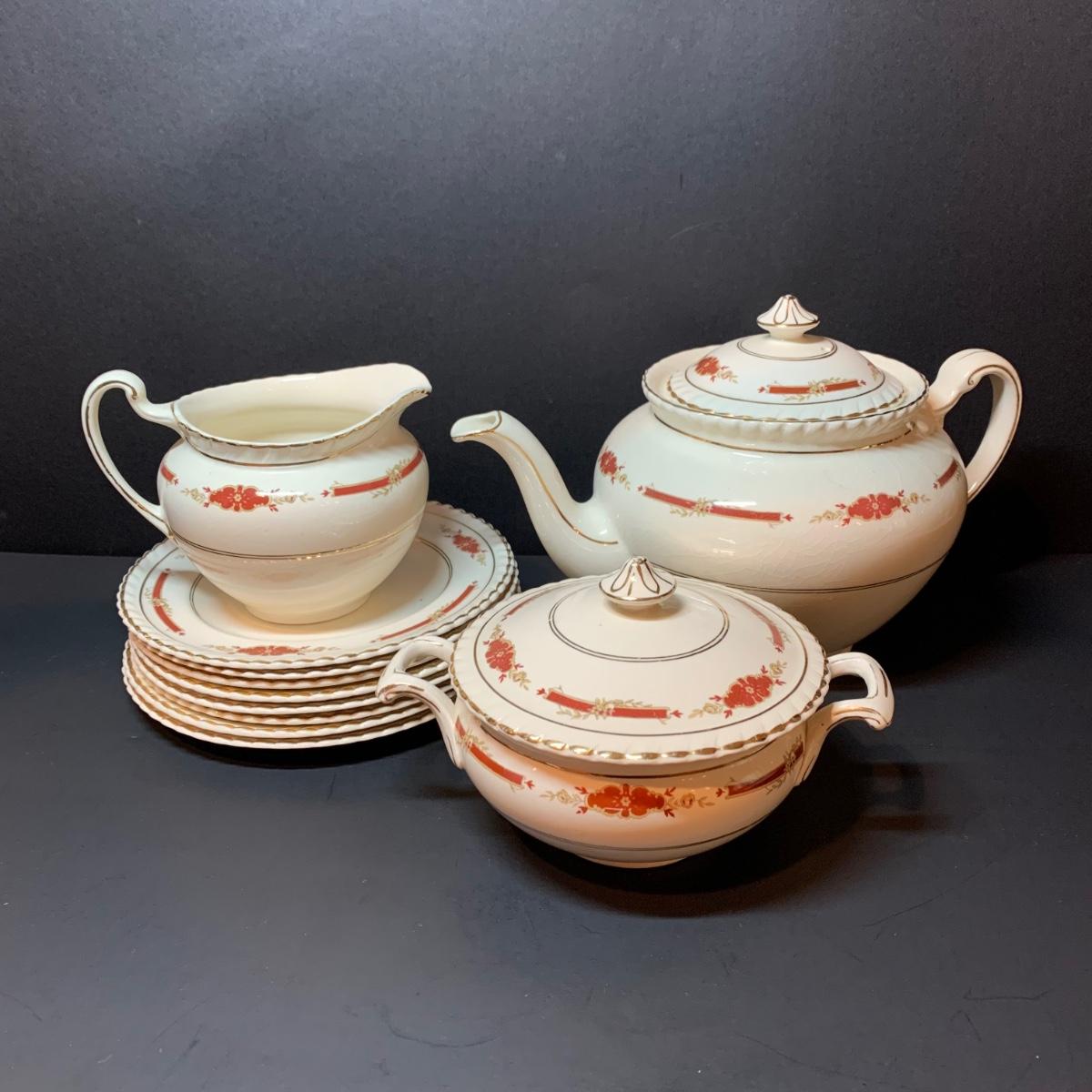 LOT 302R: Vintage Johnson Brothers Old English Guildford Maroon Tea Pot, Dessert Dishes, Sugar & Creamer