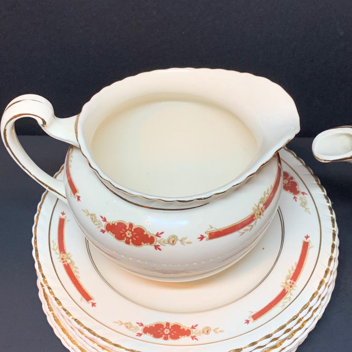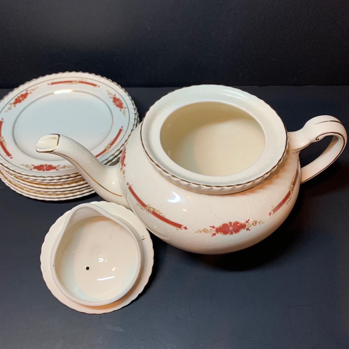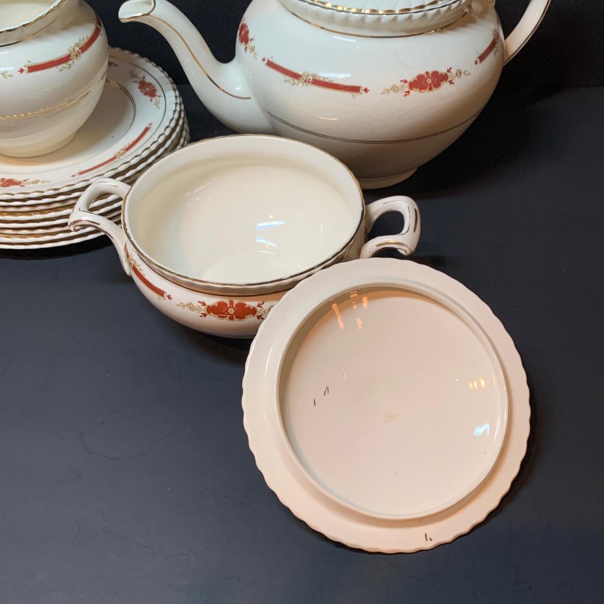 LOT 302R: Vintage Johnson Brothers Old English Guildford Maroon Tea Pot, Dessert Dishes, Sugar & Creamer