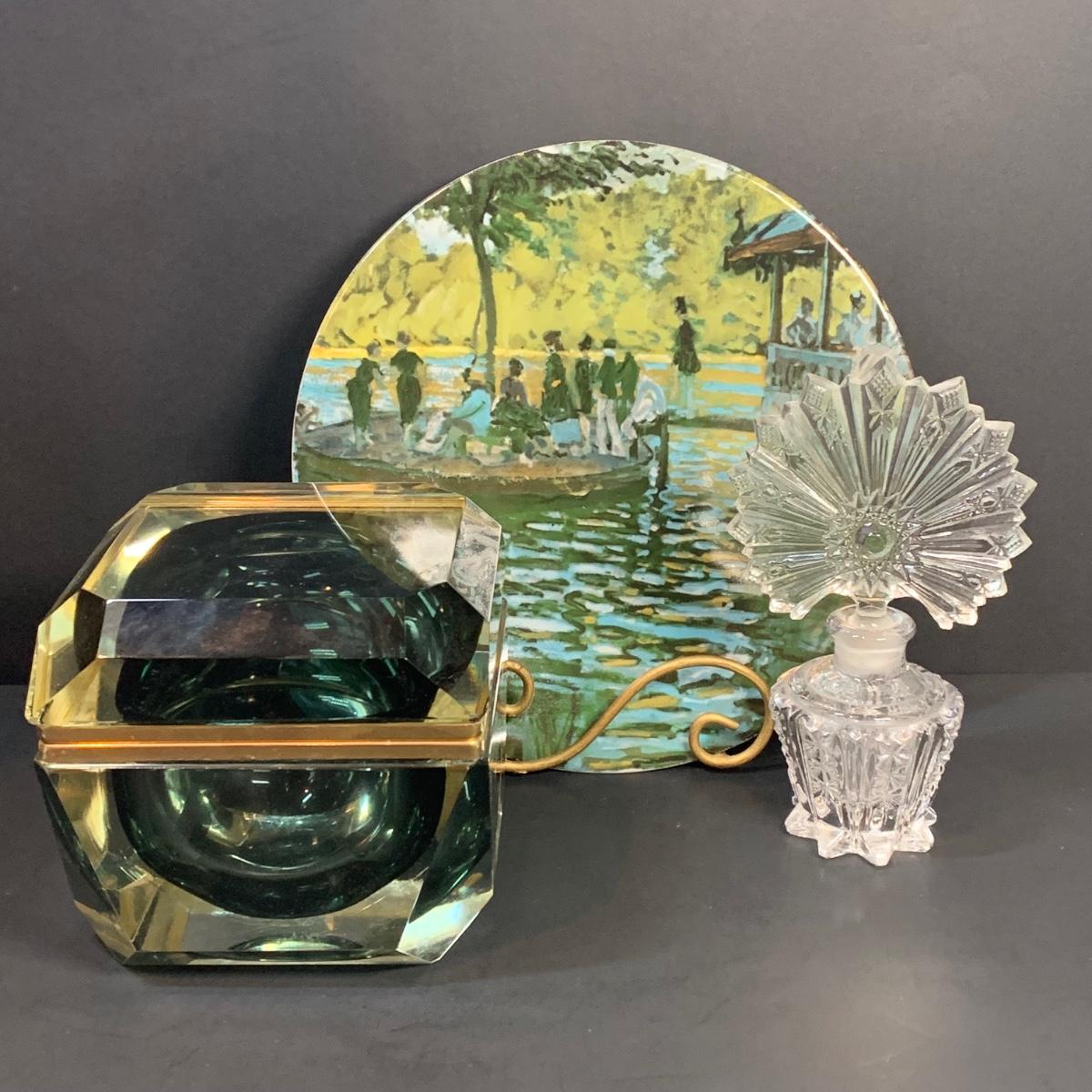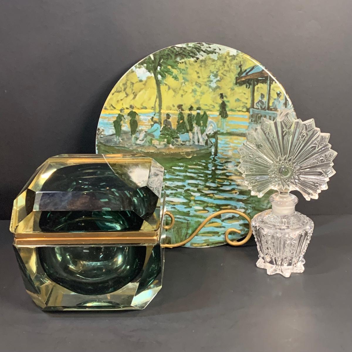 LOT 314R: Vintage Mid Century, Murano Style, Faceted Glass Jewelry Box, Bareuther Waldsassen Bavaria Wall Plate, Perfume Bottle