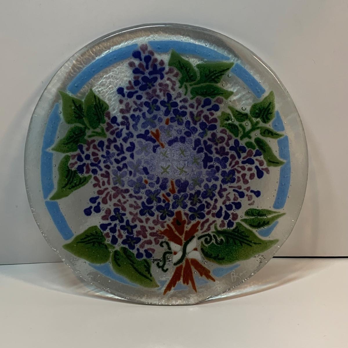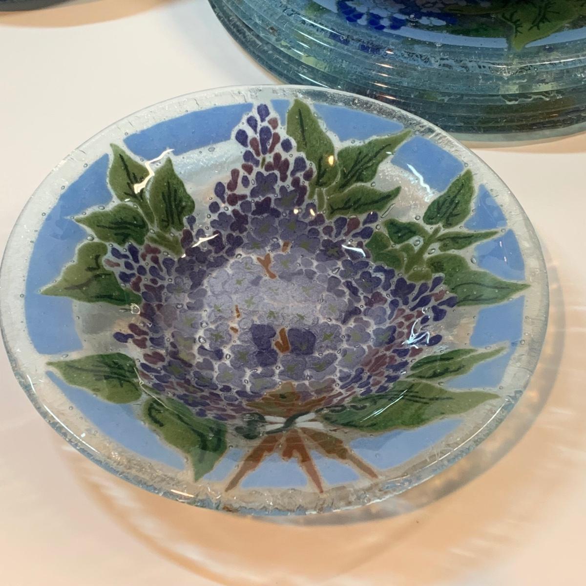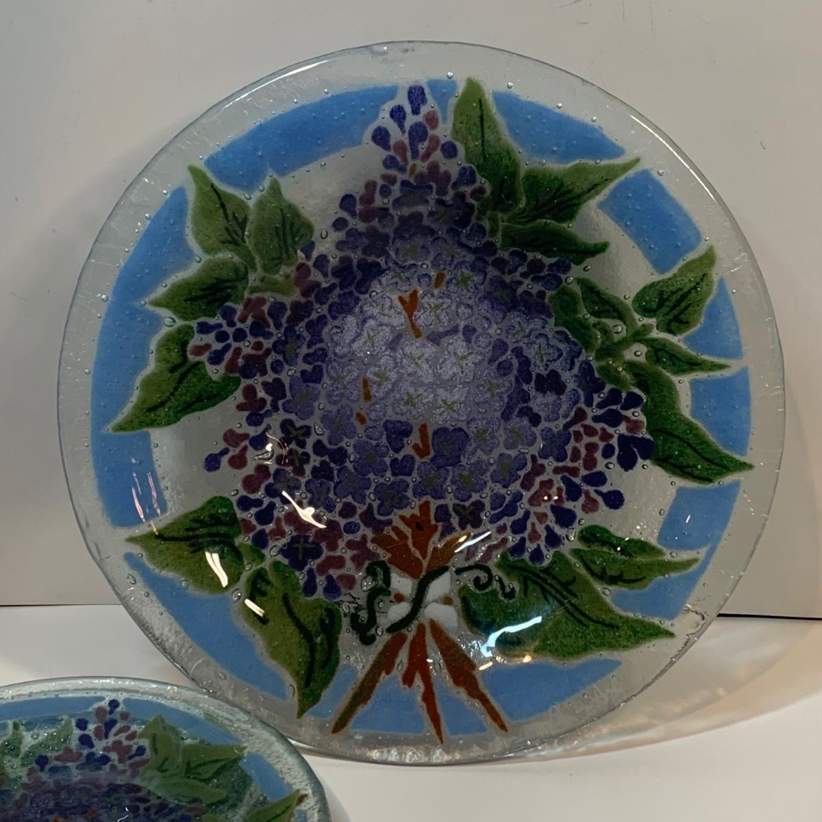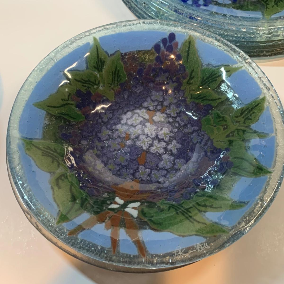 Beautiful art glass dish set featuring purple and white lilacs, all signed by the artist. the artist is believed to be Peggy Karr.
