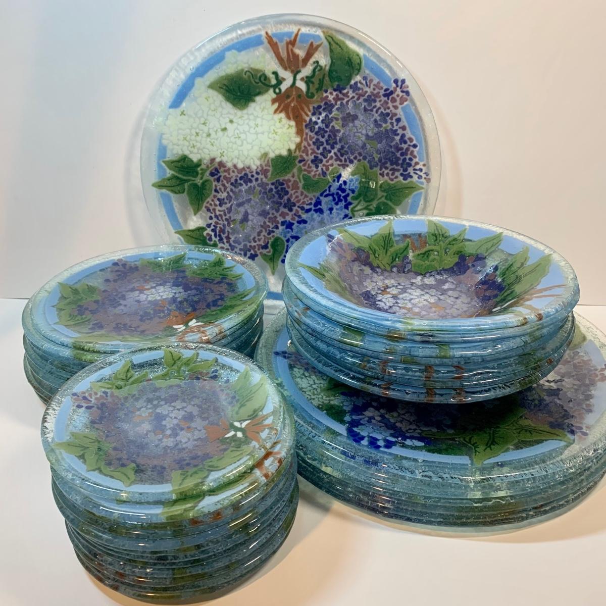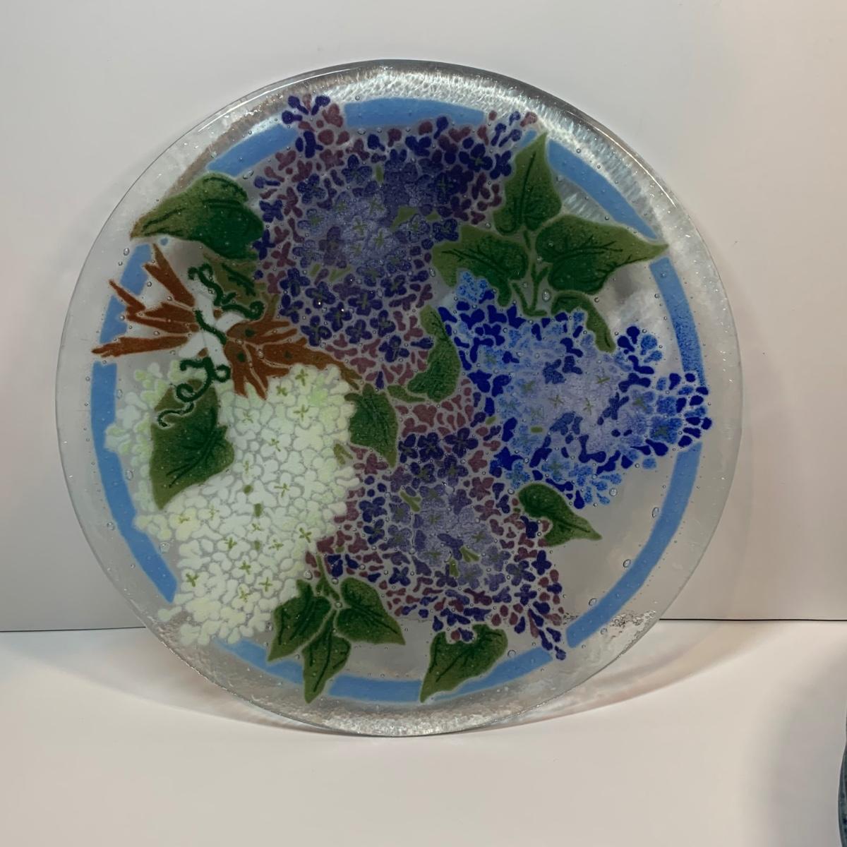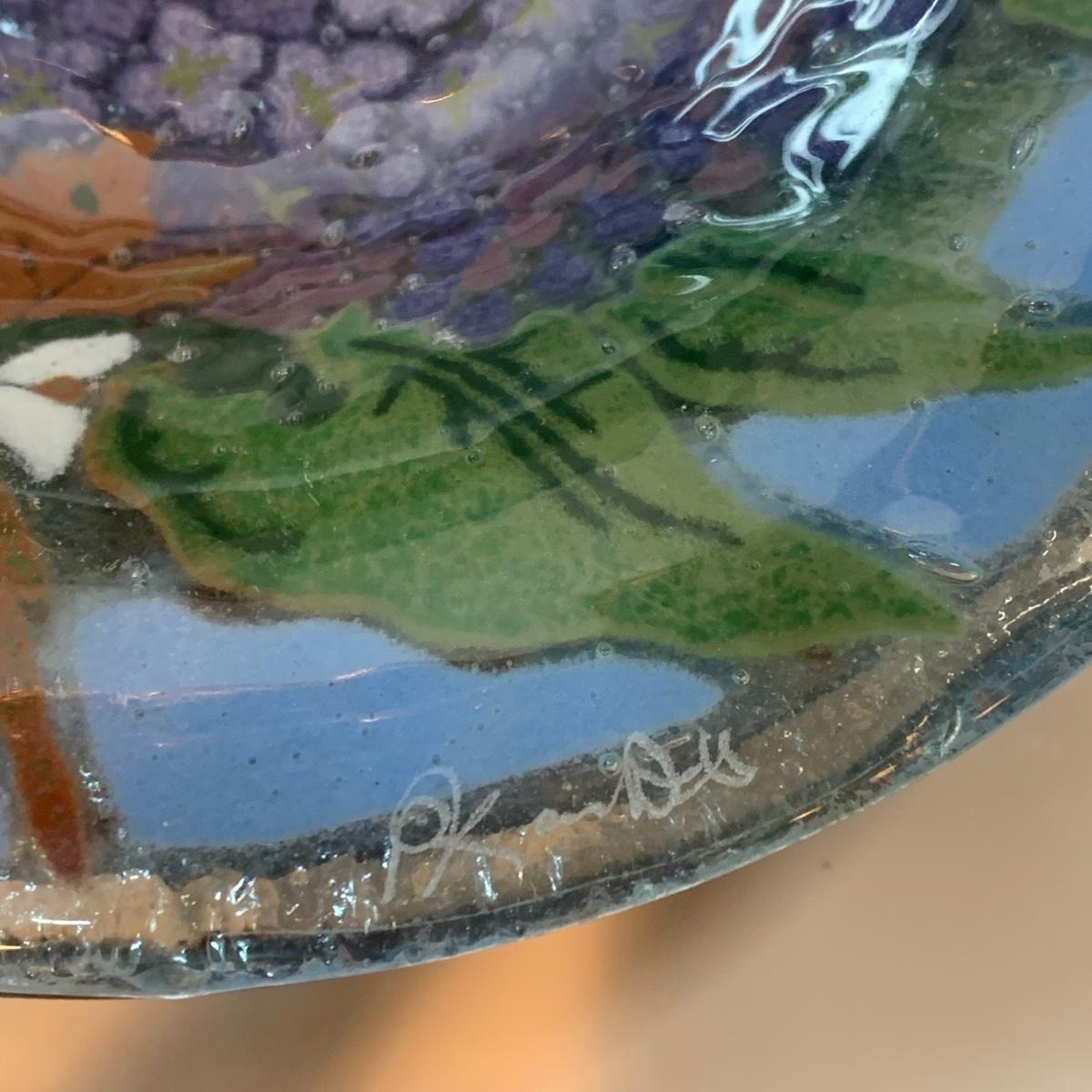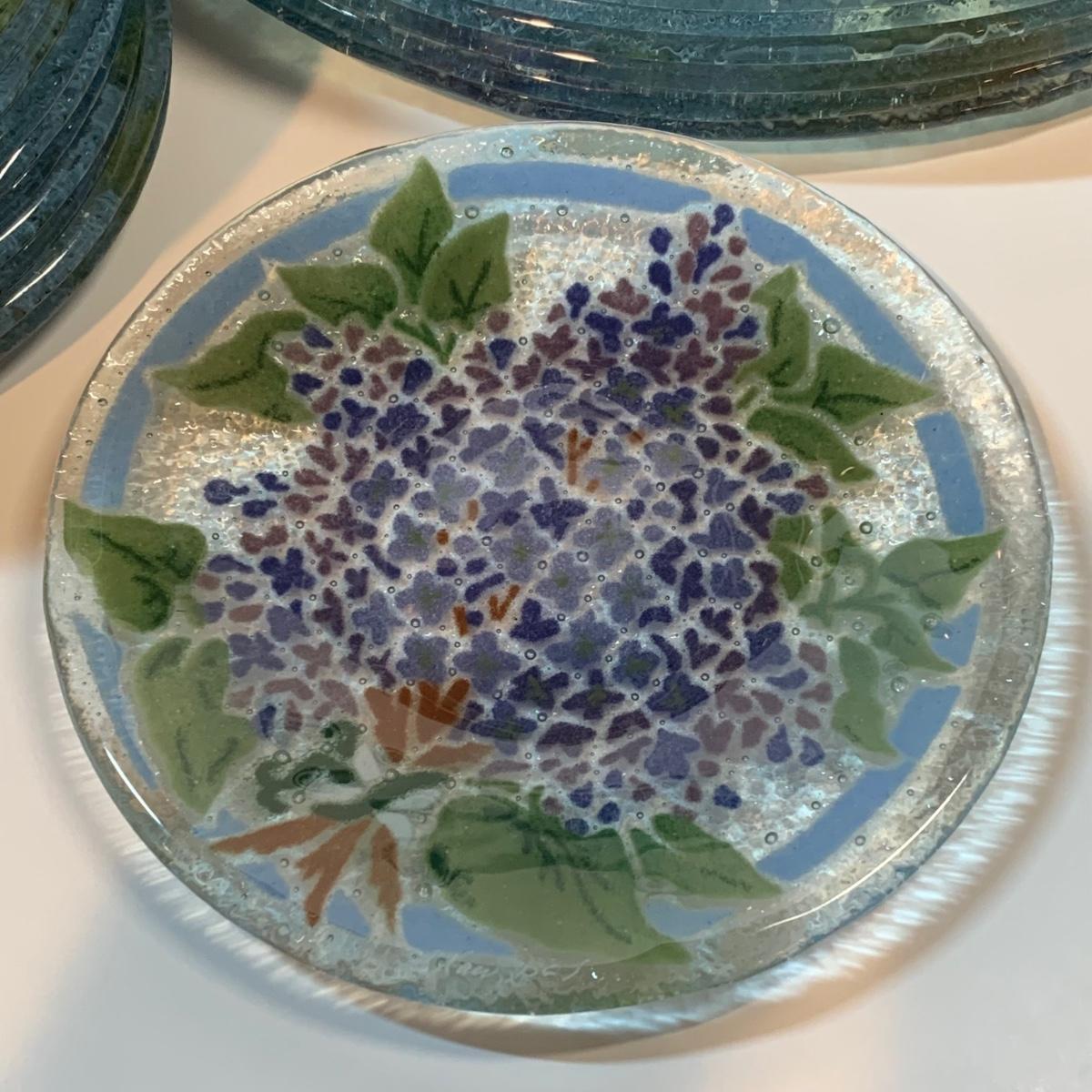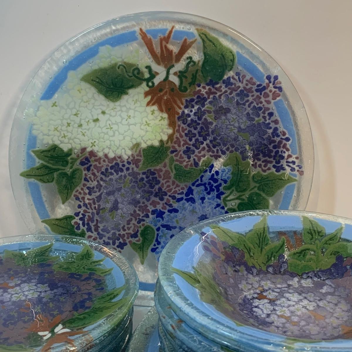 Beautiful art glass dish set featuring purple and white lilacs, all signed by the artist. the artist is believed to be Peggy Karr.