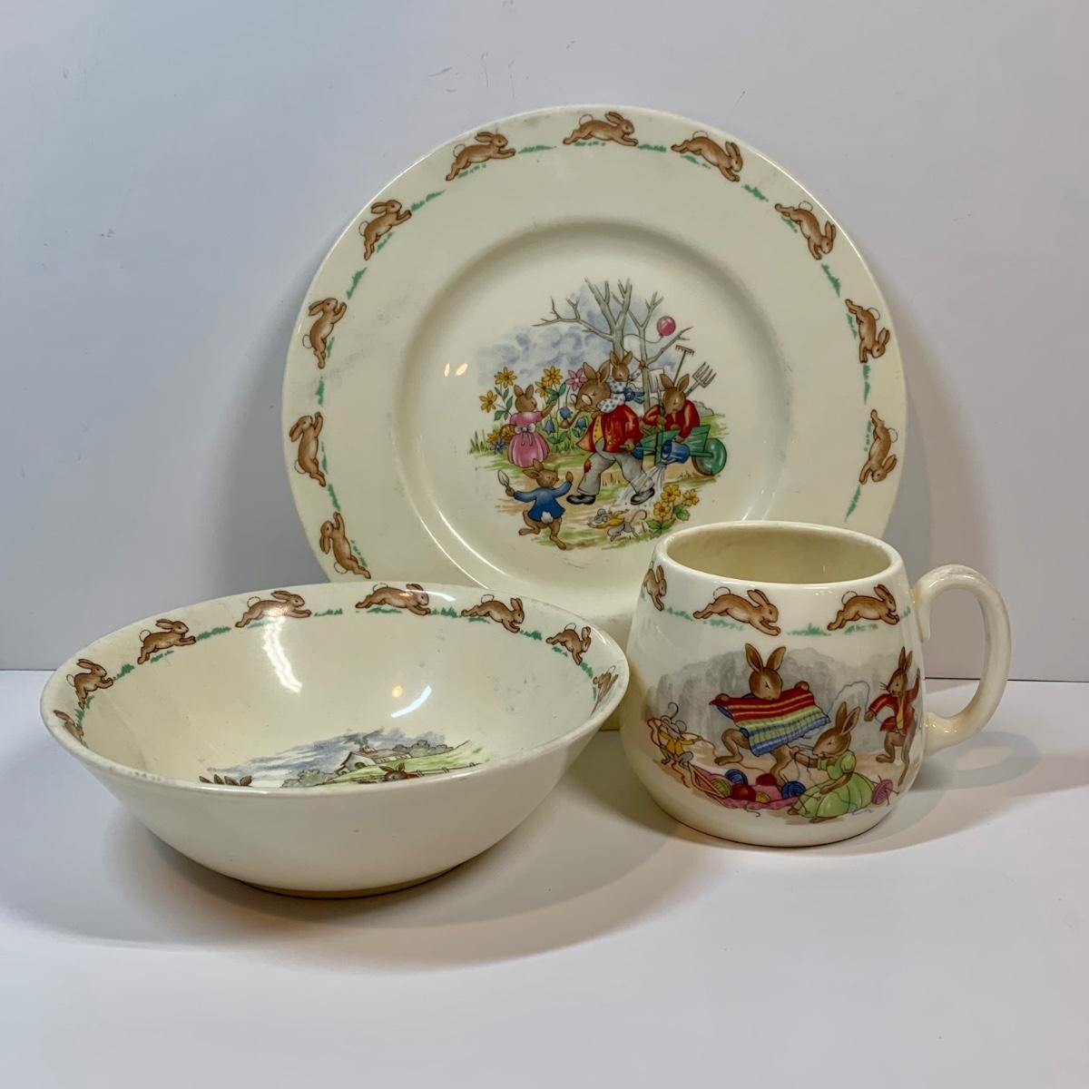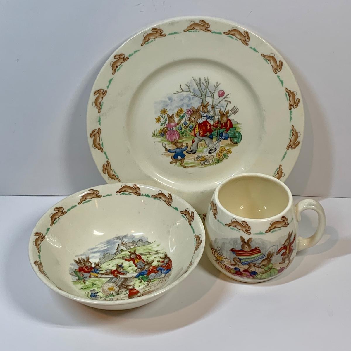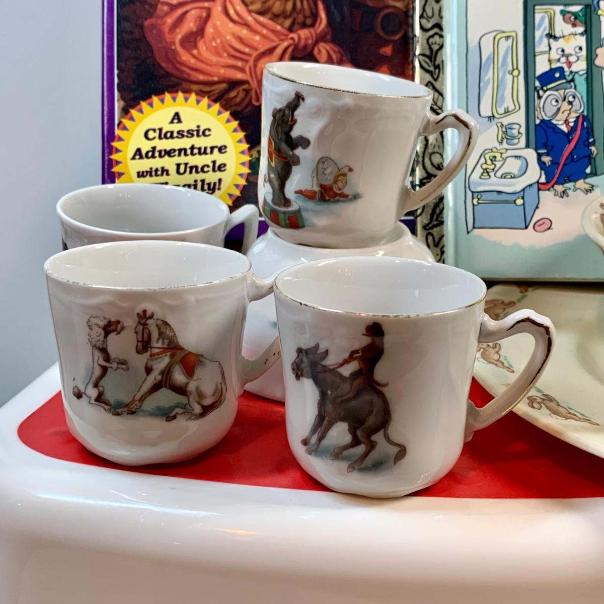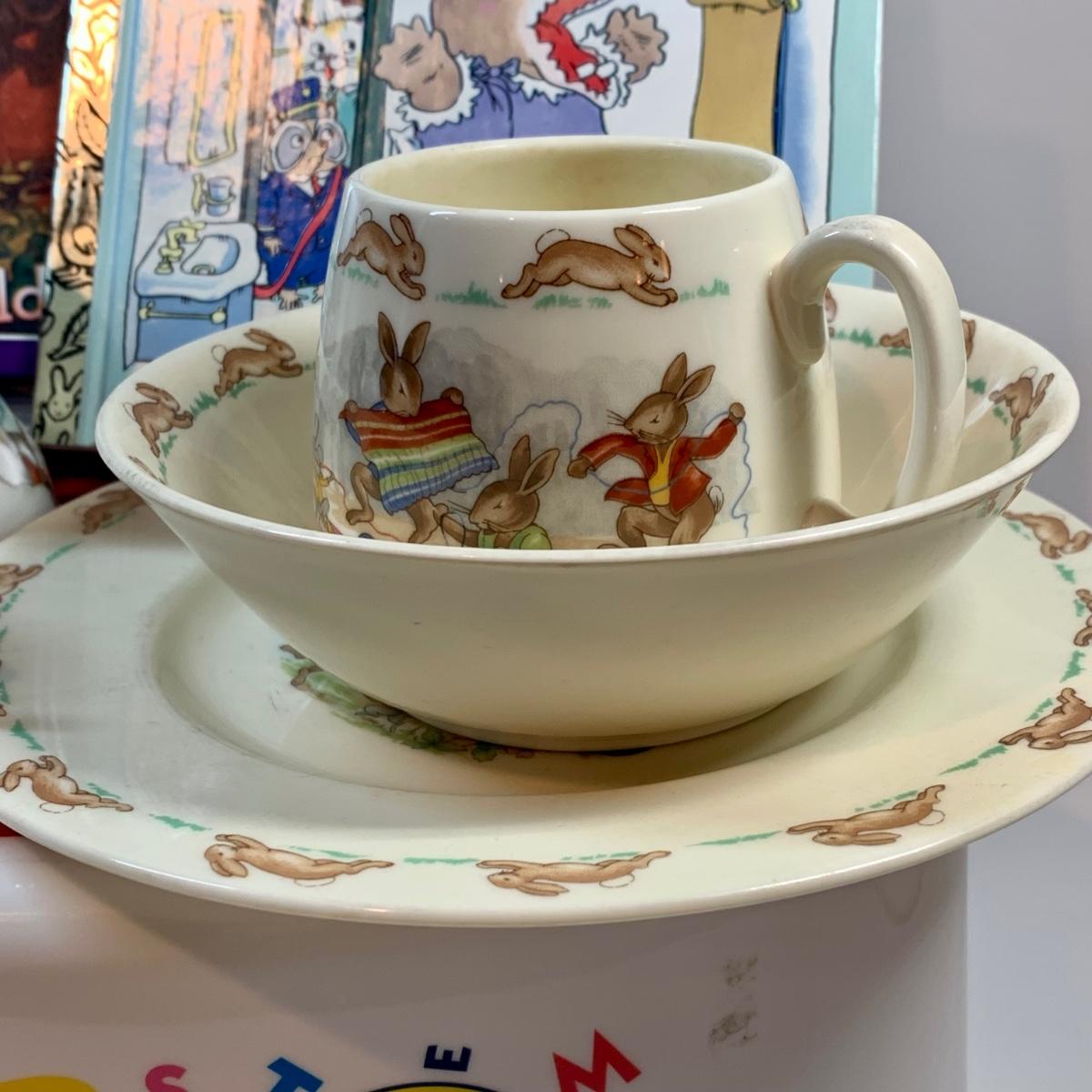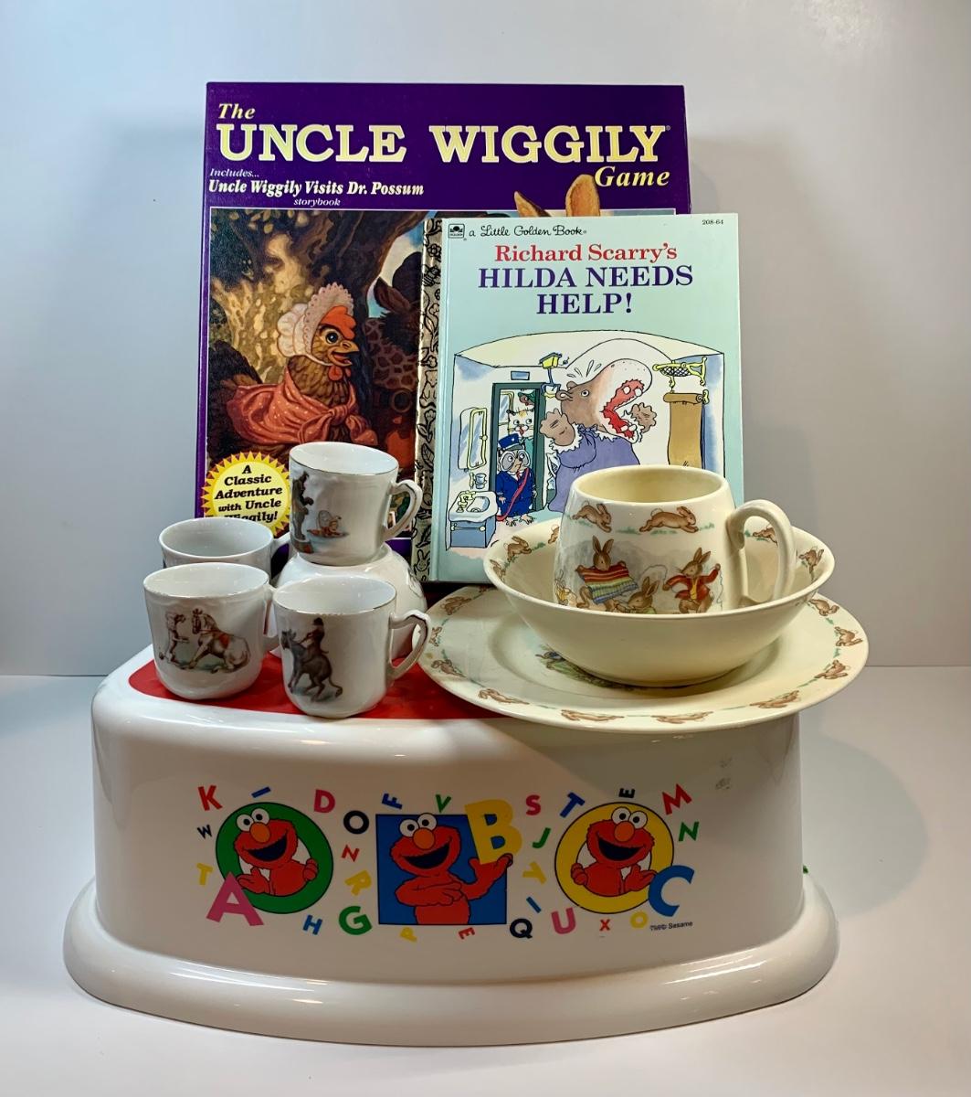 LOT 318R: Sesame Street Step Stool, Royal Daulton "BunnyKins", Childrens China Cups & Bowl, Germany, Uncle Wiggily Game & Richard Scarry's Little Golden Book