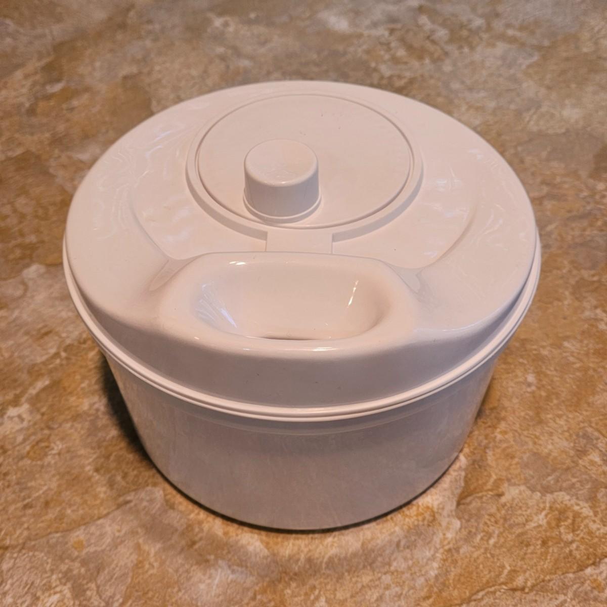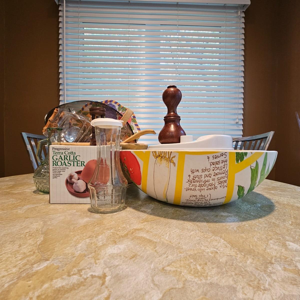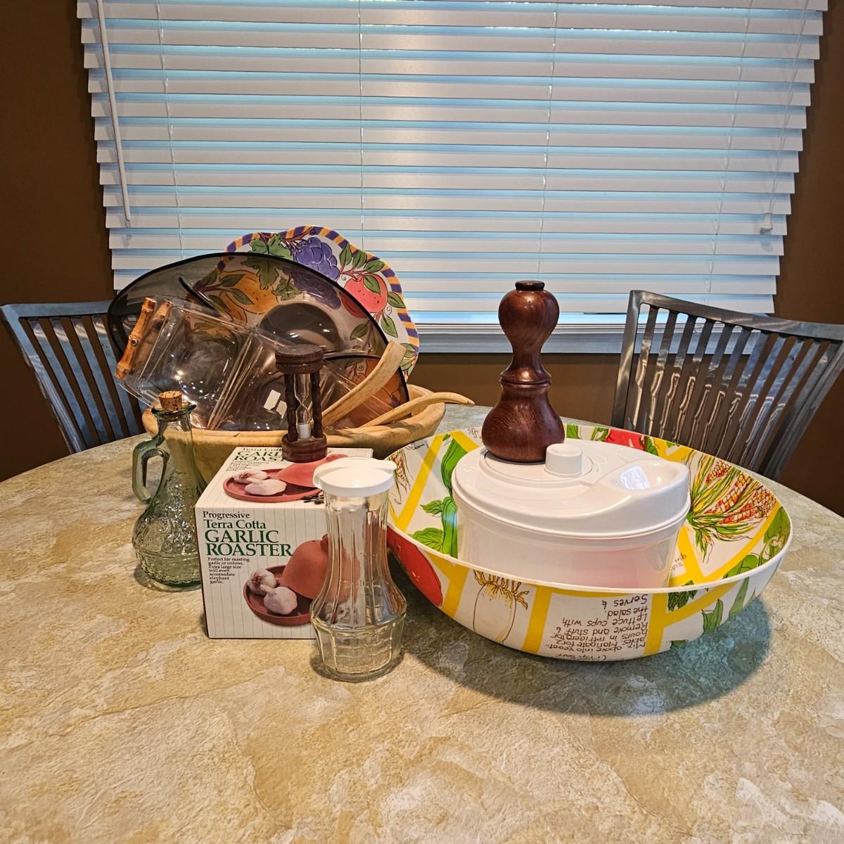 LOT 176S: Collection of Salad Bowls, Salad Spinner, Garlic Roaster, Plastic Serving Ware & More
