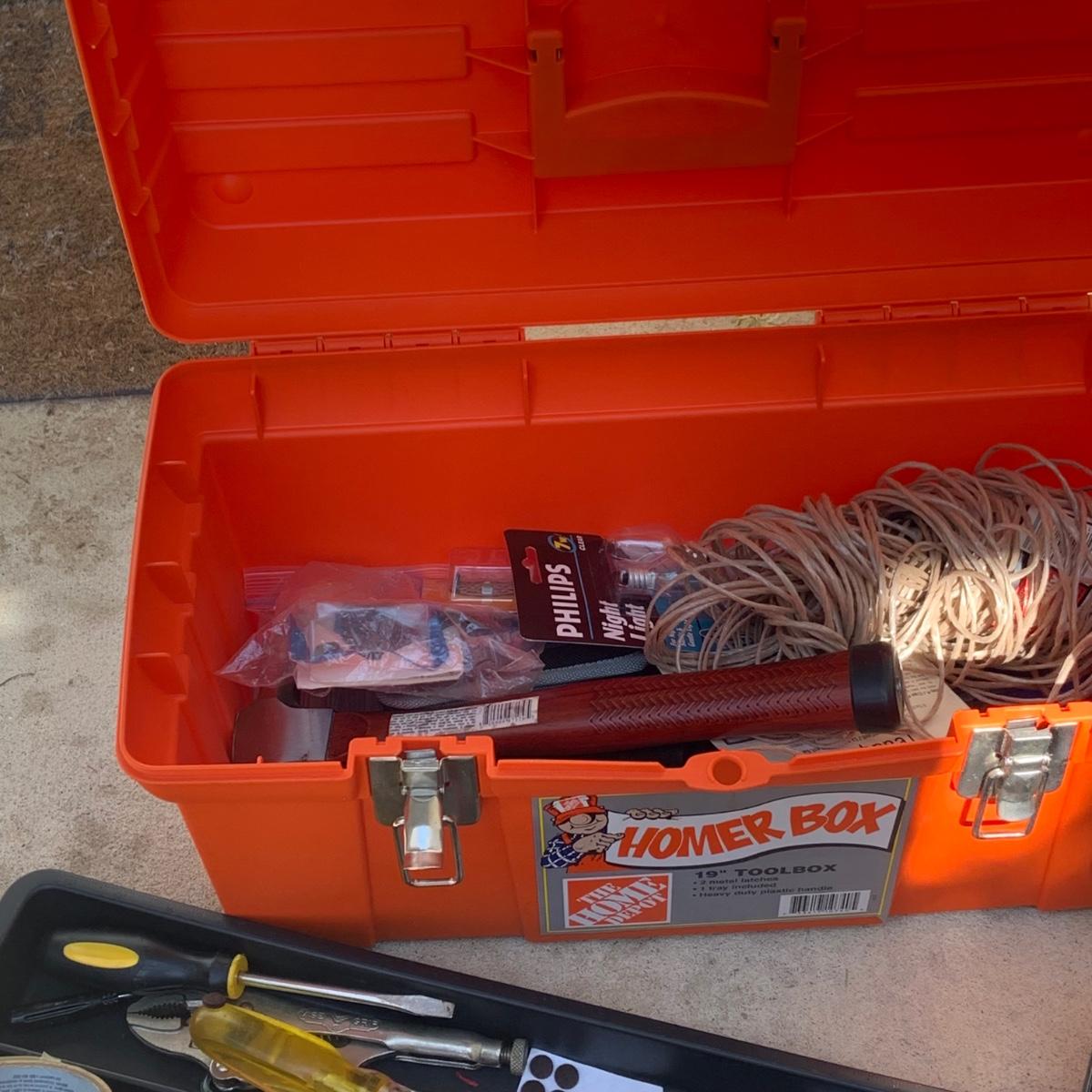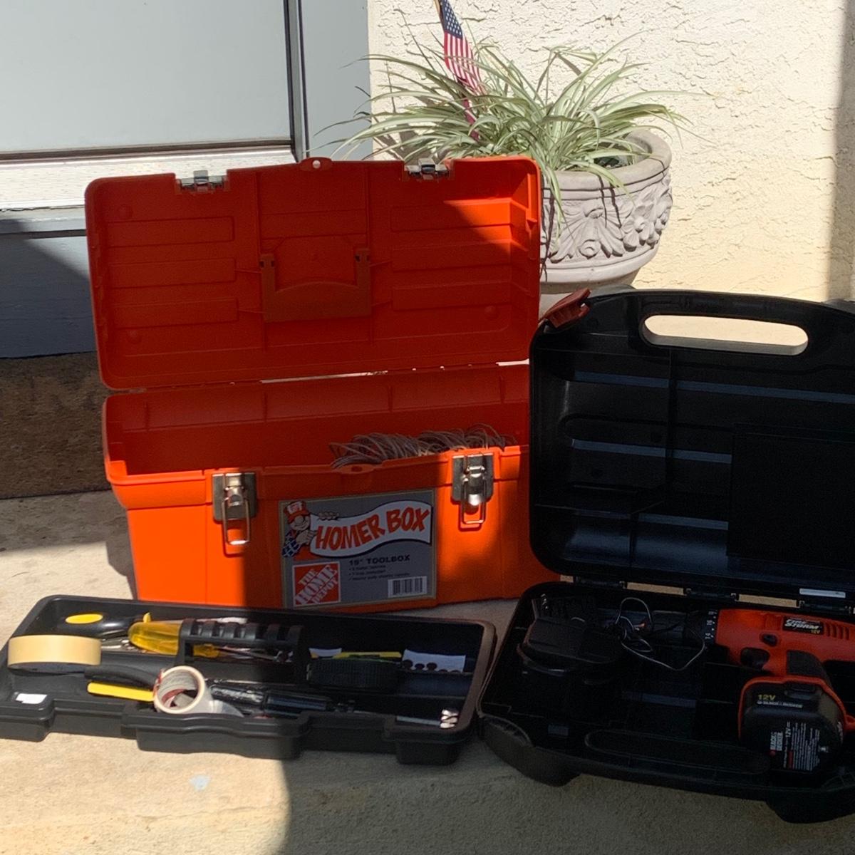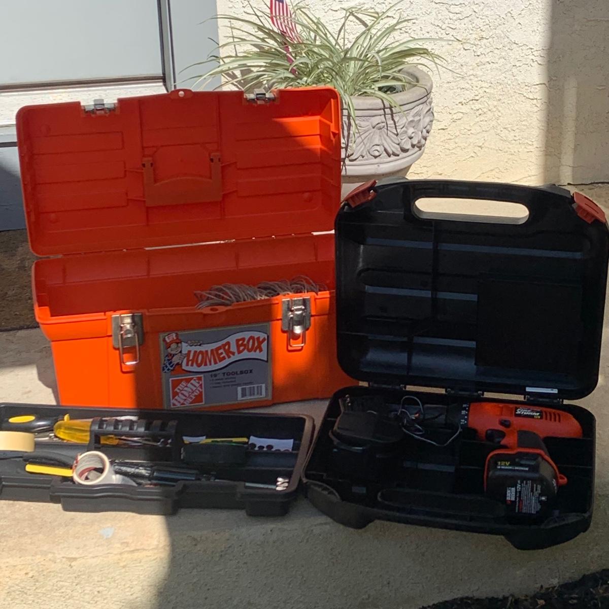 LOT:277G: Tools - Black & Decker Drill, Home Depot Toolbox and Assorted Tools and Such.