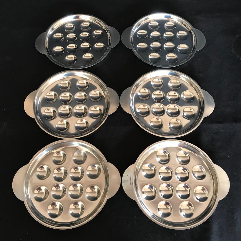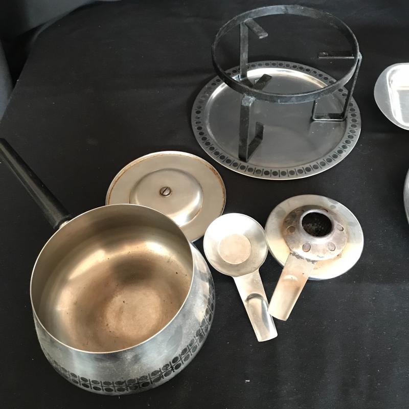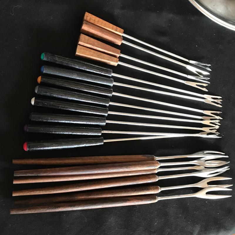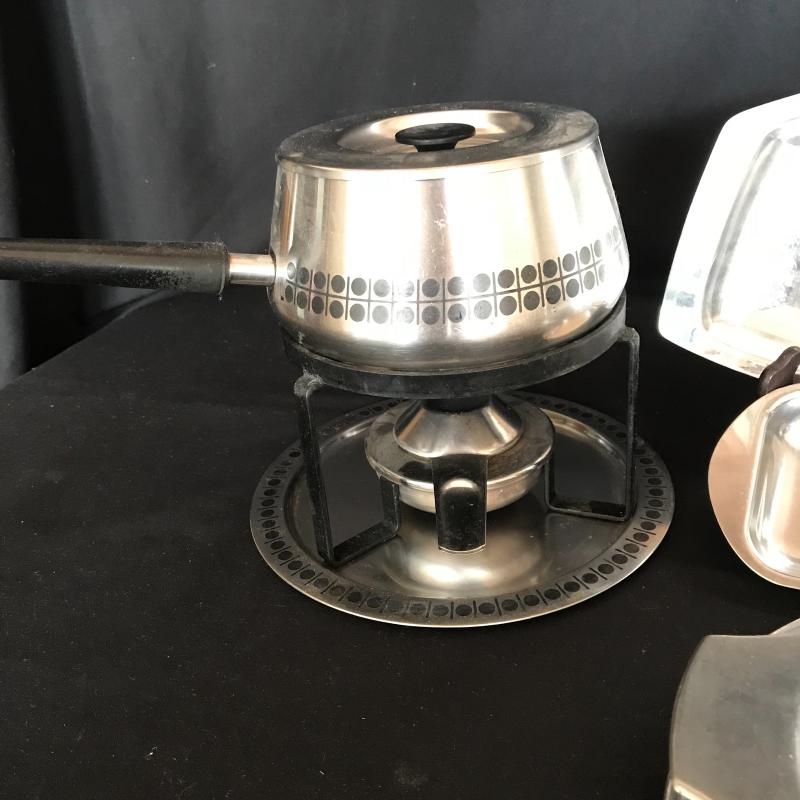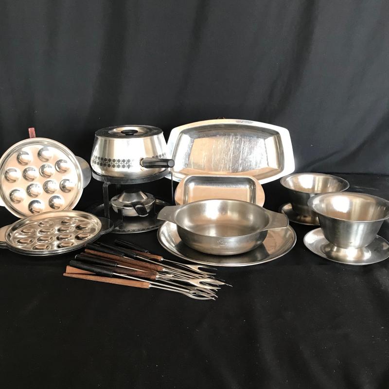 Add some personality to your next party! Mid Century fondue pot with three sets of skewers, four platters, two bowls and six escargot platters. No shipping.
