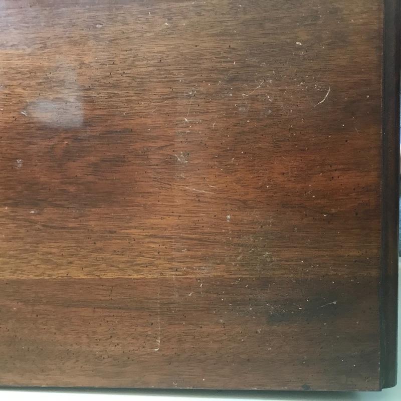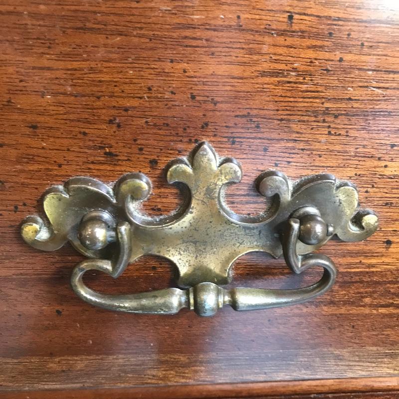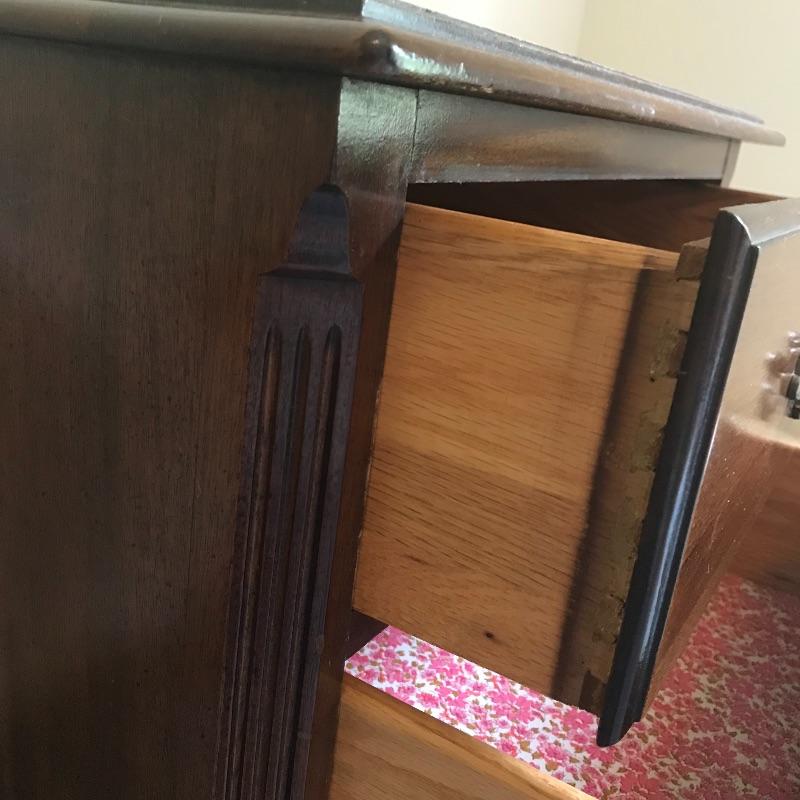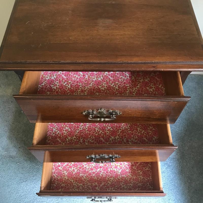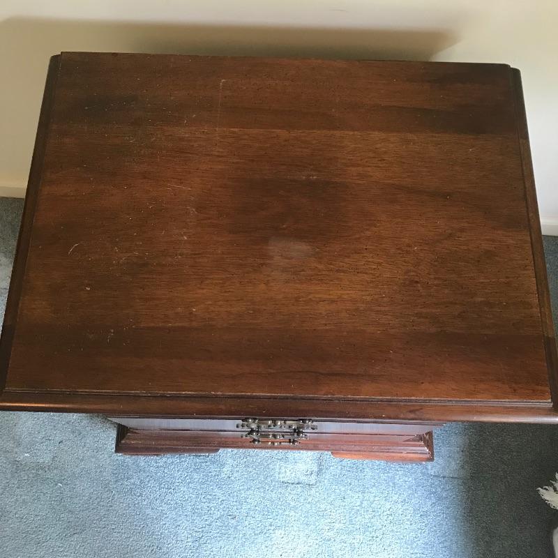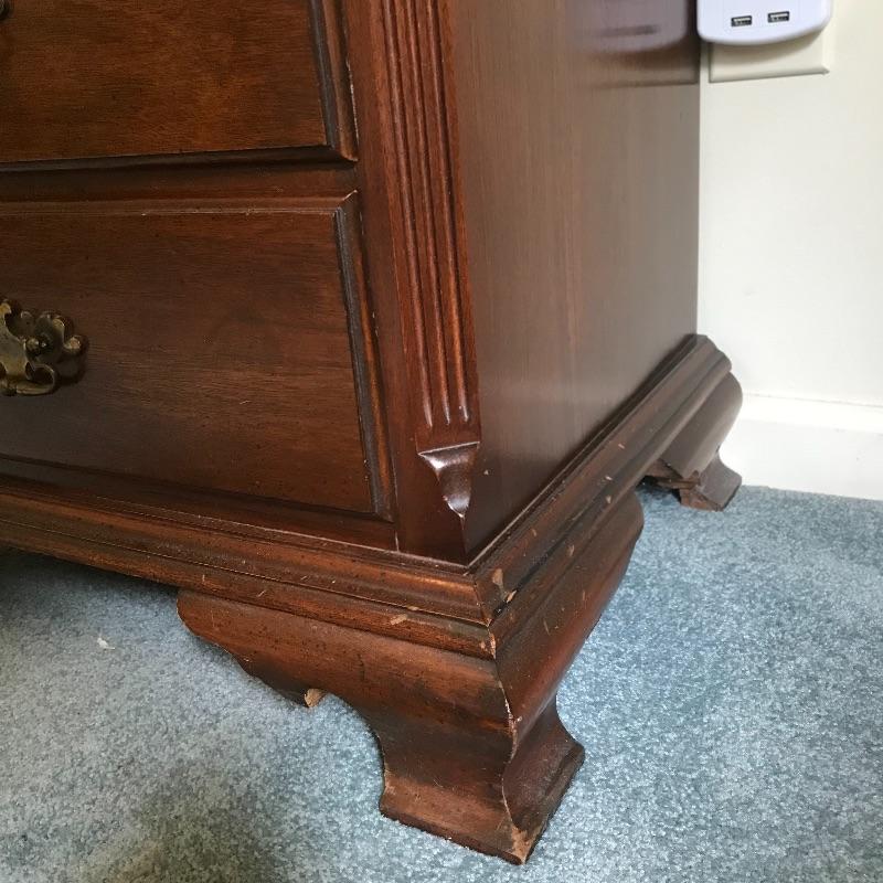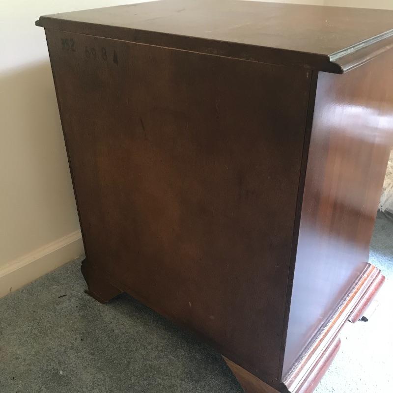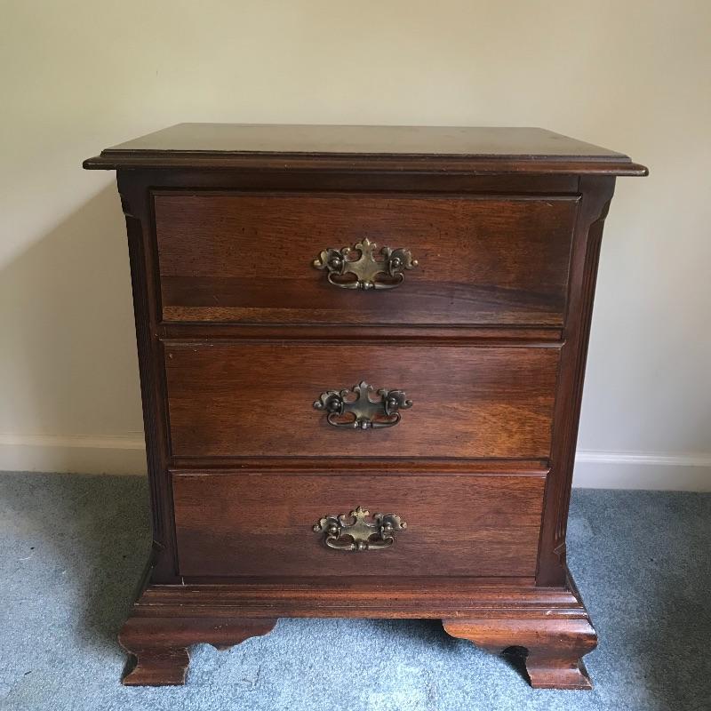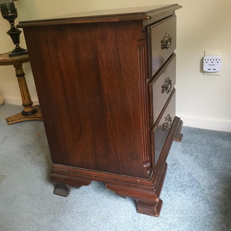 Lovely cherry colored wood bedside table that has 3 nice deep drawers that are dovetail, opening and closing smoothly. Table has moderate wear, mostly near the feet and on the top panel. Piece has brass pulls and measures approximately 22” x 16” x 25.5”. Local Pickup Only.