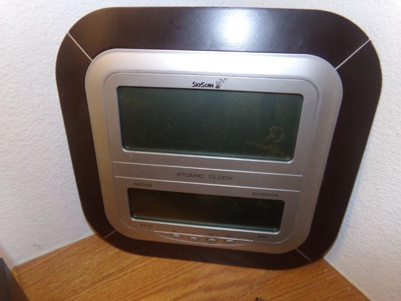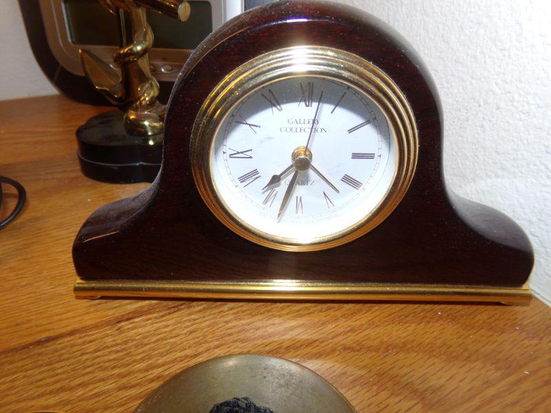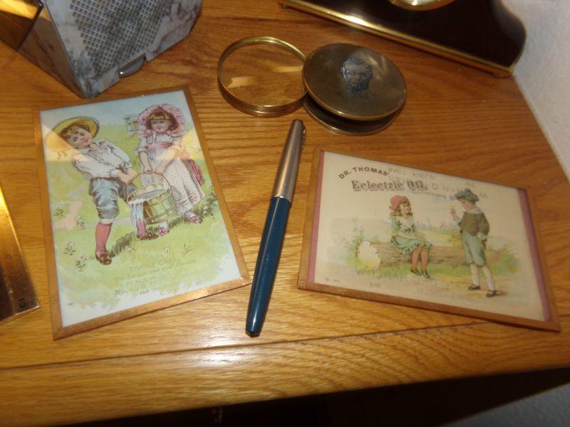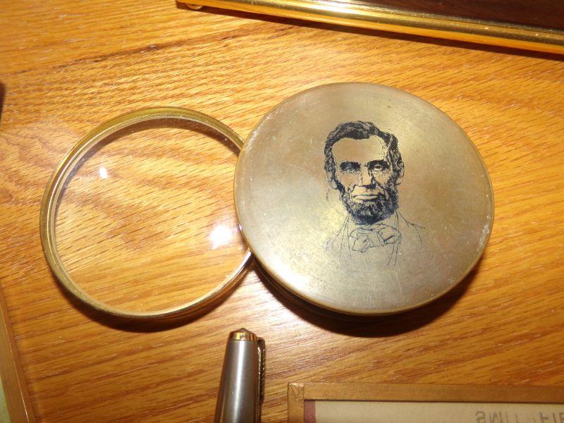 BRASS ANCHOR PAPERWEIGHT, DIGITAL PICTURE FRAME, ATOMIC CLOCK, PANASONIC ALARM CLOCK RADIO, FOUNTAIN PEN, ABE LINCOLN BRASS MAGNIFYING GLASS, RULERS AND OLD POSTCARDS