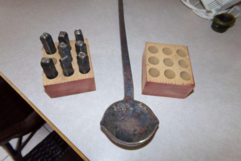 LOT 94  PRINT METAL STAMPS AND CAST IRON LADLE