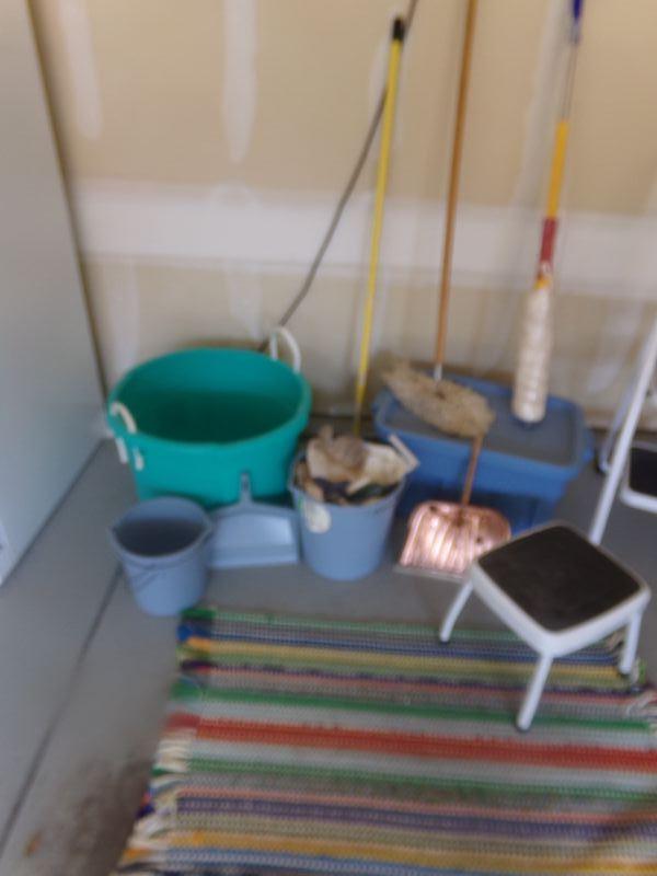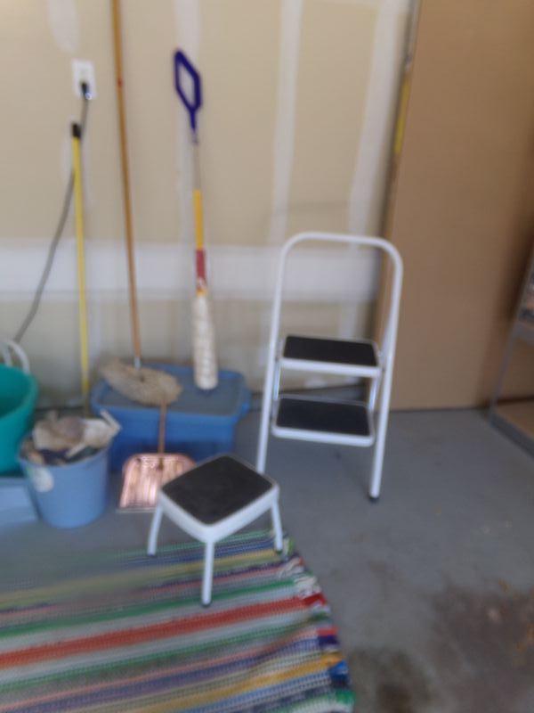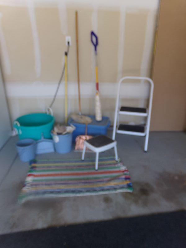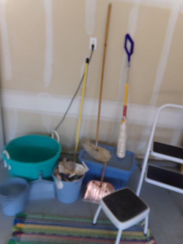 MOPS, BUCKETS, ONE STEP AND TWO STEP STOOLS. DUSTPAN