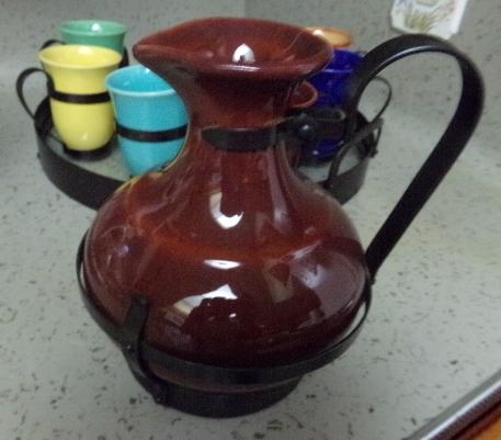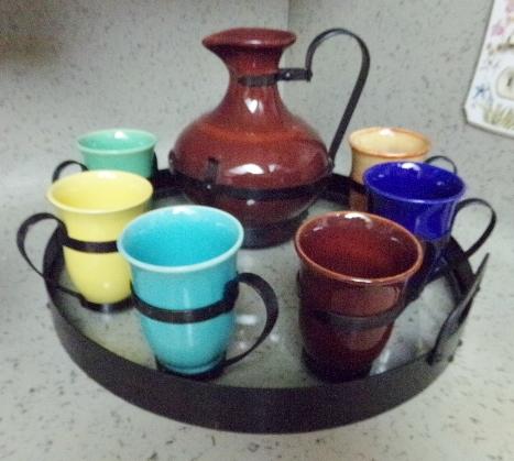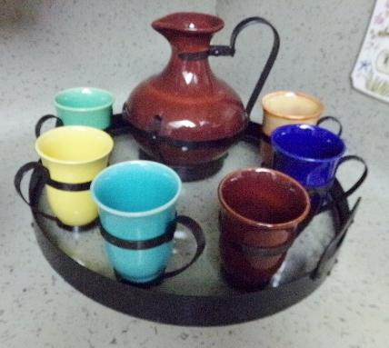 6 MUGS WITH METAL HANDLE AND CARAFE ALL ON AN IRON FRAMED TRAY WITH GLASS BASE