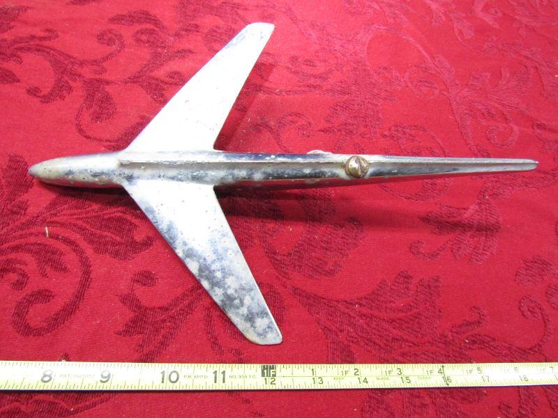 THE FINISH ON THIS HOOD ORNAMENT IS SPOTTY AND THERE'S SOME RUST UNDERNEATH BUT NOT DENTS OR BREAKS SEEN