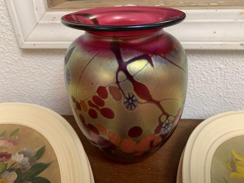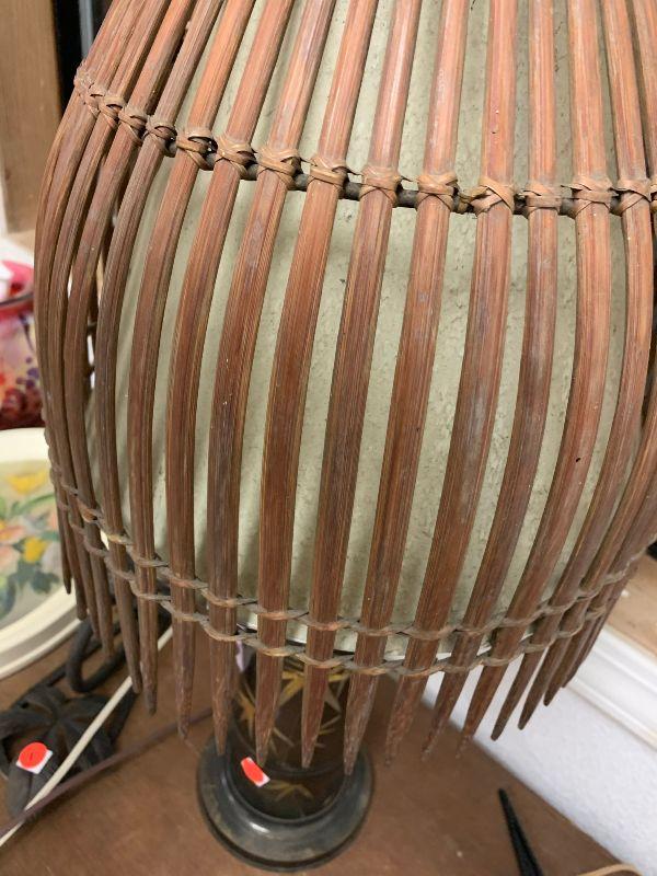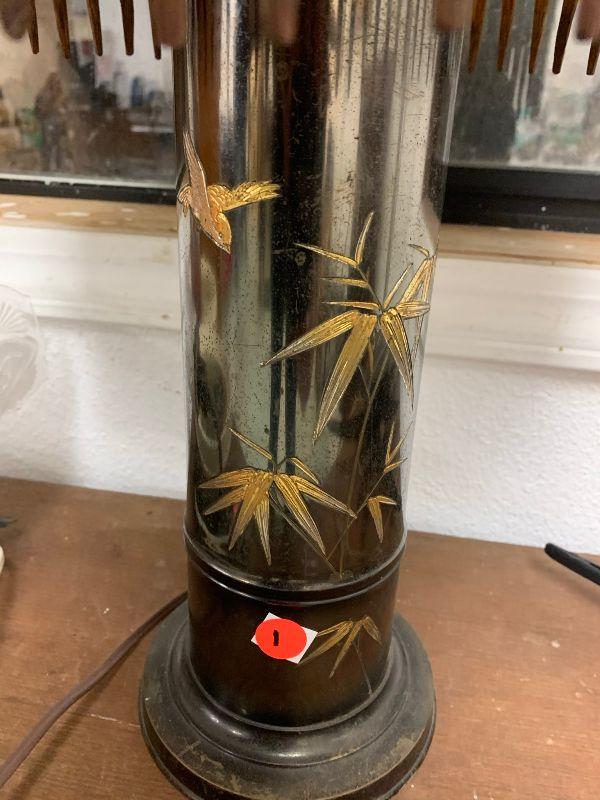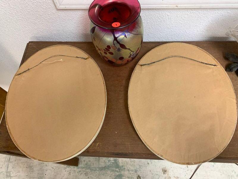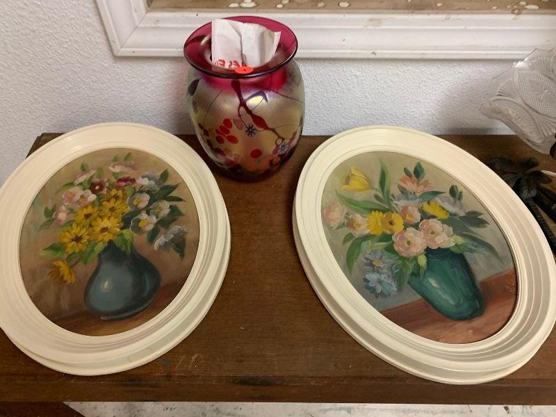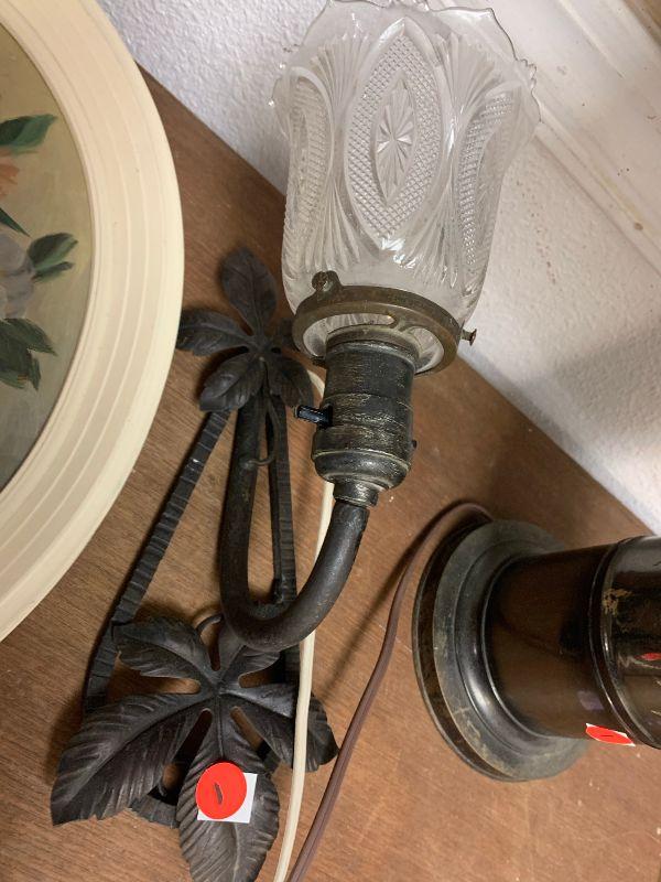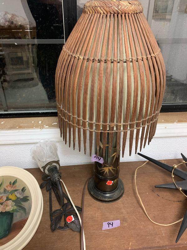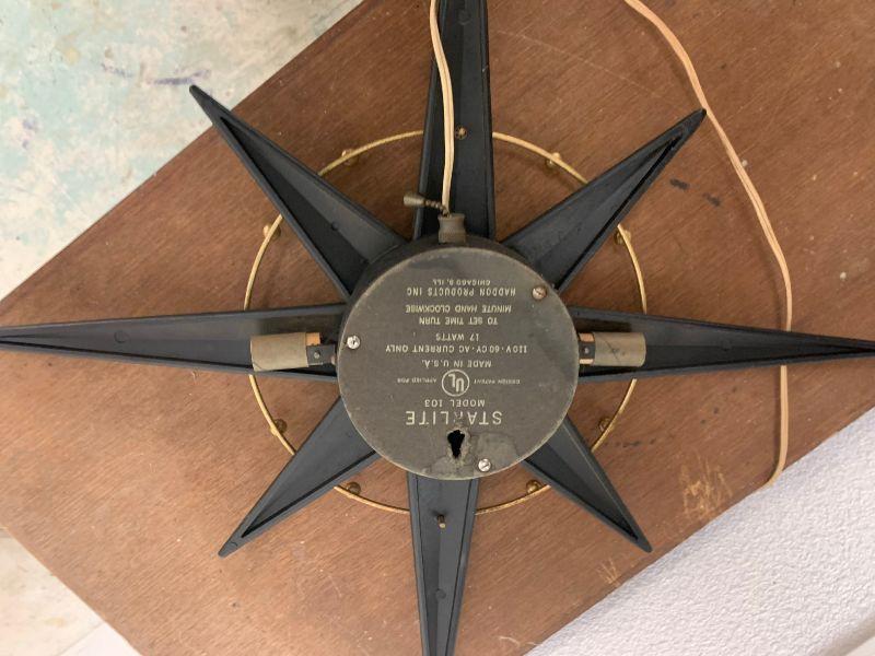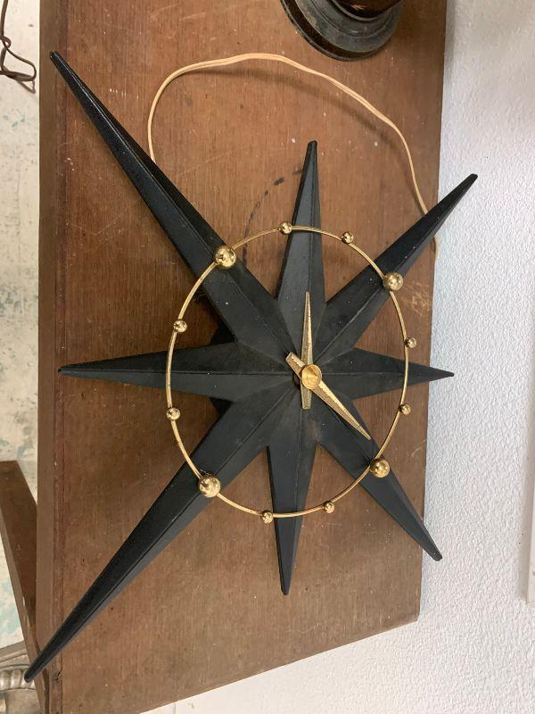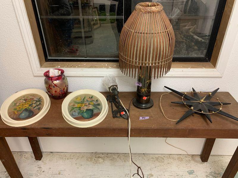 Mid-century star clock, vase, wall lamp, 2 round pictures, and a very nice oriental lamp with neat shade