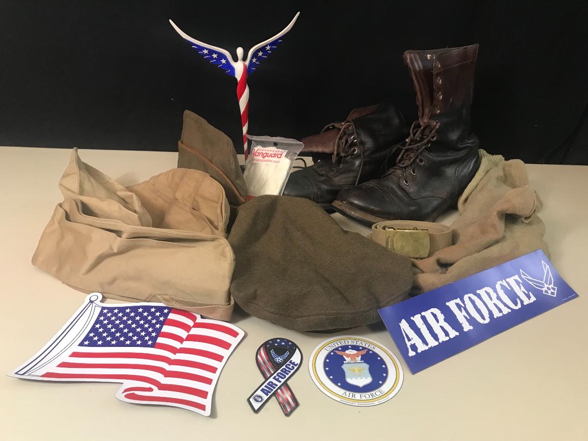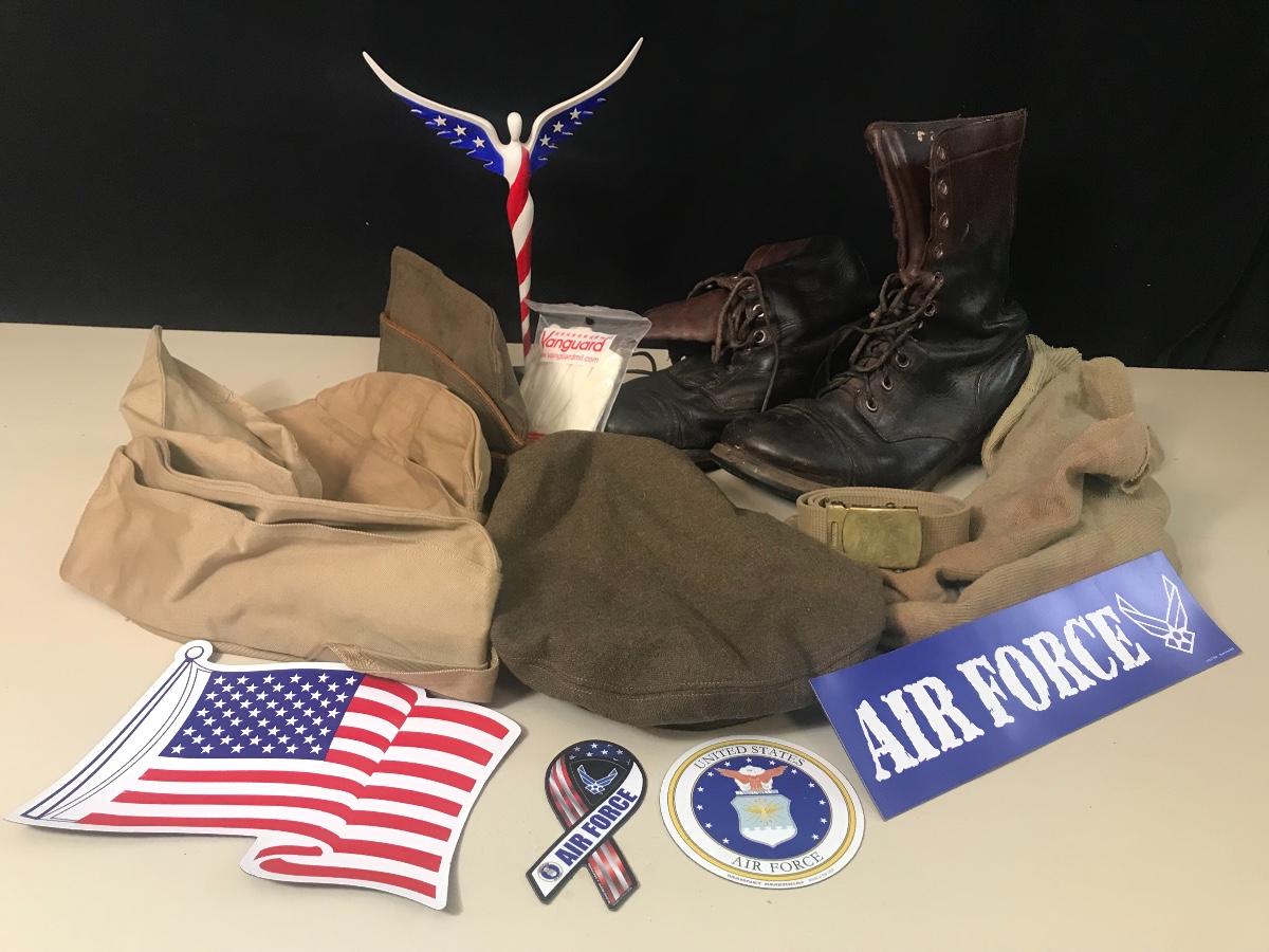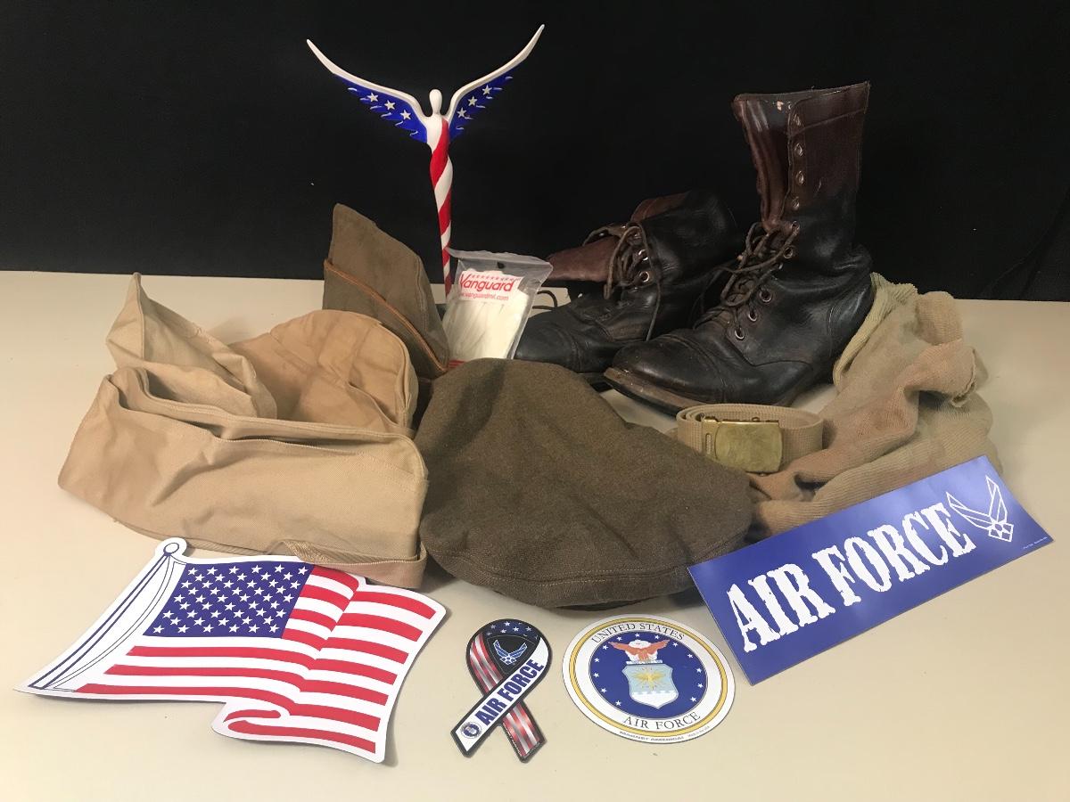 Vintage Militaria - Air Force Uniform Items Caps Boots & More. Please see all pictures as they are the best representation of the items. The pictures show condition, measurements if taken, and what is included in the lot. Due to the large amount that we photograph and the time frame, we are not always able to take measurements. All items unless noted, are pre-owned and have been used. If you purchased furniture, you must bring help. We do not allow one person to carry large furniture out on their own. Bring help, tools and a truck for the safety of our client’s homes, and your personal safety. Company policy. Thank you.