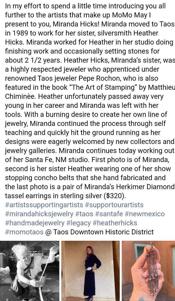 Her sister, Miranda apprenticed under her and inherited her tools after Heather's passing. Miranda is a very successful Silversmith in Taos today and has Hollywood clients.