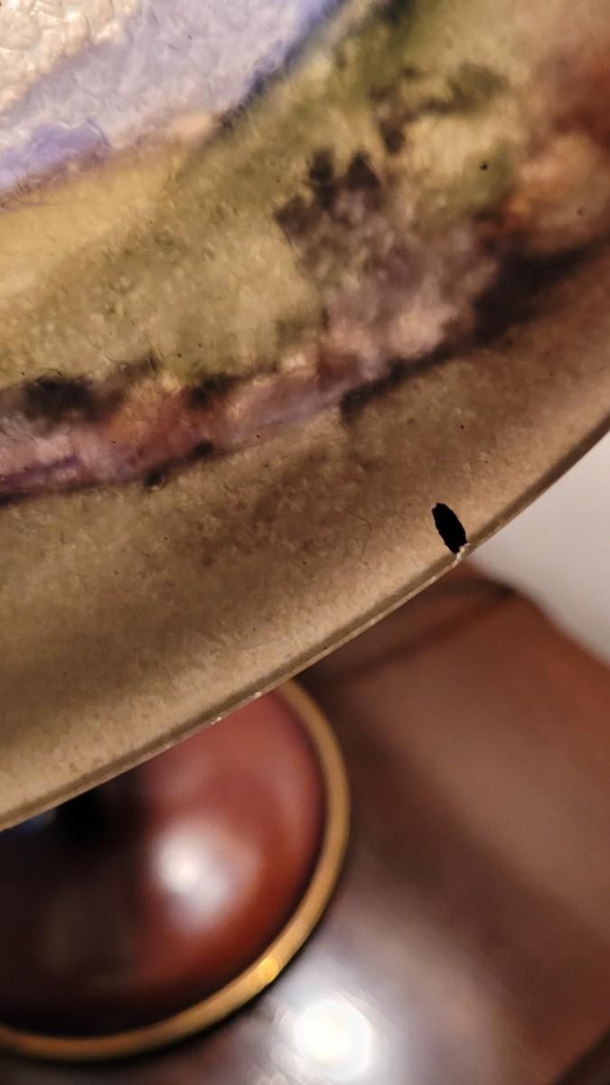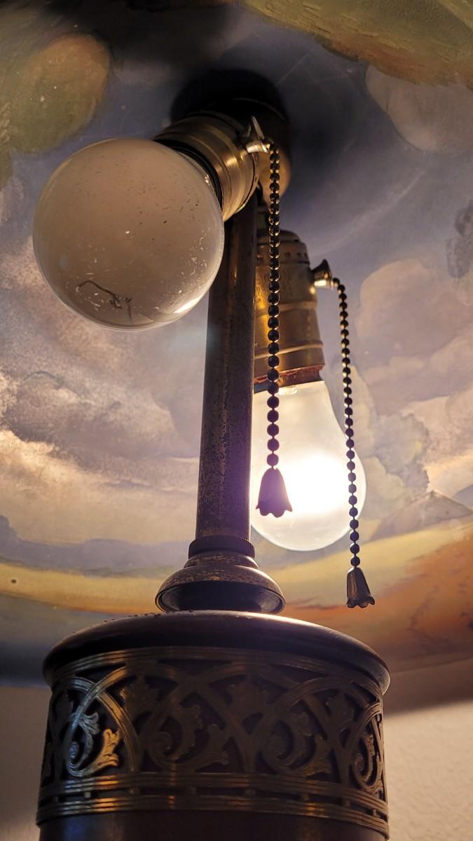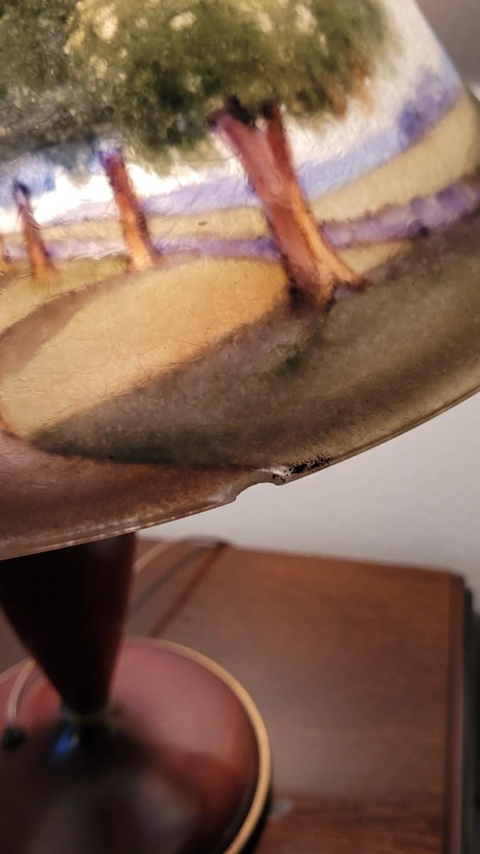 Shade has a few chips on the rim. Signed C. DURAND on the shade. The top metal piece that secures the shade and creates the finished look is missing but finial holds it.