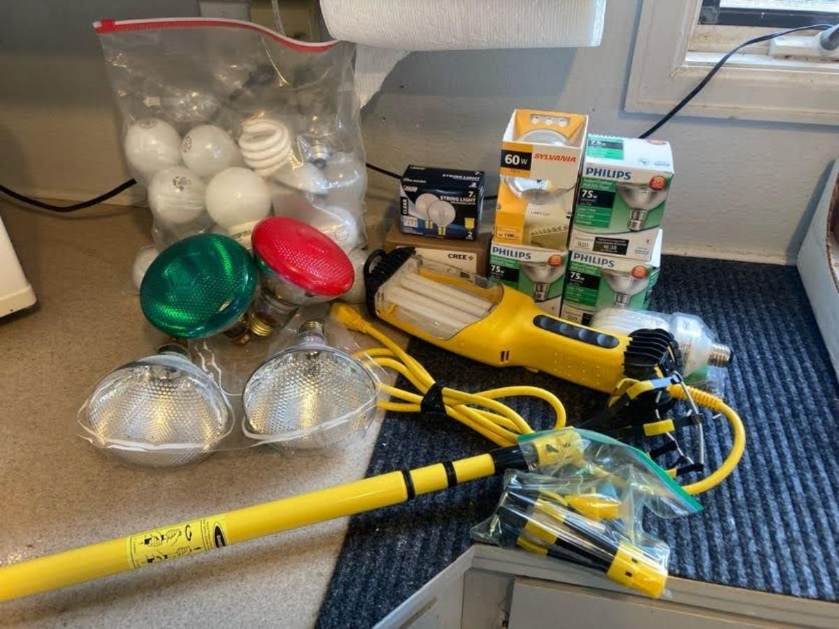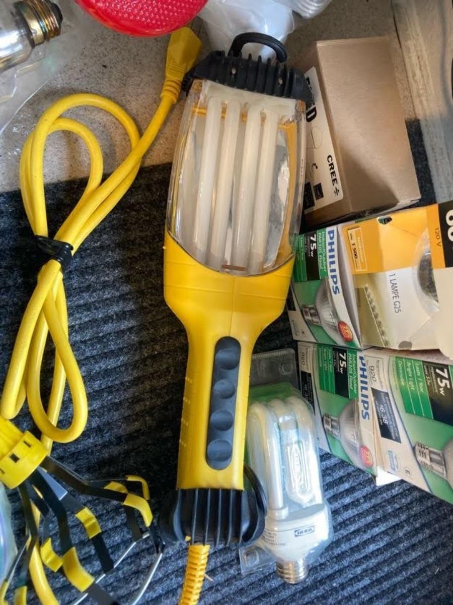 VARIETY OF LIGHT BULBS, REACH CEILING BULB CHANGER, AND A WORK LIGHT