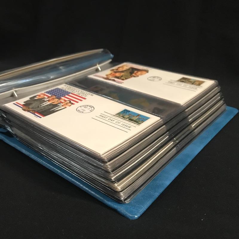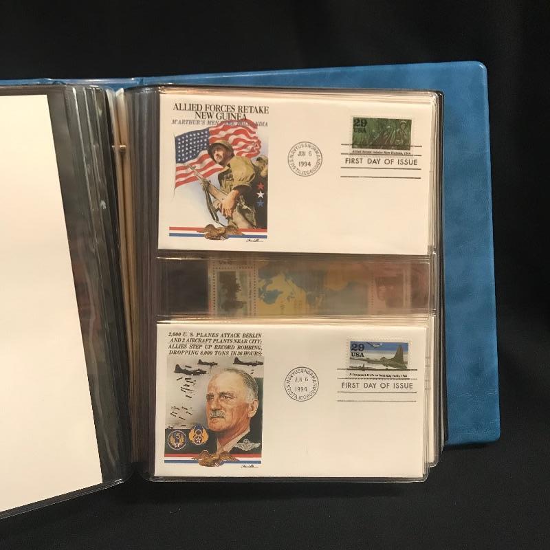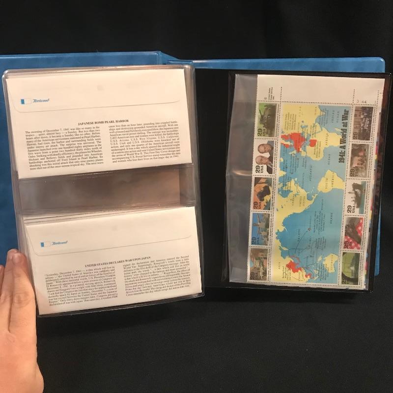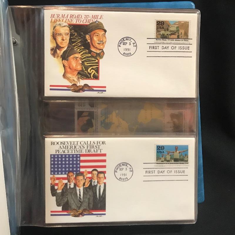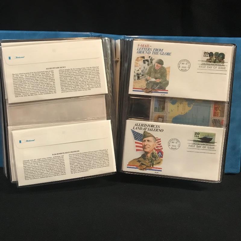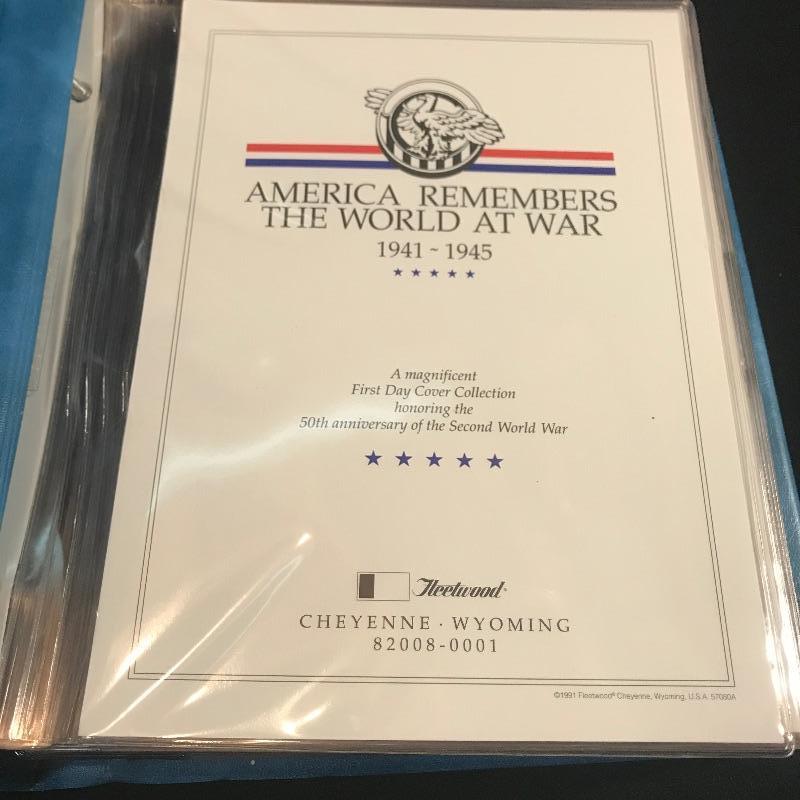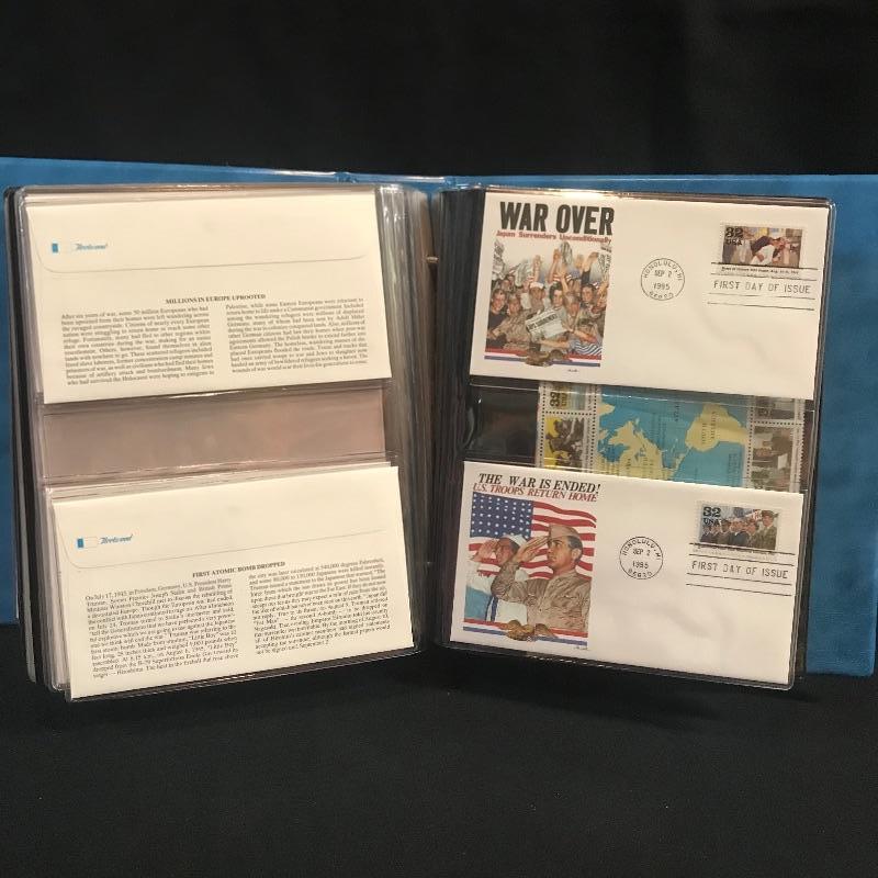 Fifty cancelled first day cachet covers and five sheets commemorating years 1941-45. All stamps appear to be 29¢ and from the mid-1990s. Each 10pc set of years is complete with history page.