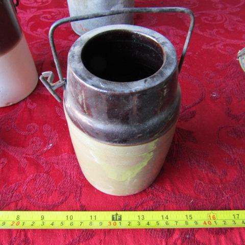 2 GREEN INSULATORS, OLD HINGED TIN BOX, BRASS PICTURE HANGERS, 2 TINY COMPASSES, 2 PIECE LEATHER CONTAINER (HAS WATER MARKS) ANTIQUE GALVANIZED KEROSENE CONTAINER AND MORE