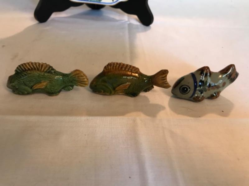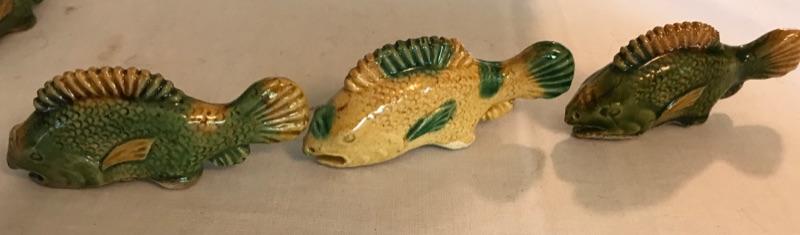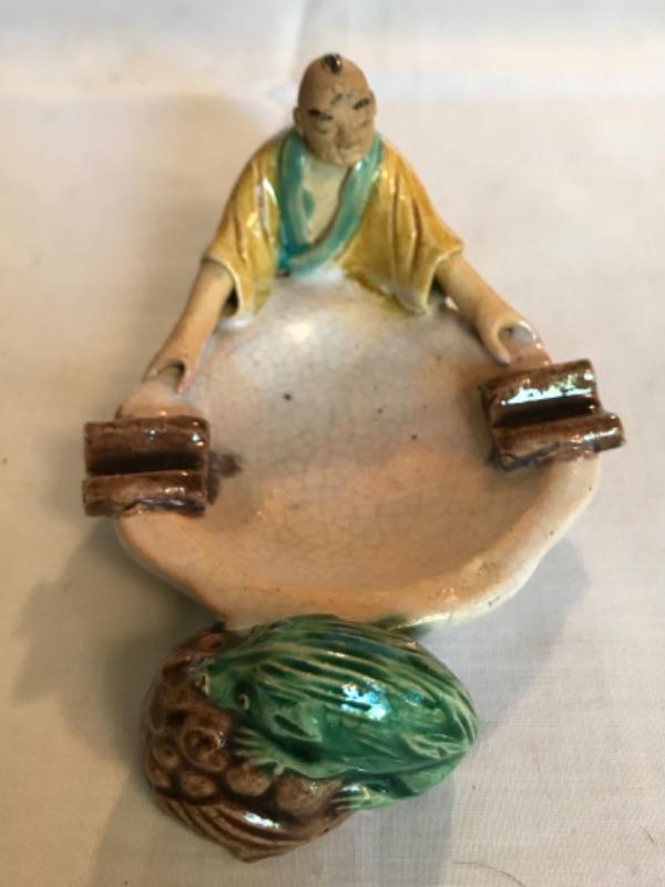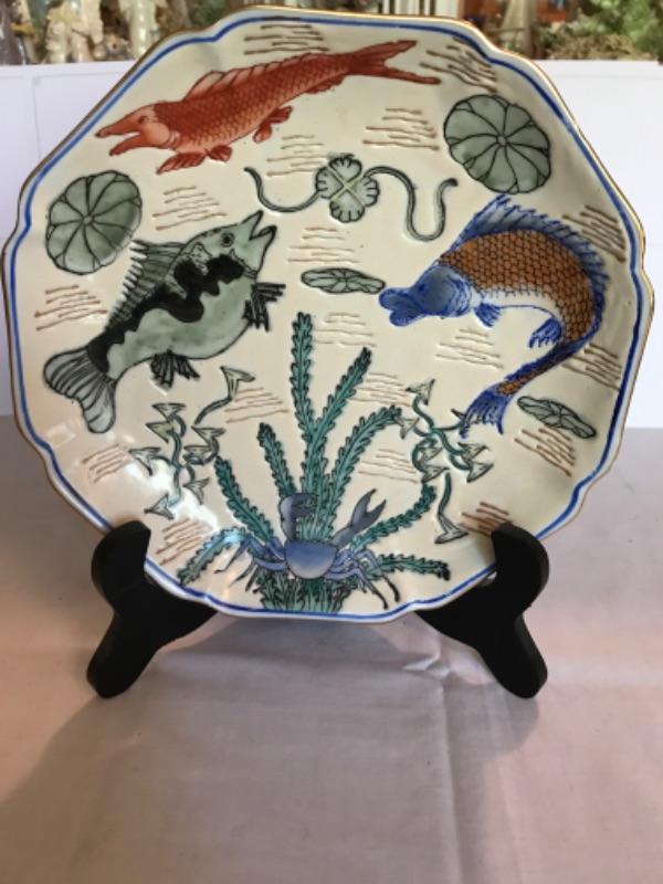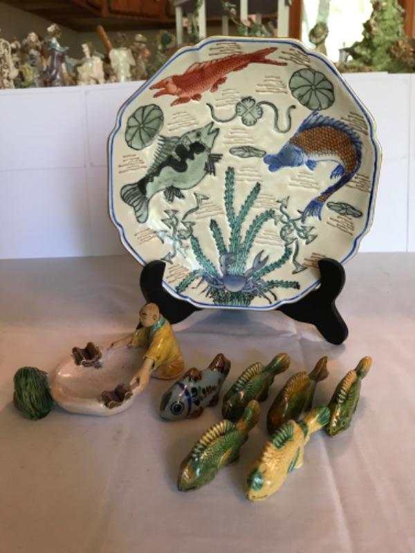 Asian fish plate 8-1/2”. Six small fish all stamped China. Chinese man with fishing net ashtray
