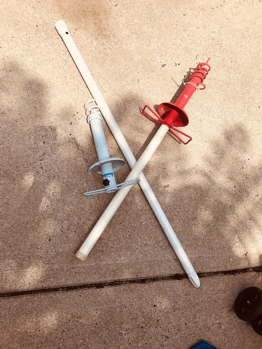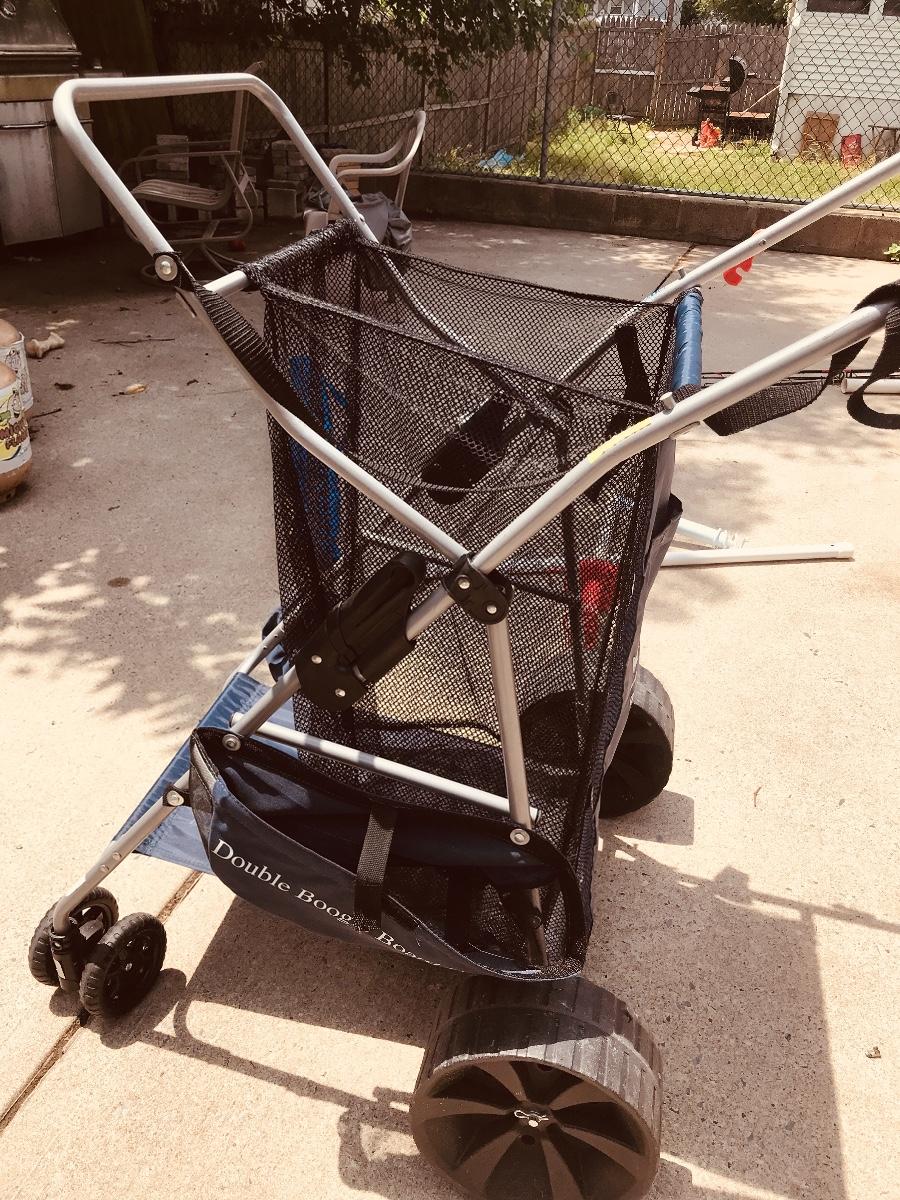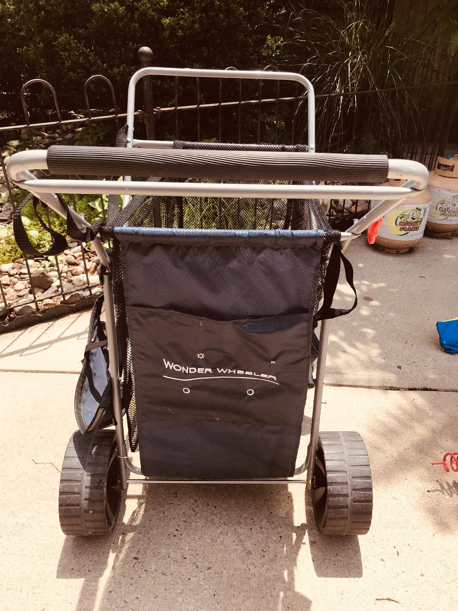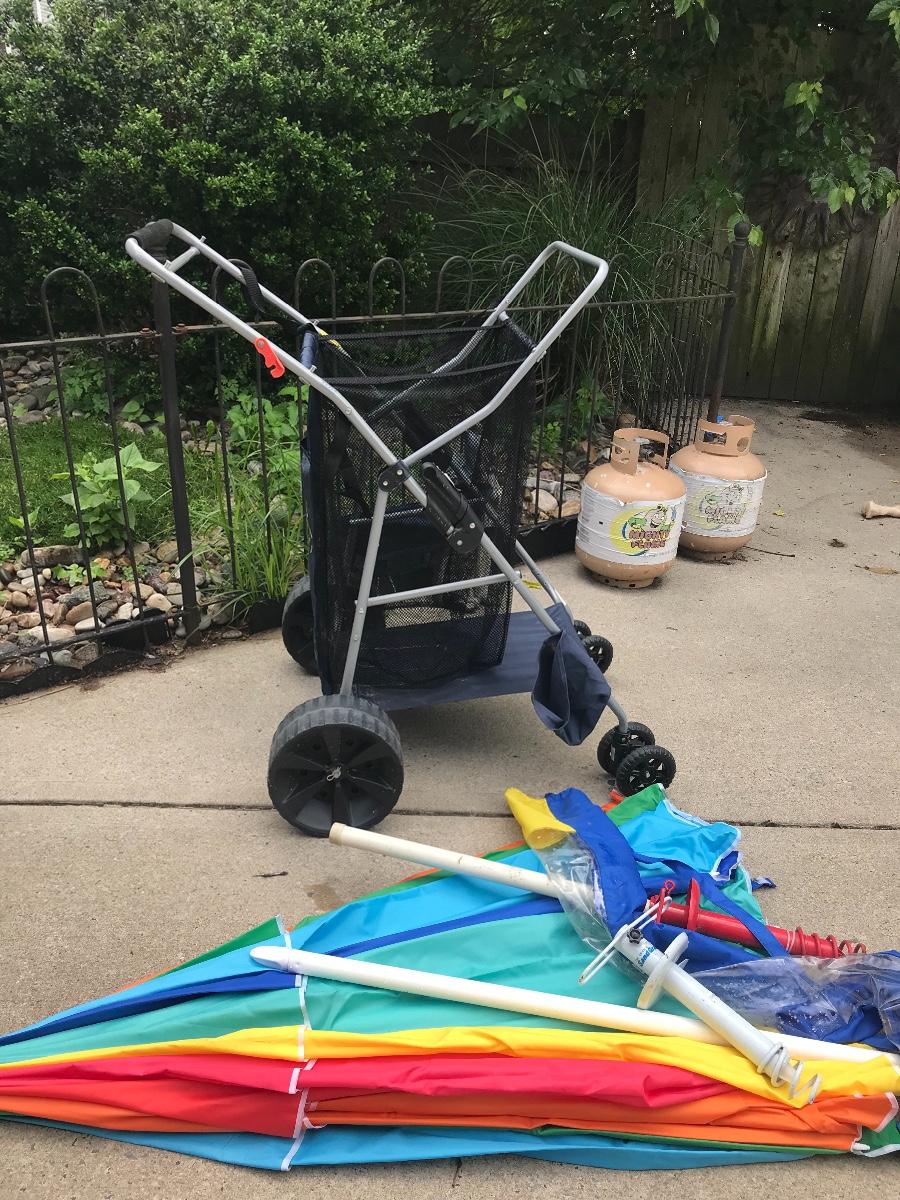 Beach umbrella with corkscrew holders, and a beach cart that can carry the umbrella and everything else you need for a day at the beach. Please see all pictures for content of the lot, condition of the lot, and measurements if taken. Pictures are the best representation of the items listed and items are untested unless indicated in description. Thank you for looking and have fun bidding!