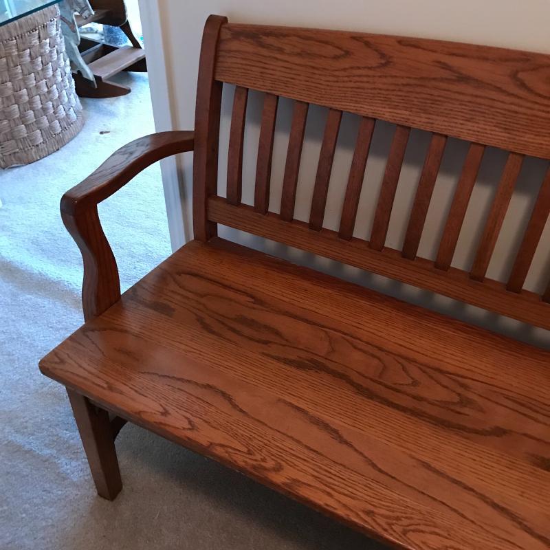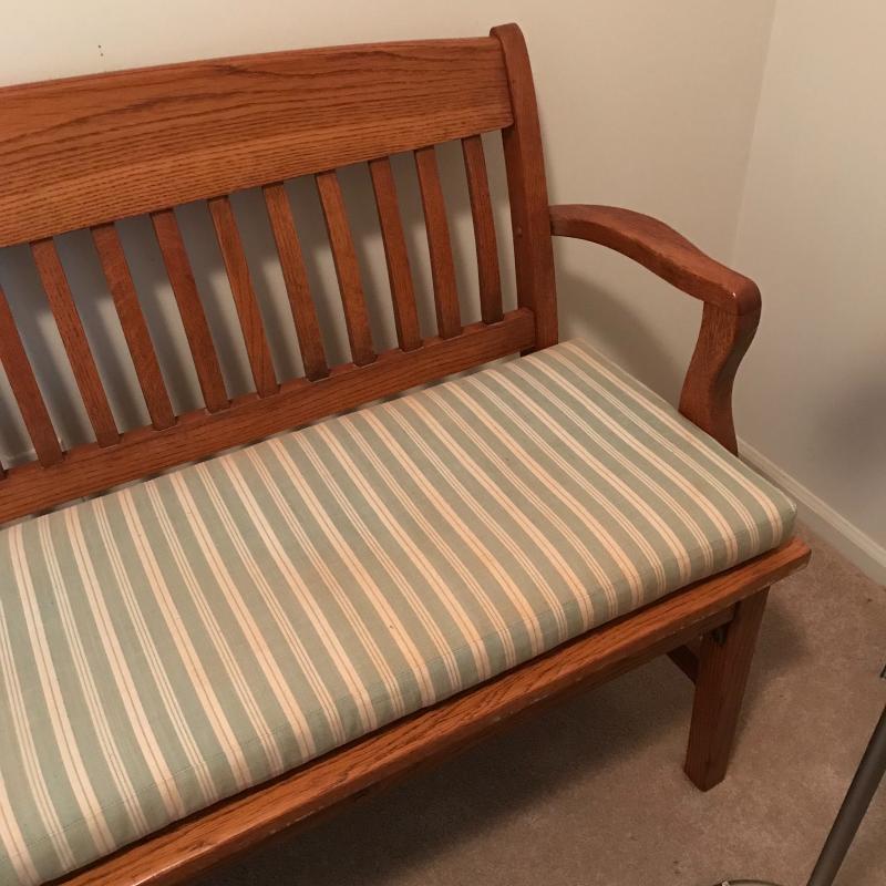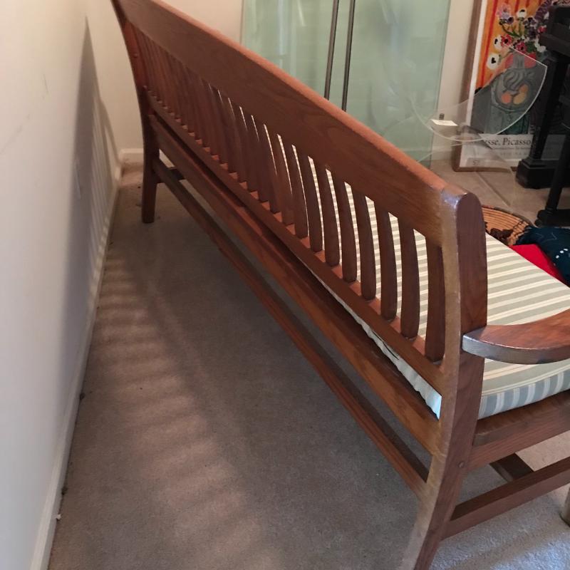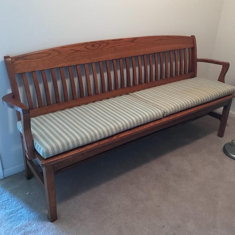 This beautiful, long wooden bench with cushions is very solid and in great shape appears to be oak. Approx. 77”l x 22”w x 36”h.
