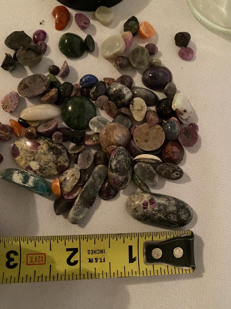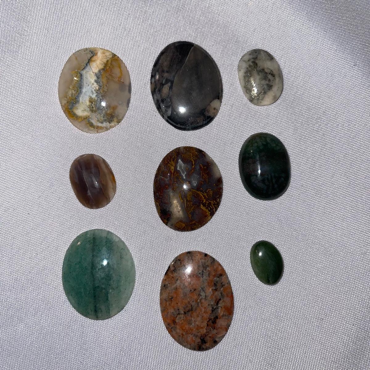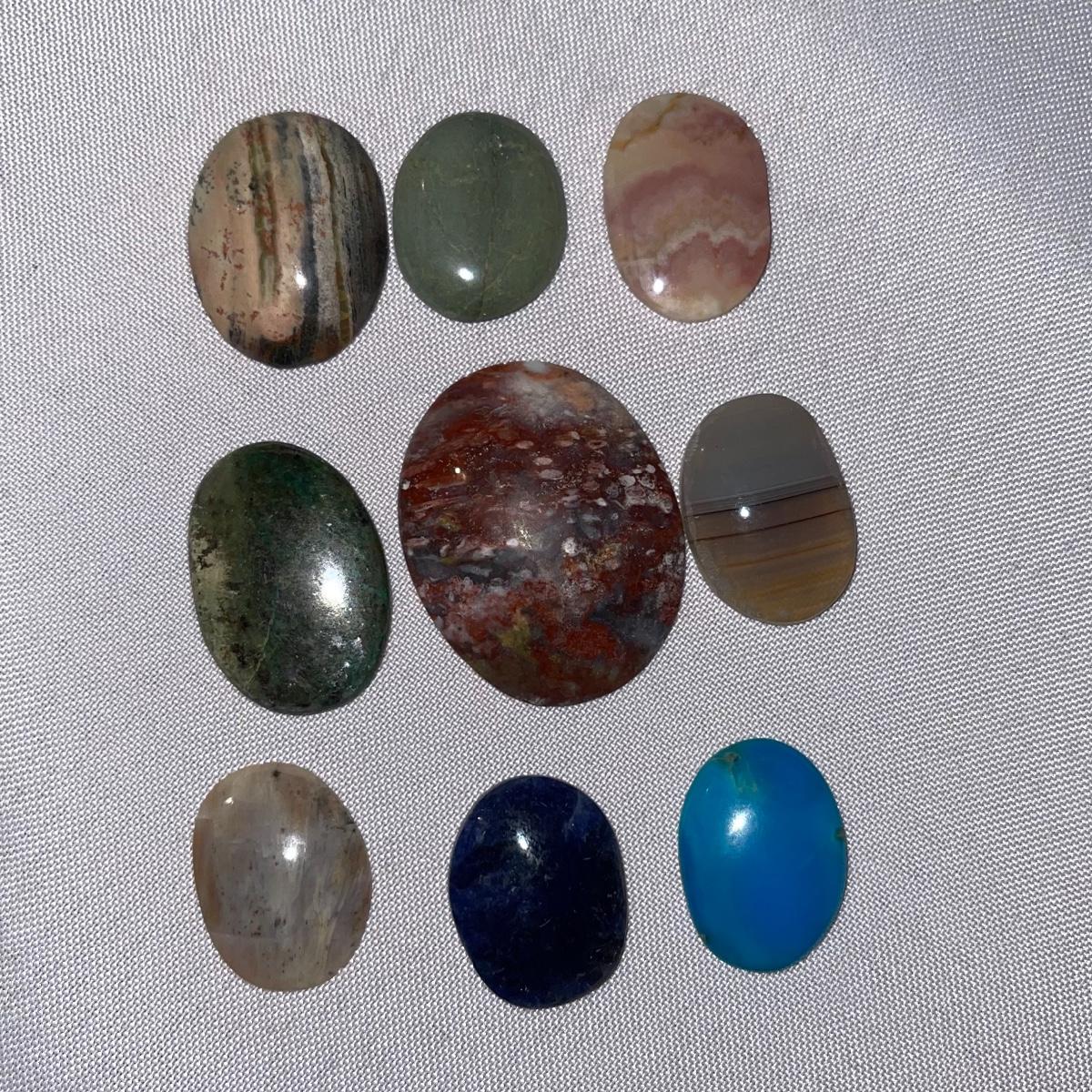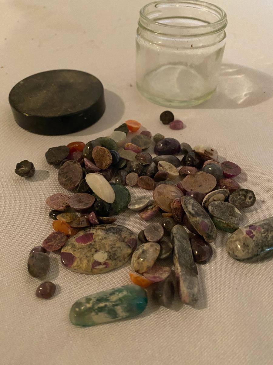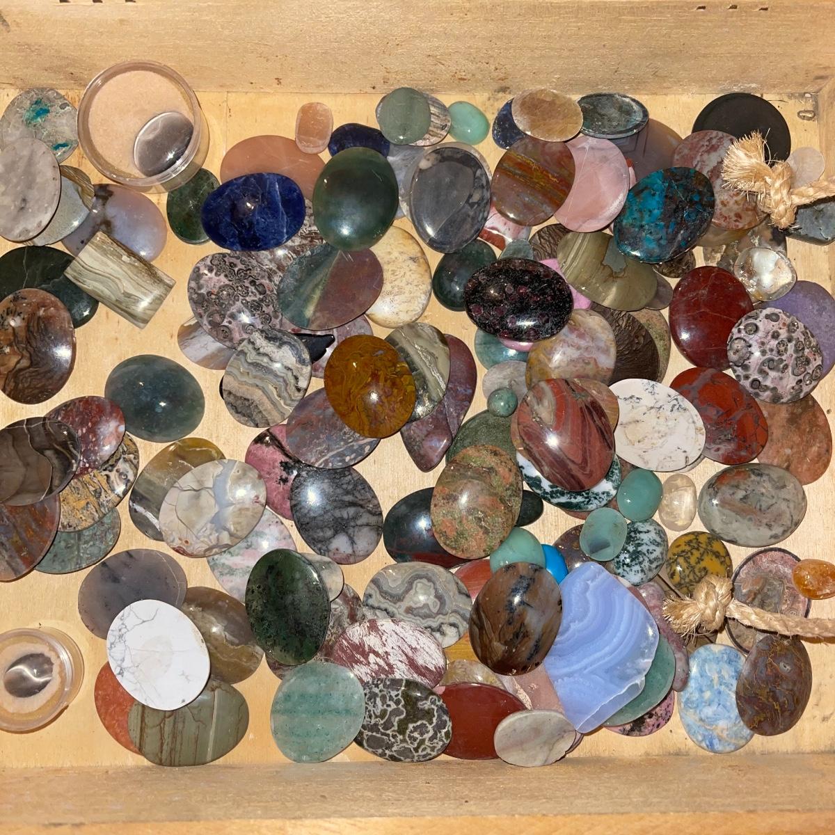 This large assortment of cabochons are ready to be used for jewelry, any crafting, or decor. There is a wide variety of types of stones, size, and color. Almost all are ovular shaped with a few exceptions. They have a convex obverse with a flat reverse, as cabochons do, the flat side not being as polished as the curved. There is also a small glass jar full of mini cabechons. Huge variety of shapes and colors here.