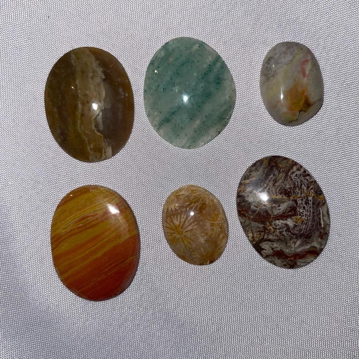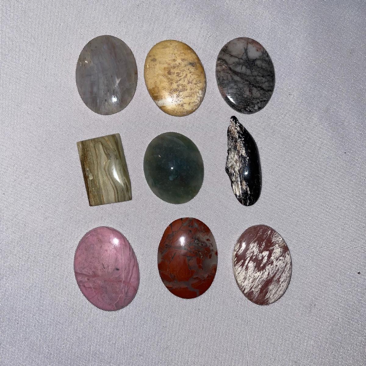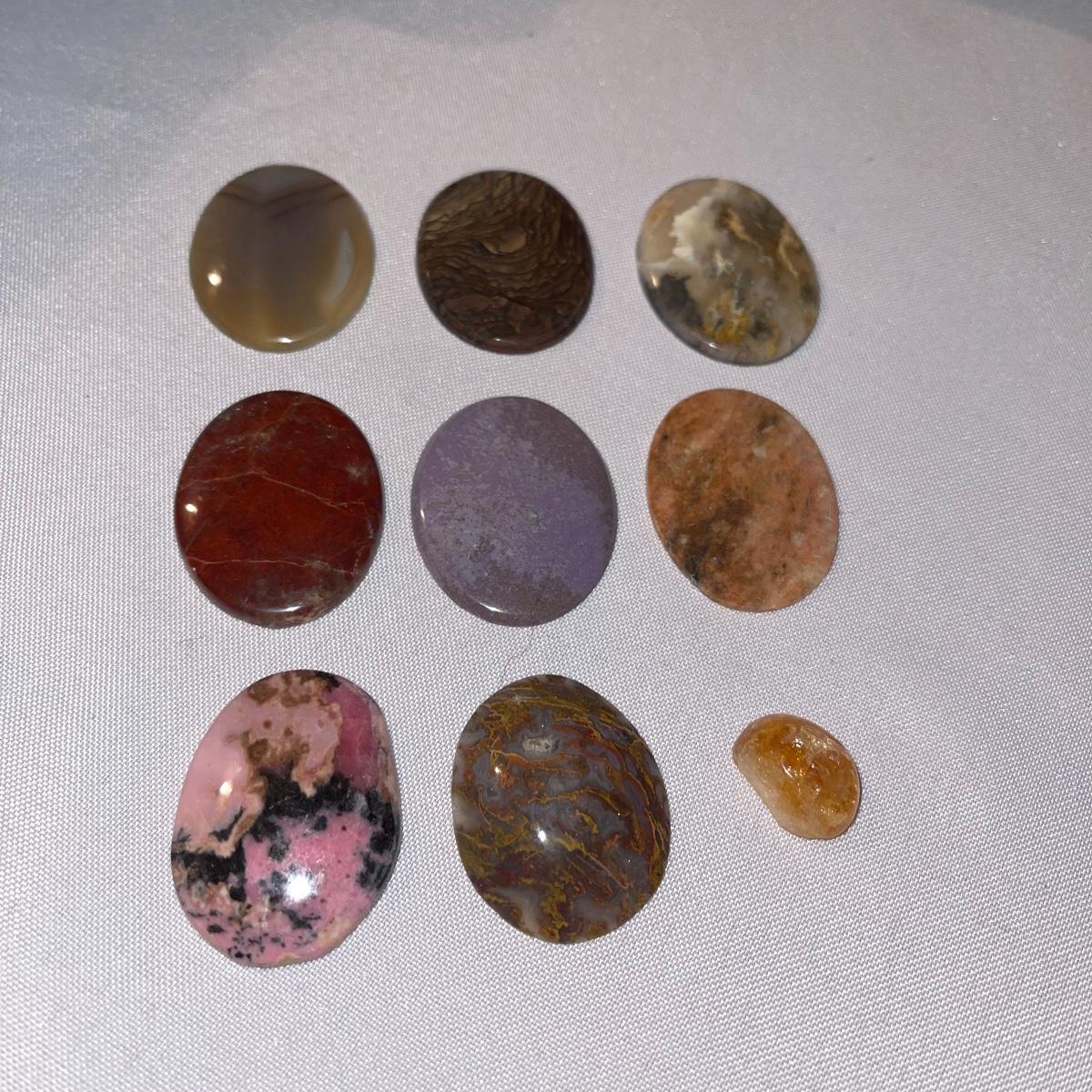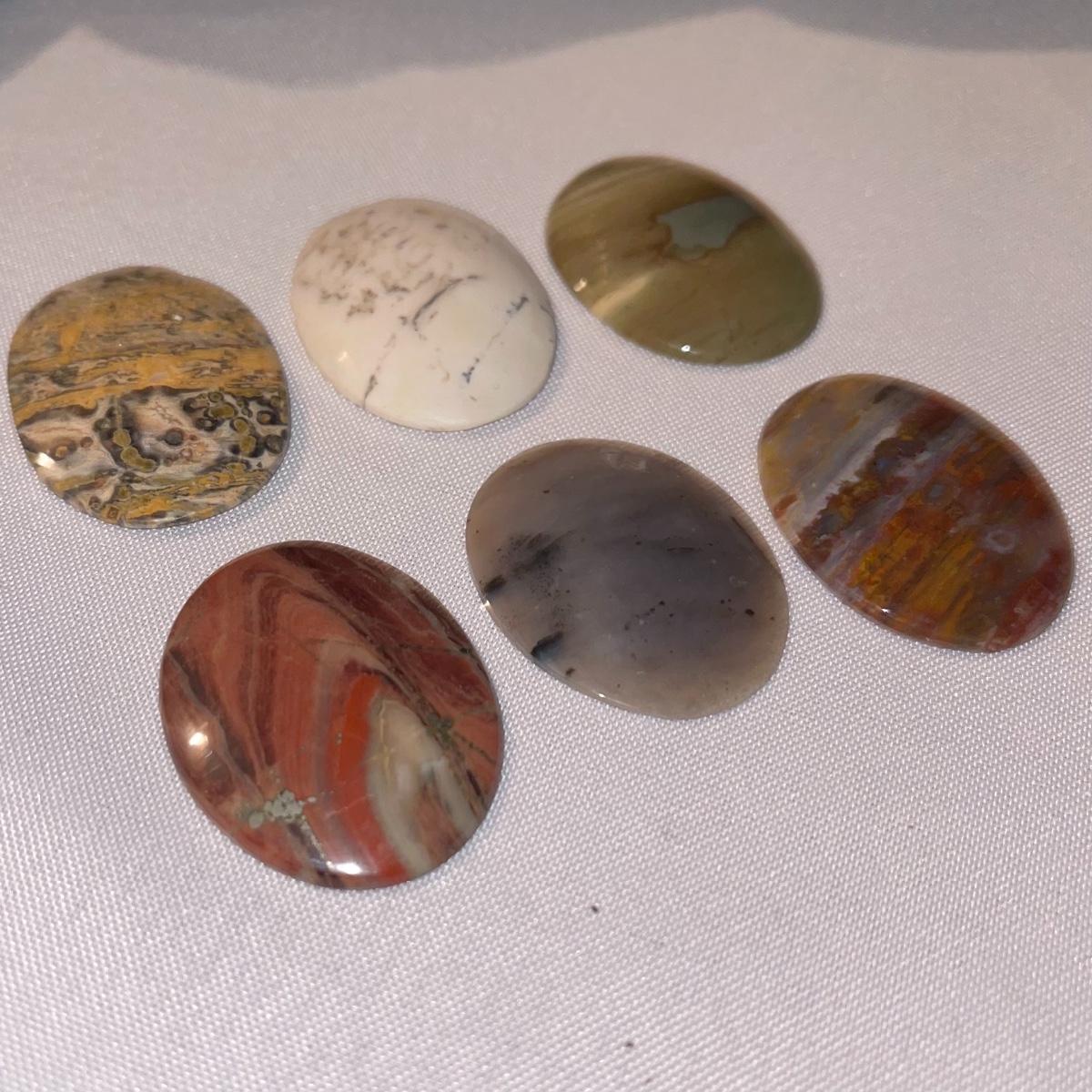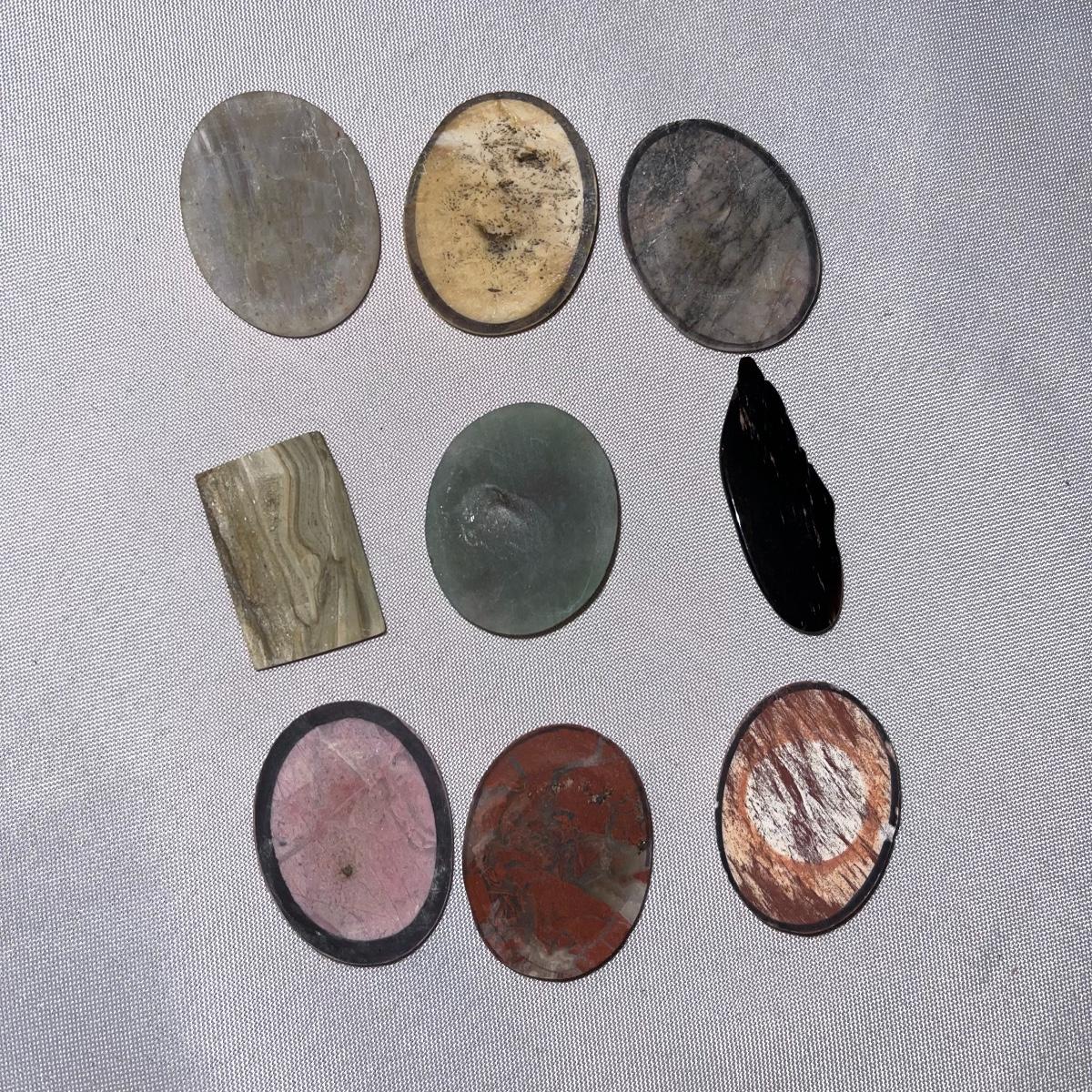 This large assortment of cabochons are ready to be used for jewelry, any crafting, or decor. There is a wide variety of types of stones, size, and color. Almost all are ovular shaped with a few exceptions. They have a convex obverse with a flat reverse, as cabochons do, the flat side not being as polished as the curved. There is also a small glass jar full of mini cabechons. Huge variety of shapes and colors here.
