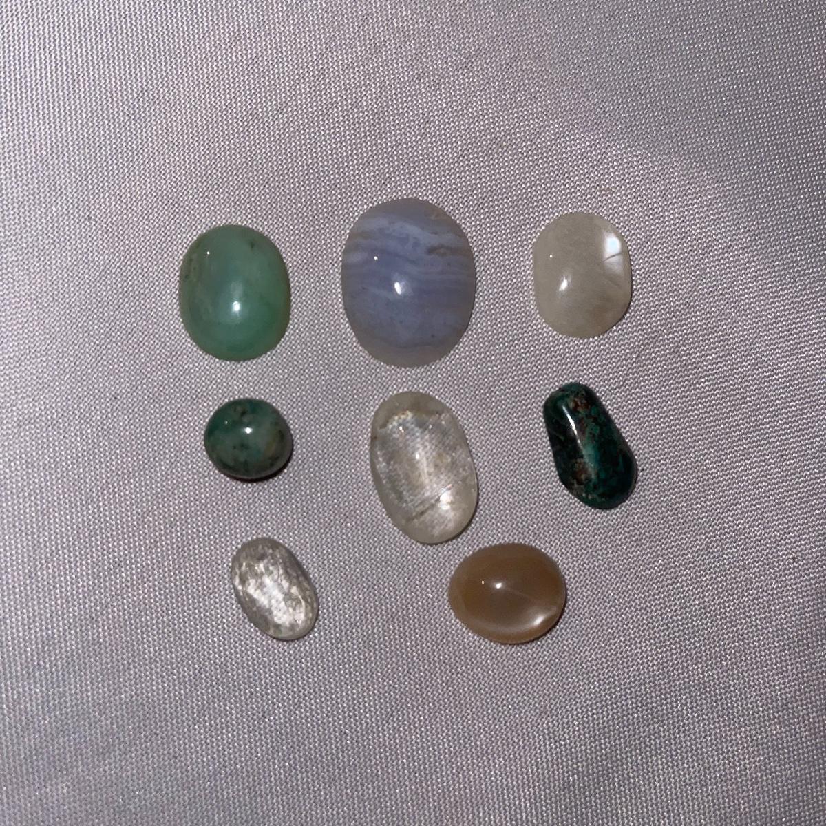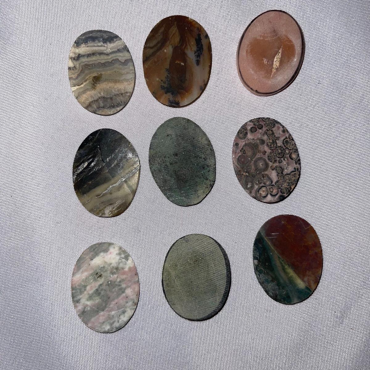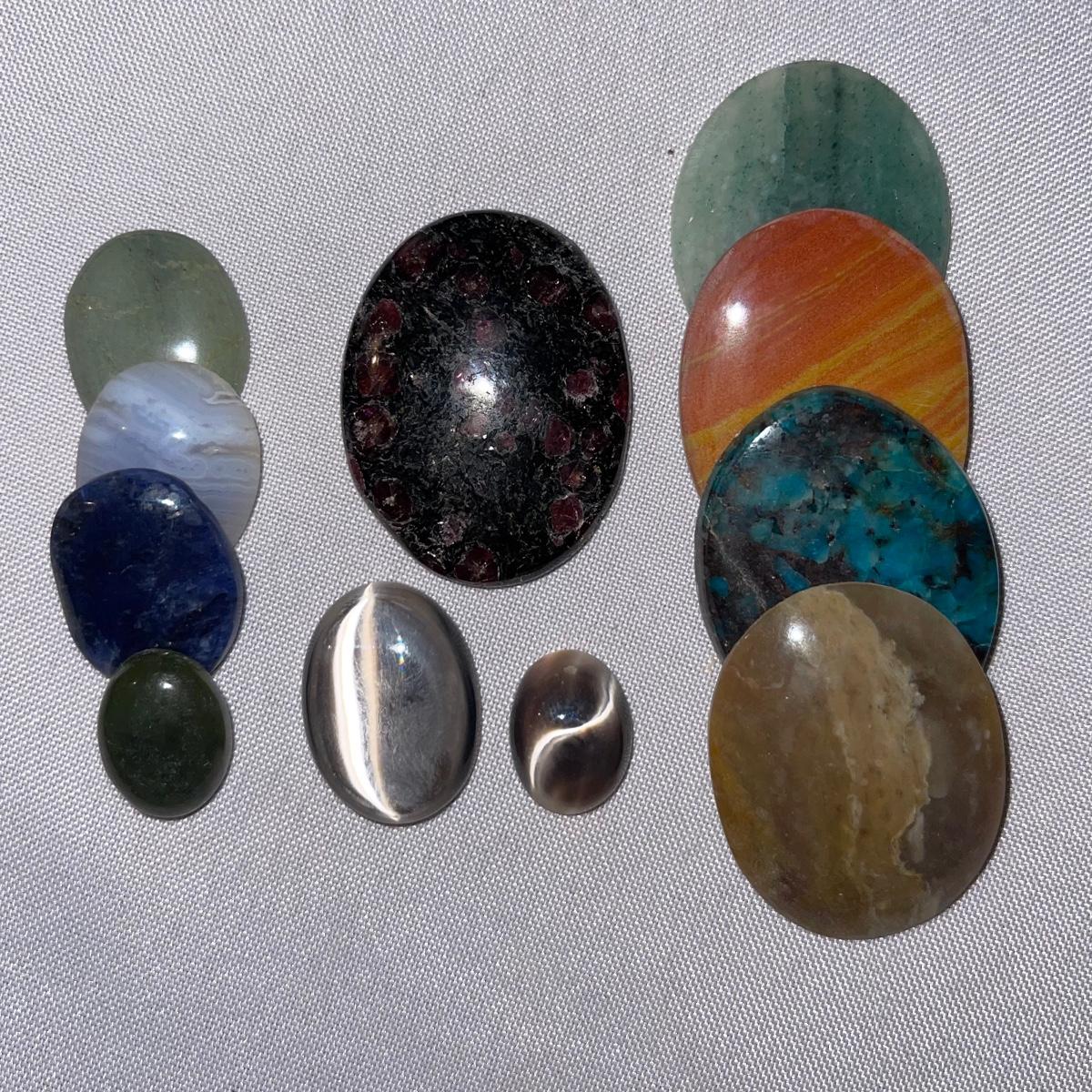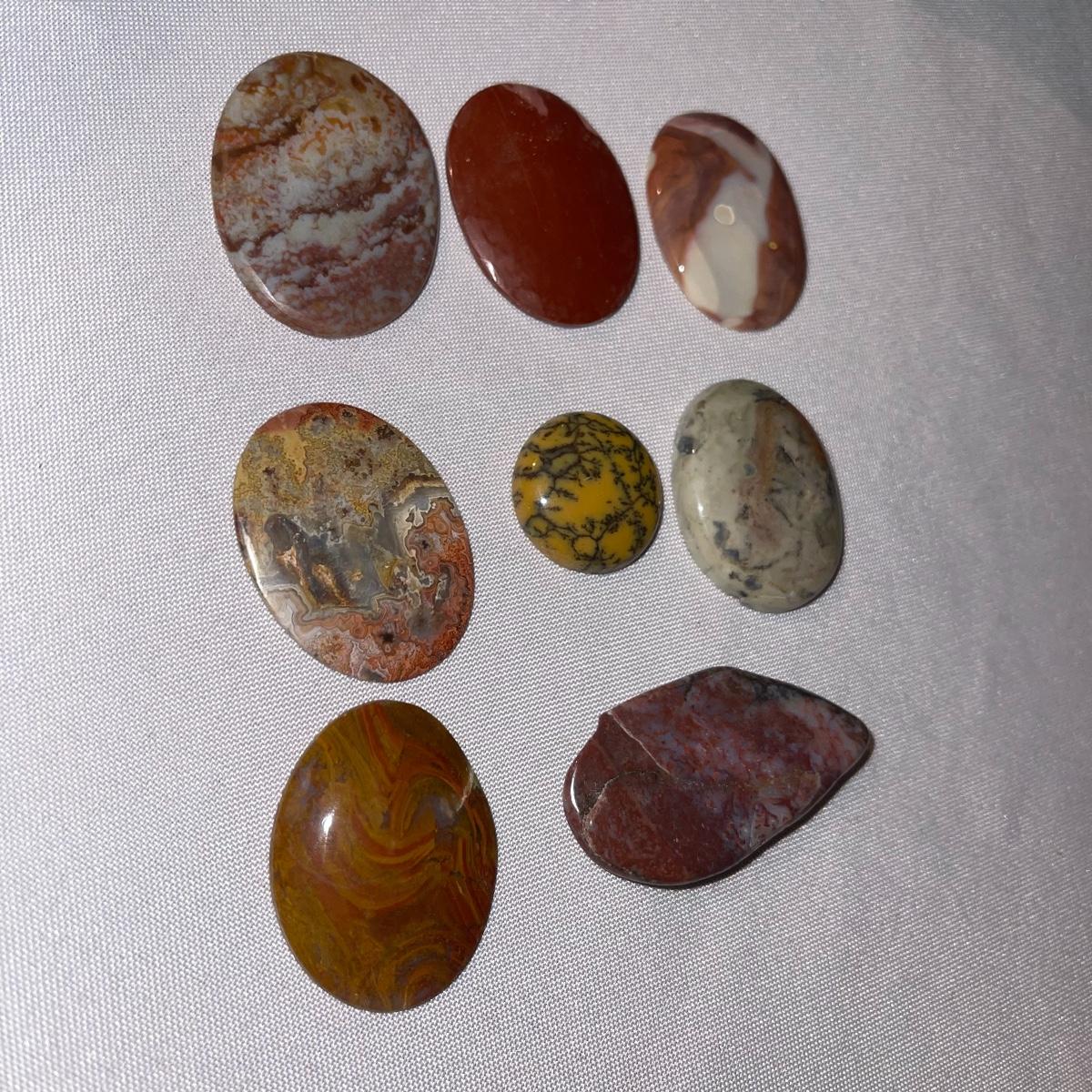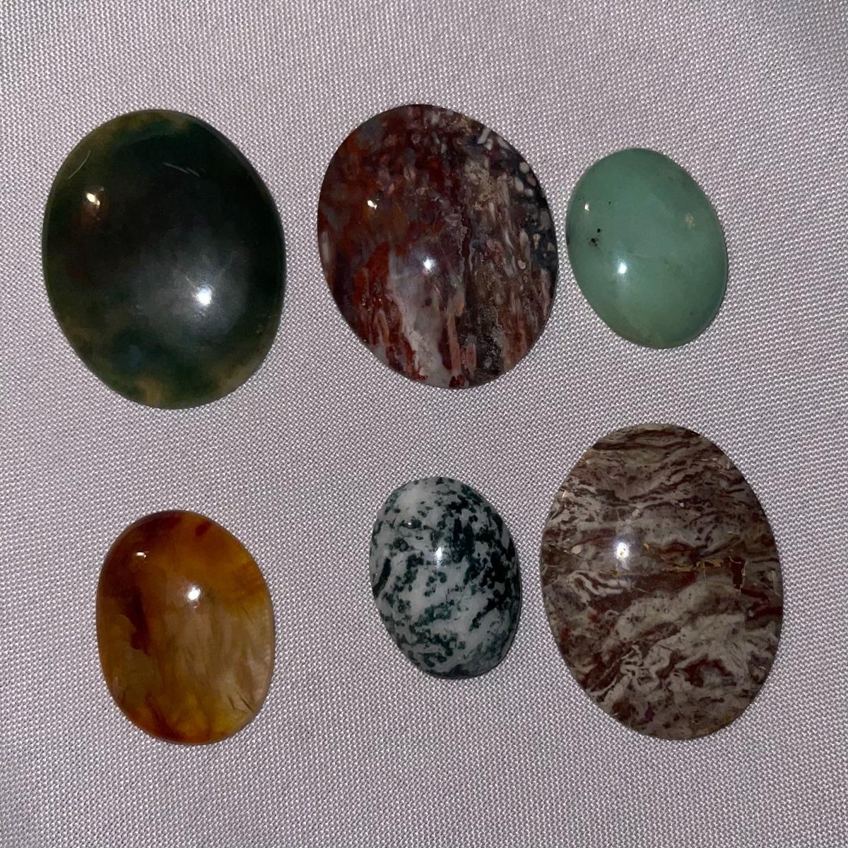 This large assortment of cabochons are ready to be used for jewelry, any crafting, or decor. There is a wide variety of types of stones, size, and color. Almost all are ovular shaped with a few exceptions. They have a convex obverse with a flat reverse, as cabochons do, the flat side not being as polished as the curved. There is also a small glass jar full of mini cabechons. Huge variety of shapes and colors here.