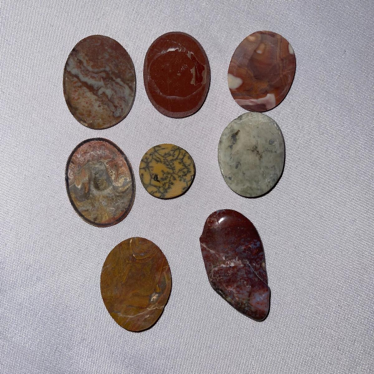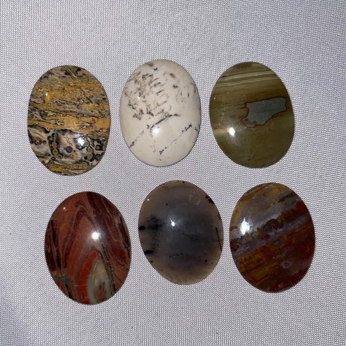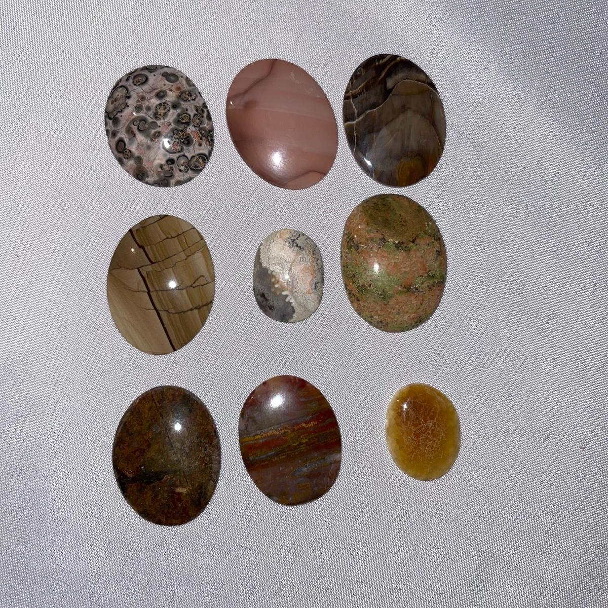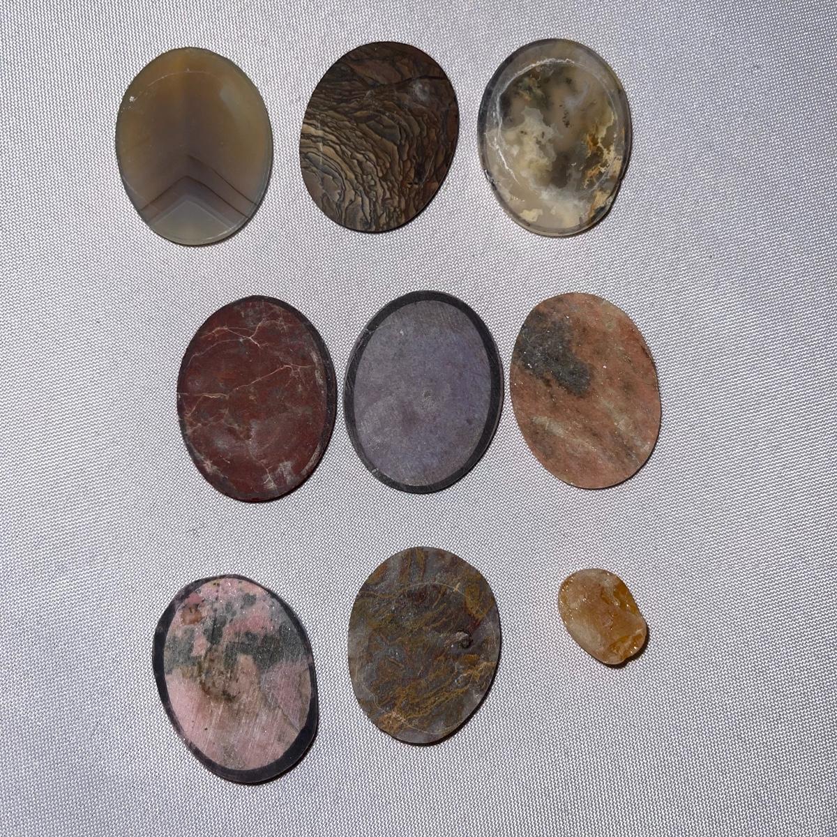 This large assortment of cabochons are ready to be used for jewelry, any crafting, or decor. There is a wide variety of types of stones, size, and color. Almost all are ovular shaped with a few exceptions. They have a convex obverse with a flat reverse, as cabochons do, the flat side not being as polished as the curved. There is also a small glass jar full of mini cabechons. Huge variety of shapes and colors here.