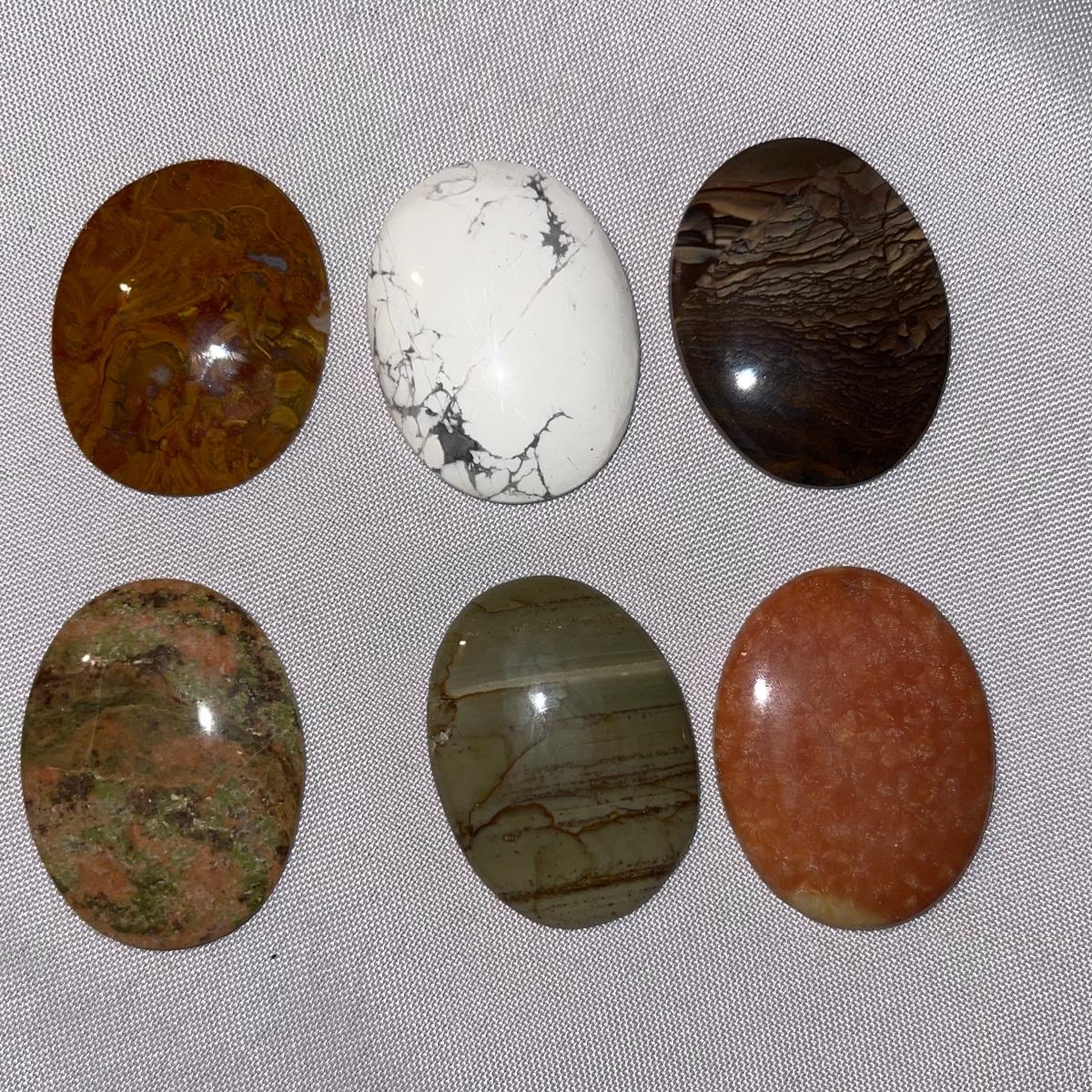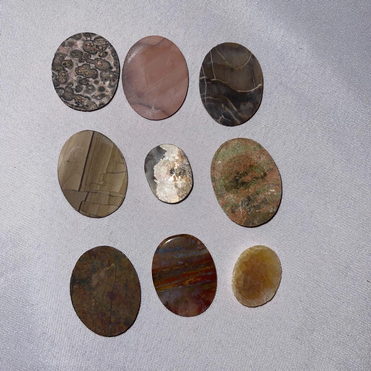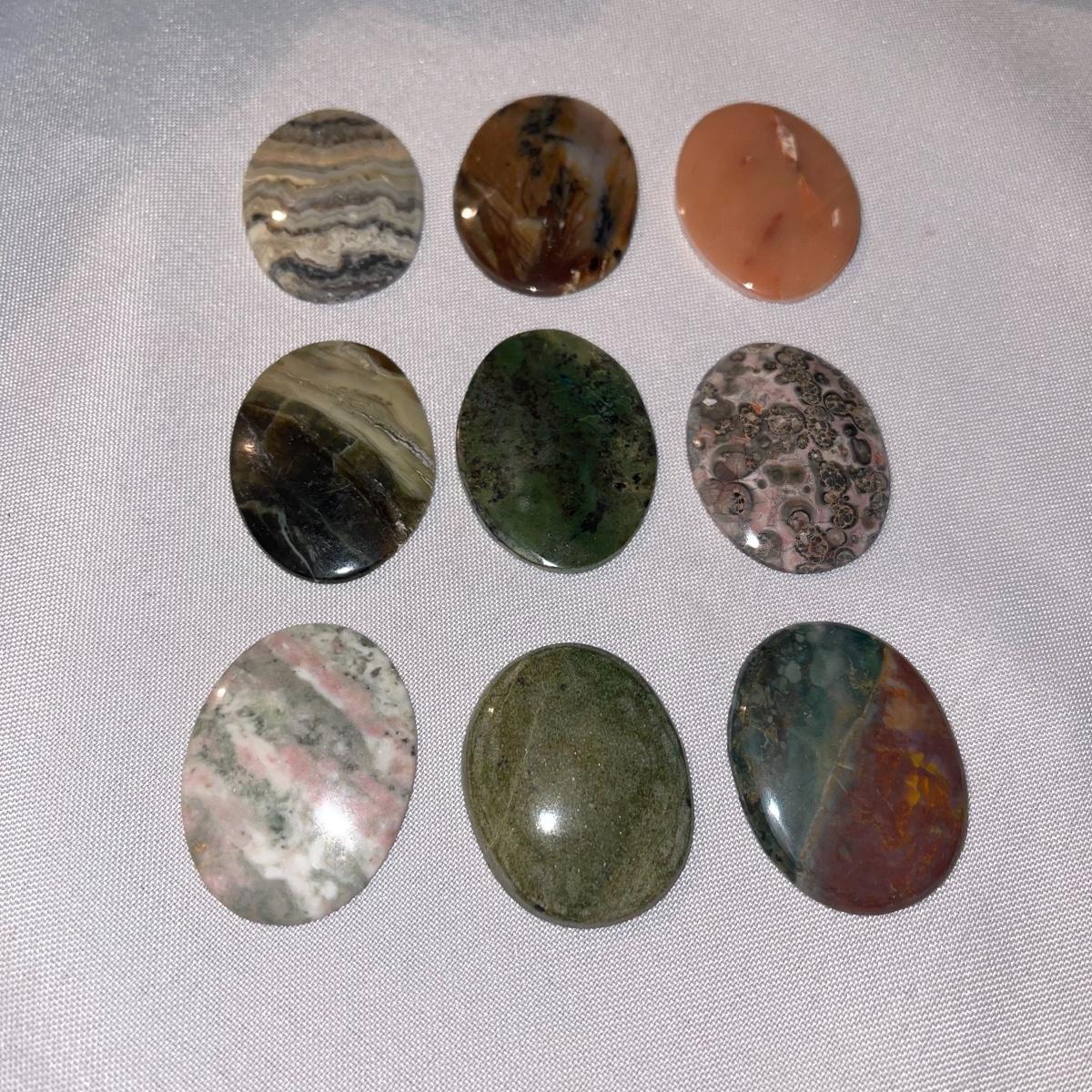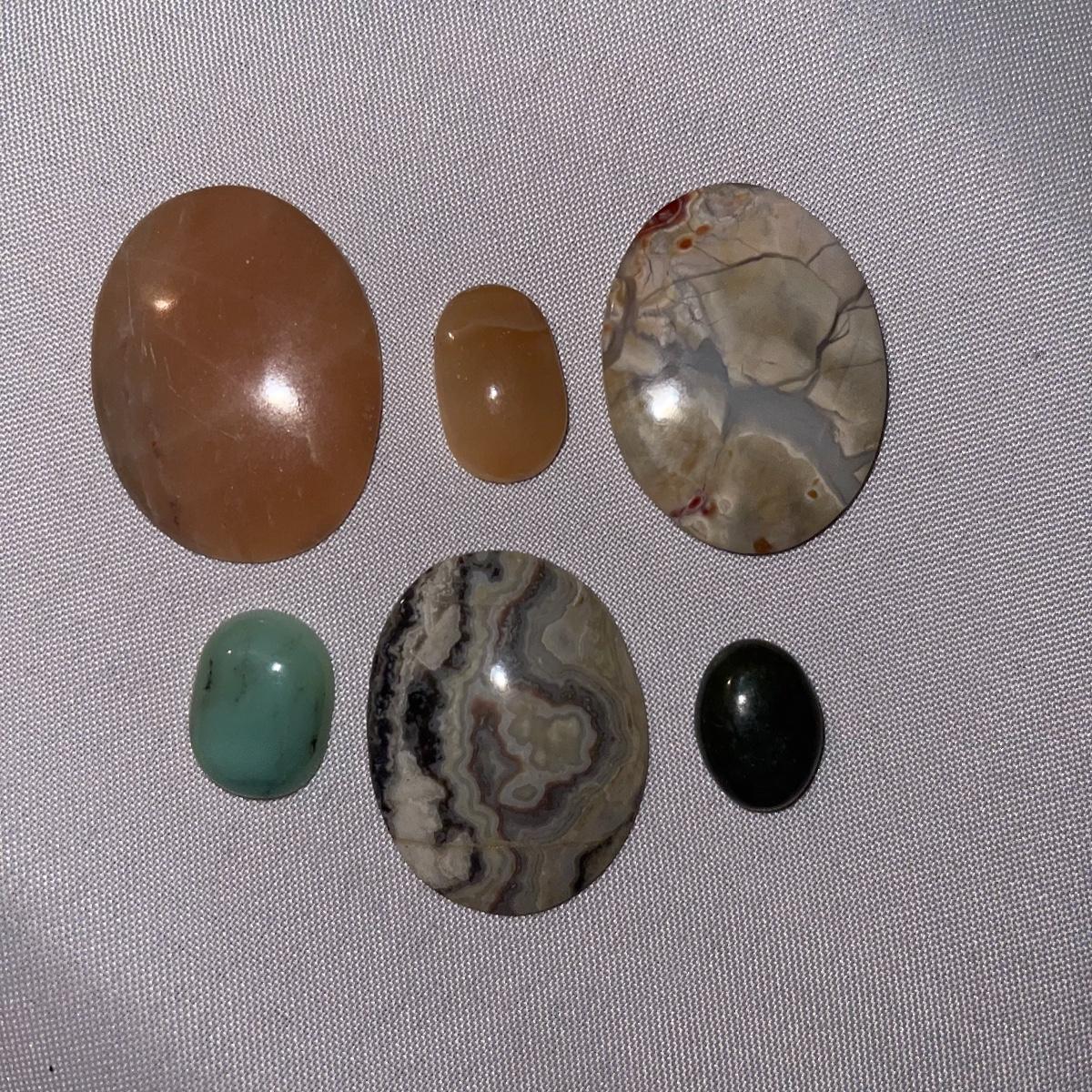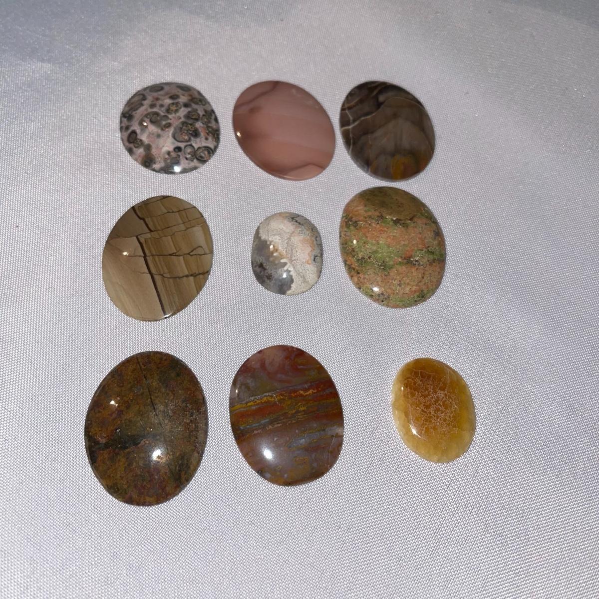 This large assortment of cabochons are ready to be used for jewelry, any crafting, or decor. There is a wide variety of types of stones, size, and color. Almost all are ovular shaped with a few exceptions. They have a convex obverse with a flat reverse, as cabochons do, the flat side not being as polished as the curved. There is also a small glass jar full of mini cabechons. Huge variety of shapes and colors here.