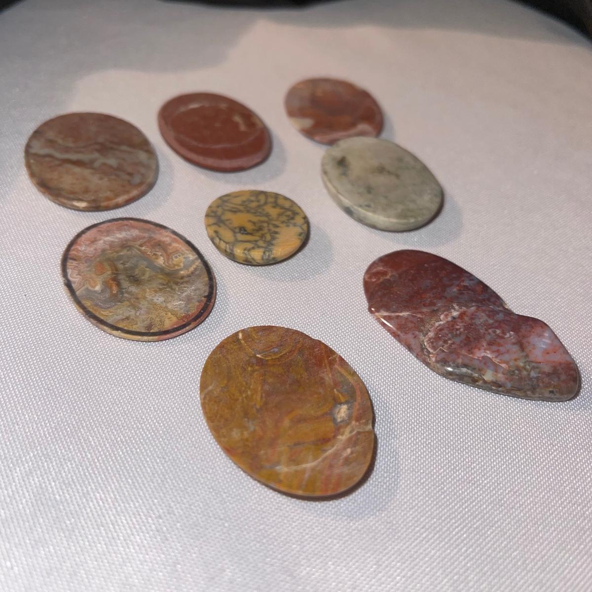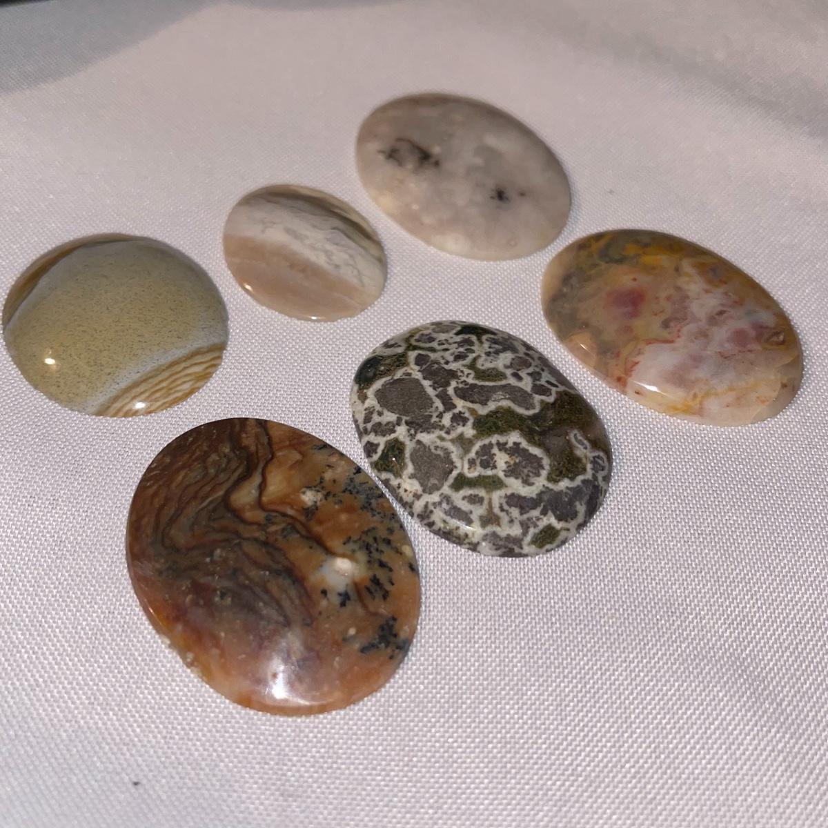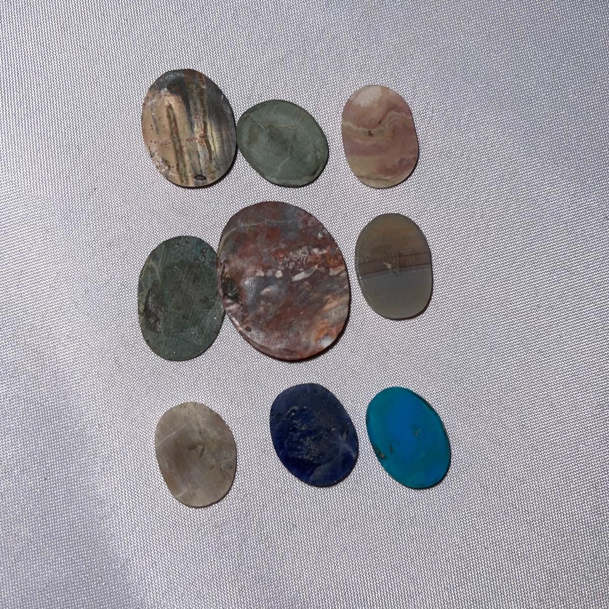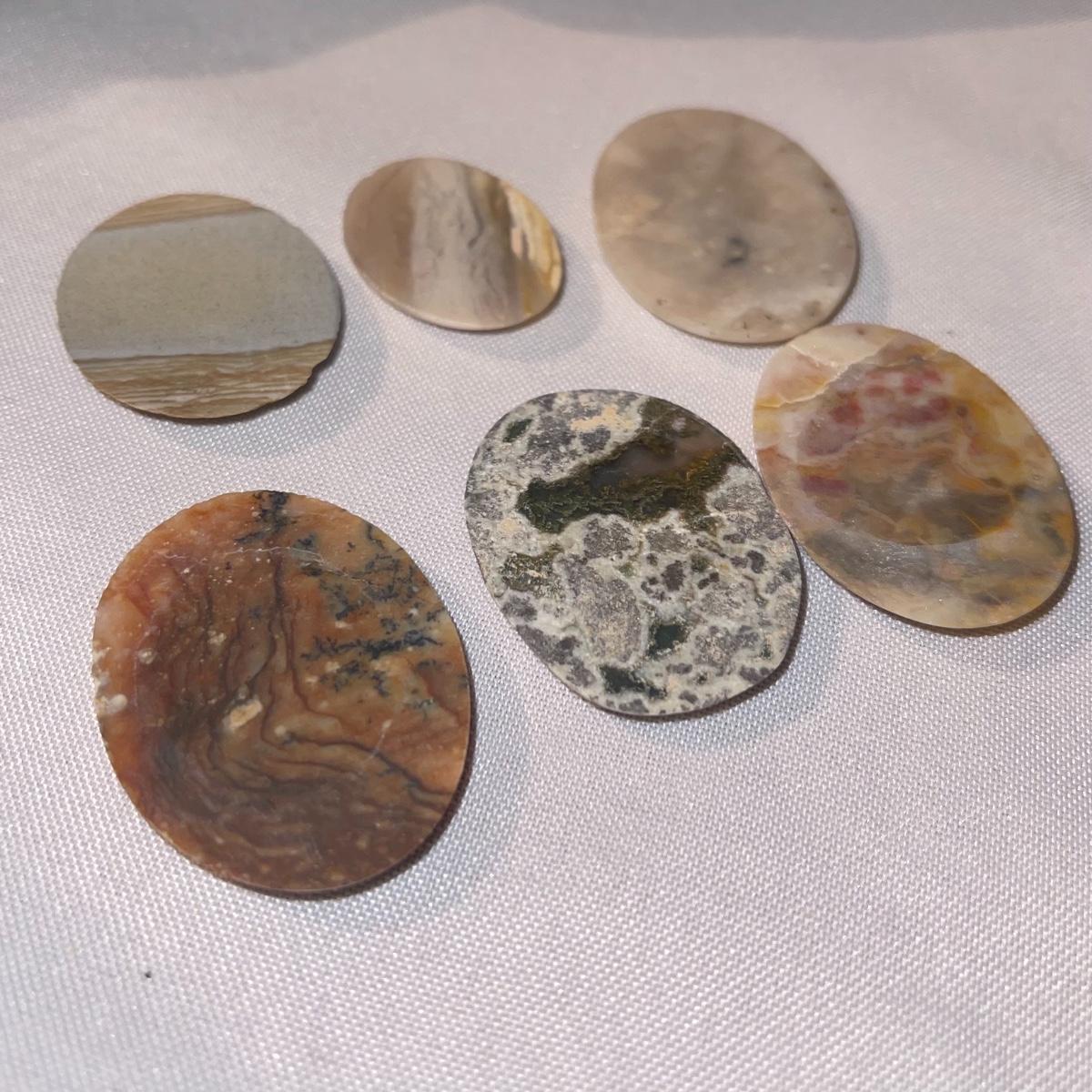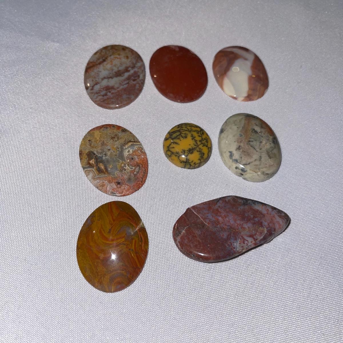 This large assortment of cabochons are ready to be used for jewelry, any crafting, or decor. There is a wide variety of types of stones, size, and color. Almost all are ovular shaped with a few exceptions. They have a convex obverse with a flat reverse, as cabochons do, the flat side not being as polished as the curved. There is also a small glass jar full of mini cabechons. Huge variety of shapes and colors here.