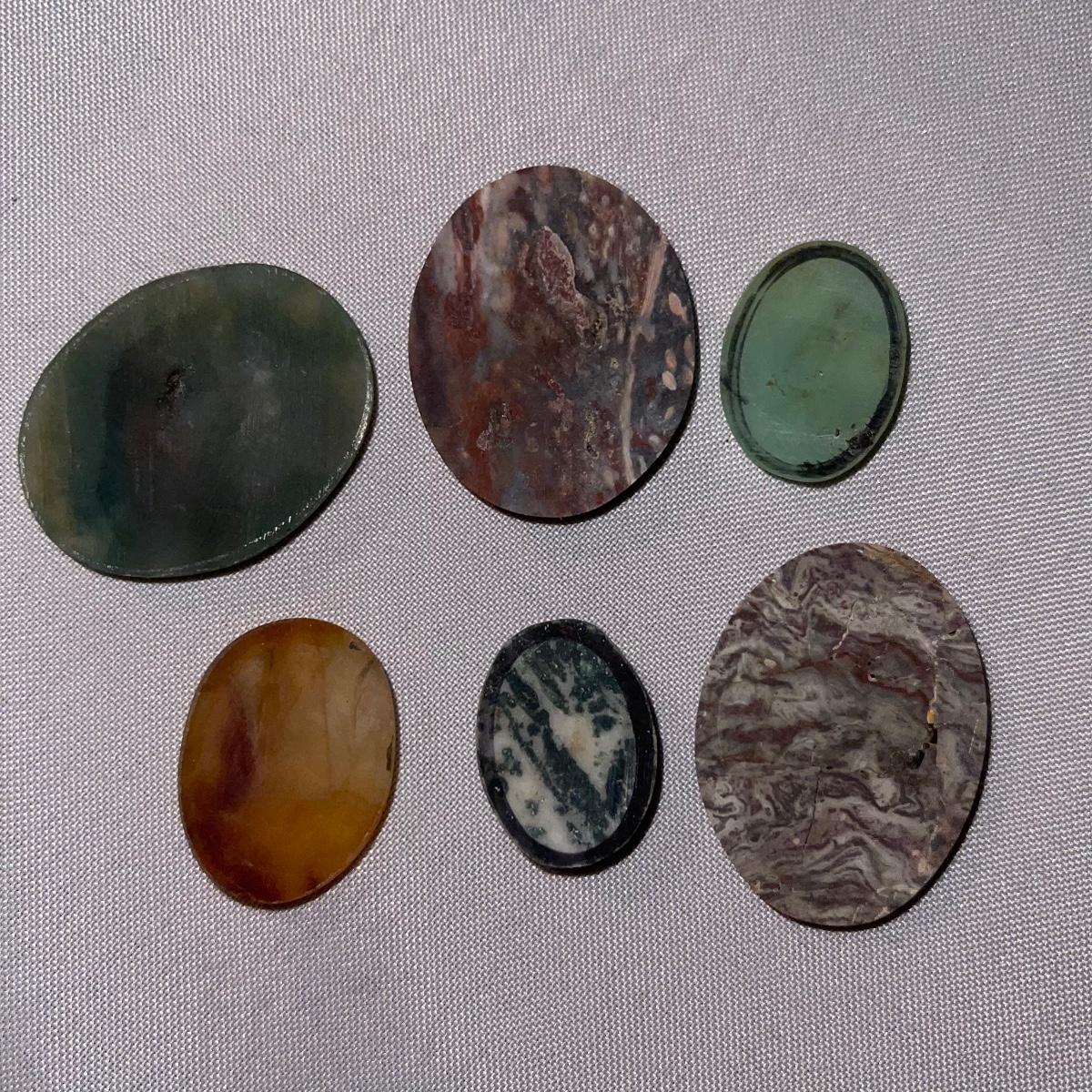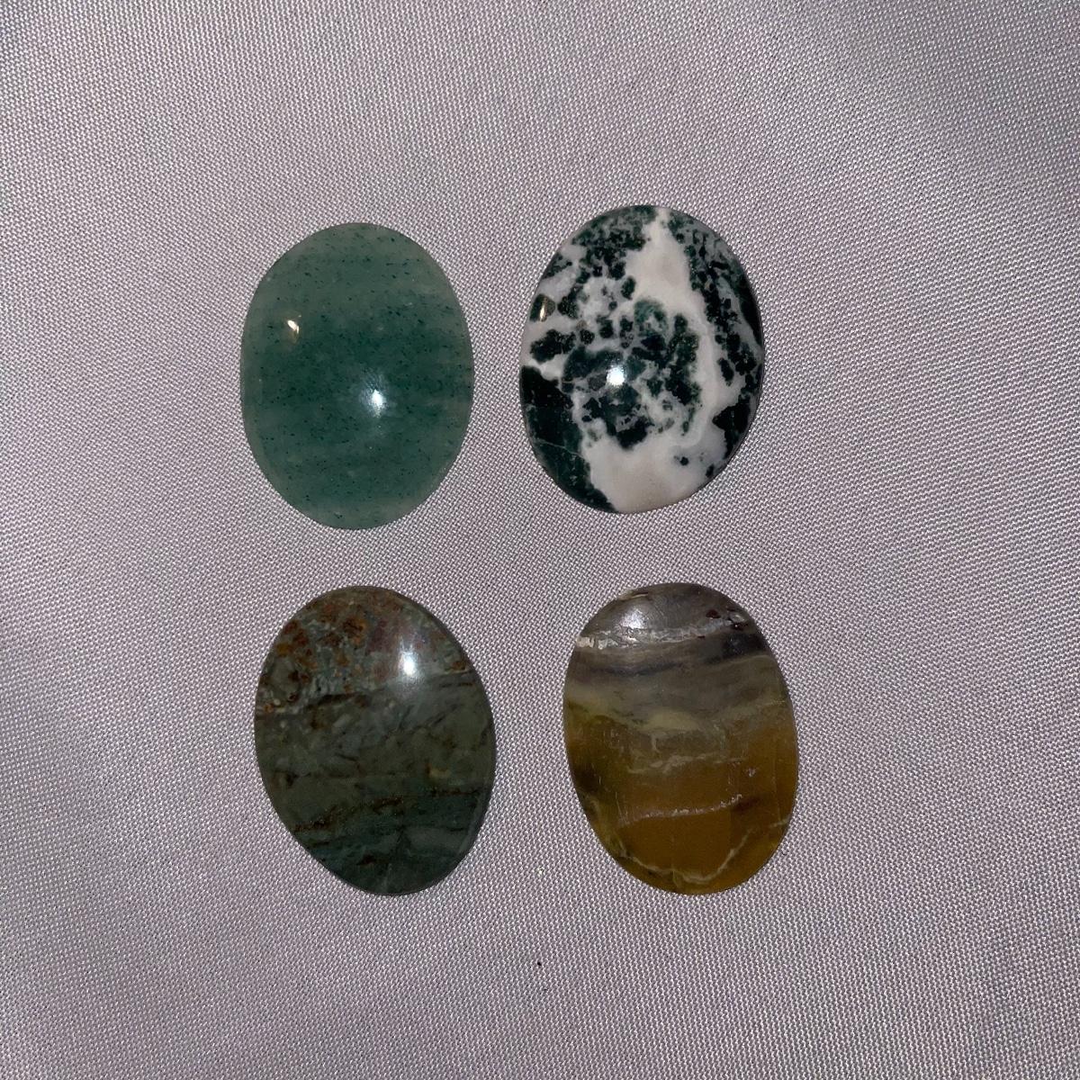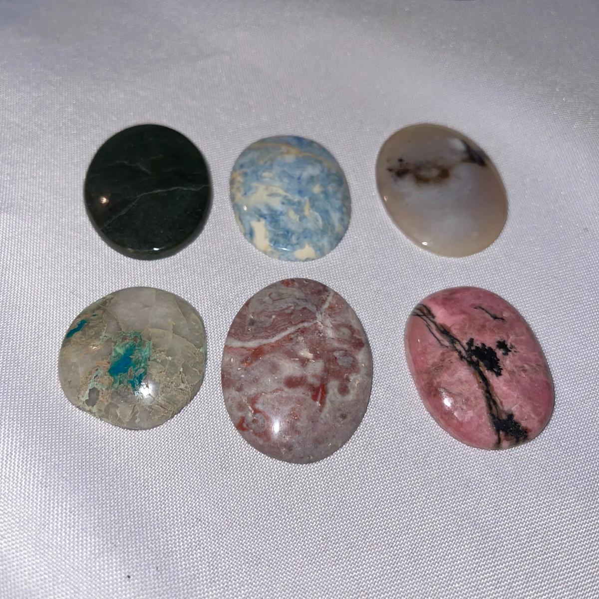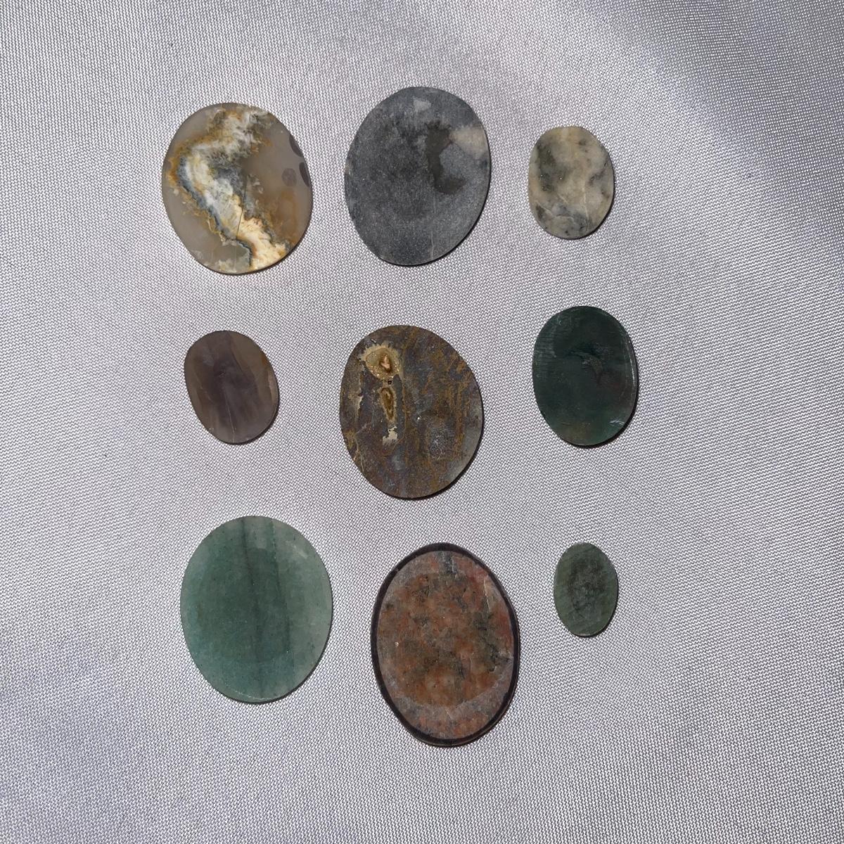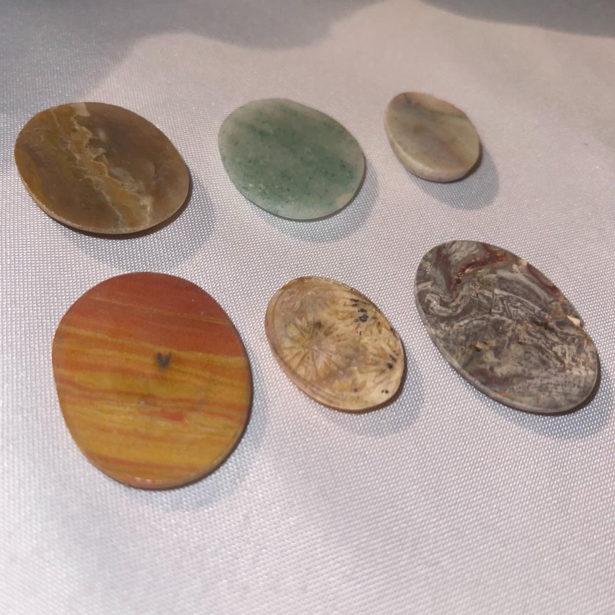 This large assortment of cabochons are ready to be used for jewelry, any crafting, or decor. There is a wide variety of types of stones, size, and color. Almost all are ovular shaped with a few exceptions. They have a convex obverse with a flat reverse, as cabochons do, the flat side not being as polished as the curved. There is also a small glass jar full of mini cabechons. Huge variety of shapes and colors here.